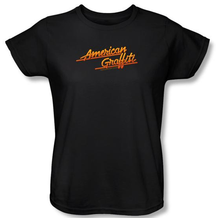 | | American Graffiti Ladies T-shirt Movie Neon Logo Black Tee ShirtThis American Graffiti Ladies Movie T-shirt Neon Logo Black Tee Shirt features title American Graffiti in sunset orange and red neon lights shining nostalgically against black velvet. This t shirt makes a fantastic gift and reminder for any fan of the 1973 coming of age comedy film American Graffiti written by George Lucas noted by Murphy of Variety as a vivid "recall of teenage attitudes and morals, told with outstanding empathy and compassion through an exceptionally talented cast of unknown actors. Available in Small, Medium, Large, XL, 2XL & 3XL Officially Licensed |