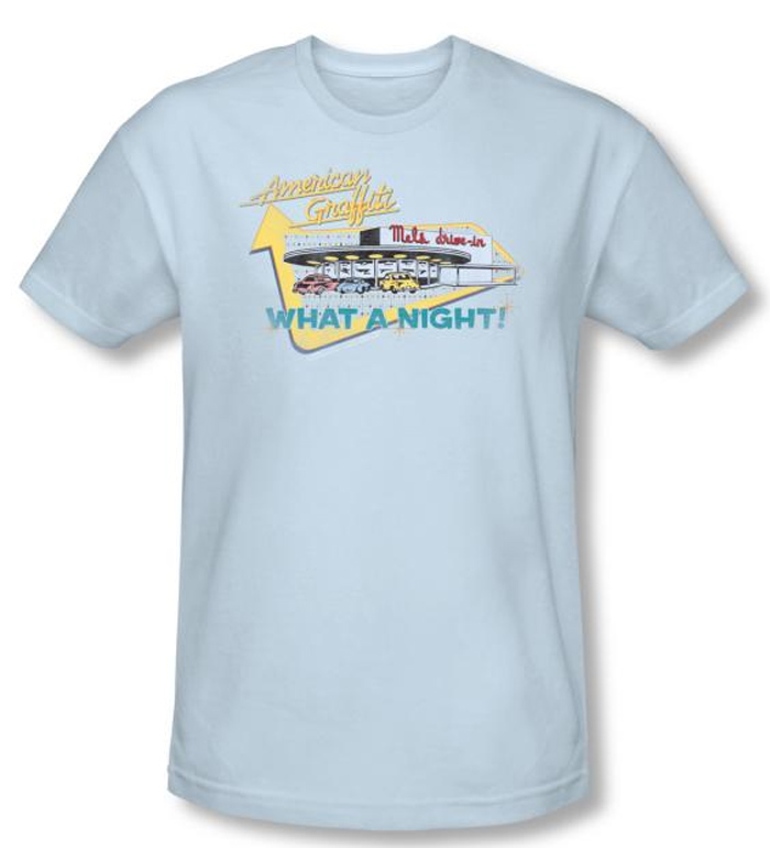 | | American Graffiti Slim Fit T-shirt Mel's Drive In Adult Blue ShirtThis American Graffiti Movie Slim Fit T-shirt Mel’s Diner Light Blue Tee Shirt features a nostalgic image of Mel’s Diner with title American Graffiti in bright yellow above while words What a Night appear in blue green just below. This t shirt makes a outstanding gift for any fan celebrating the 1973 coming of age film American Graffiti written by George Lucas nominated for an Academy Award for Best Picture and deemed by United States Library of Congress to be a "culturally, historically, or aesthetically significant" film selected for preservation in the National Film Registry. Available in Small, Medium, Large, XL, 2XL Officially Licensed |