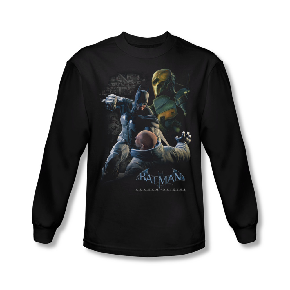 | | Arkham Origins Shirt Punch Long Sleeve Black Tee T-ShirtArkham Origins Shirt Punch Long Sleeve Black Tee T-Shirt The prequel to Batman: Arkham Asylum, the game focuses on batman being a target with a bounty on his head. Officially Licensed Available in Small, Medium, Large, XL, 2XL ![]() |