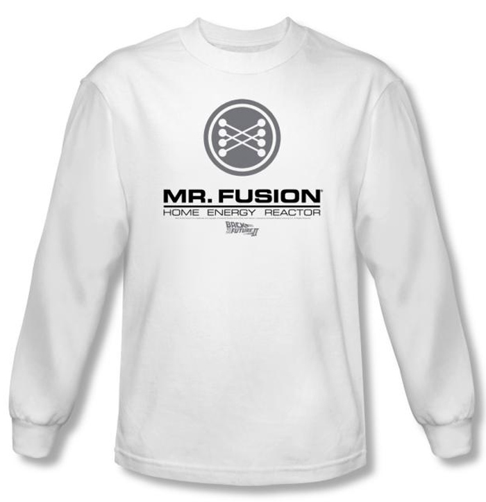 | | Back To The Future II Long Sleeve T-shirt Mr. Fusion Logo White ShirtThis Back To The Future II T-shirt Mr. Fusion Logo Long Sleeve White Tee Shirt features a crisp image of Mr. Fusion Logo and Home Energy Reactor appearing in pewter gray while Mr. Fusion pops in black as it hits white. Our t shirts comfy fit makes an outstanding gift or keepsake of the Back To The Future film trilogy directed by Robert Zemeckis and produced by Steven Spielberg where we first meet Mr. Fusion when Doc Brown comes back from 2015 rummaging through Marty's trash finding banana peel, Miller beer can and other pieces of garbage which he drops into unit suggesting that Mr. Fusion can run on pure trash fueling the DeLorean DMC-12 Back to the Future. Available in Small, Medium, Large, XL, 2XL Officially Licensed |