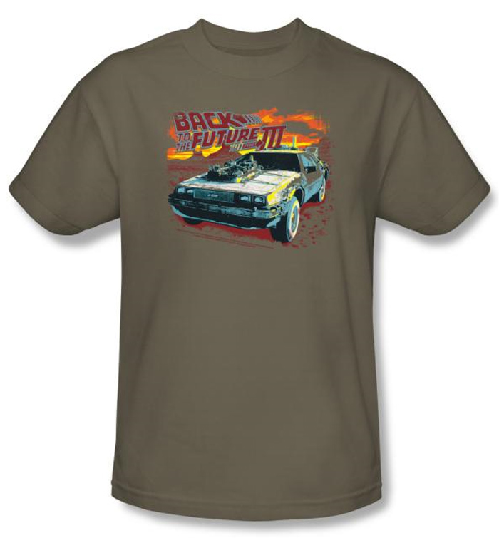 | | Back To The Future III T-shirt Wild West Adult Safari Green Tee ShirtThis Back To The Future III T-shirt Wild West Adult Safari Green Tee Shirt features a full front throttle image of the DeLorean DMC-12 time machine topped with Back to the Future III in deep red while a flaming yellow and red sky serves as backdrop. Our t shirt makes an outstanding gift for any fan capturing essence of the Back to the Future film trilogy directed by Robert Zemeckis where western scenes were filmed on location in Monument Valley some of location shooting for 1885 Hill Valley was done in Jamestown, California and on a purpose-built set at the Red Hills Ranch, near Sonora, California. Available in Small, Medium, Large, XL, 2XL & 3XL Officially Licensed |