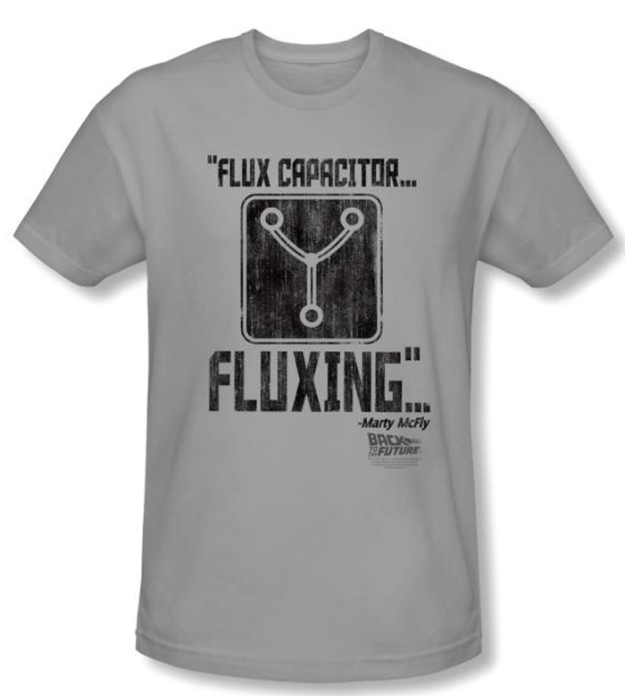 | | Back To The Future Slim Fit T-shirt Fluxing Adult Silver Tee ShirtThis Back To The Future T-shirt Fluxing Slim Fit Adult Silver Tee Shirt features an impressive image of the “Flux Capacitor…Fluxing…” – Marty McFly - making a bold statement in black letters contrasting intensely on silver. Our t shirts fantastic fit makes a phenomenal gift for any fan of Back To The Future a 1985 adventure comedy film where the “Flux” was located between the headrests behind the seats and as the time machine nears 88 mph light coming from the flux capacitor begins pulsing or as Marty said in the first movie "fluxing" more rapidly until it becomes a steady stream of energy propelling the DeLorean through time travel. Available in Small, Medium, Large, XL, 2XL Officially Licensed |