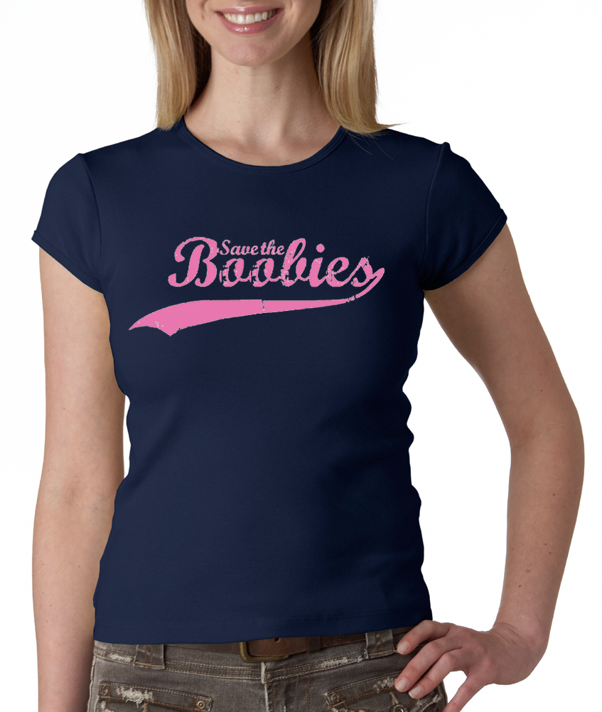 Breast Cancer Ladies T-shirt - Crewneck Save The Boobies Navy TeeBreast Cancer Ladies T-shirt - Crewneck Save The Boobies Navy Tee