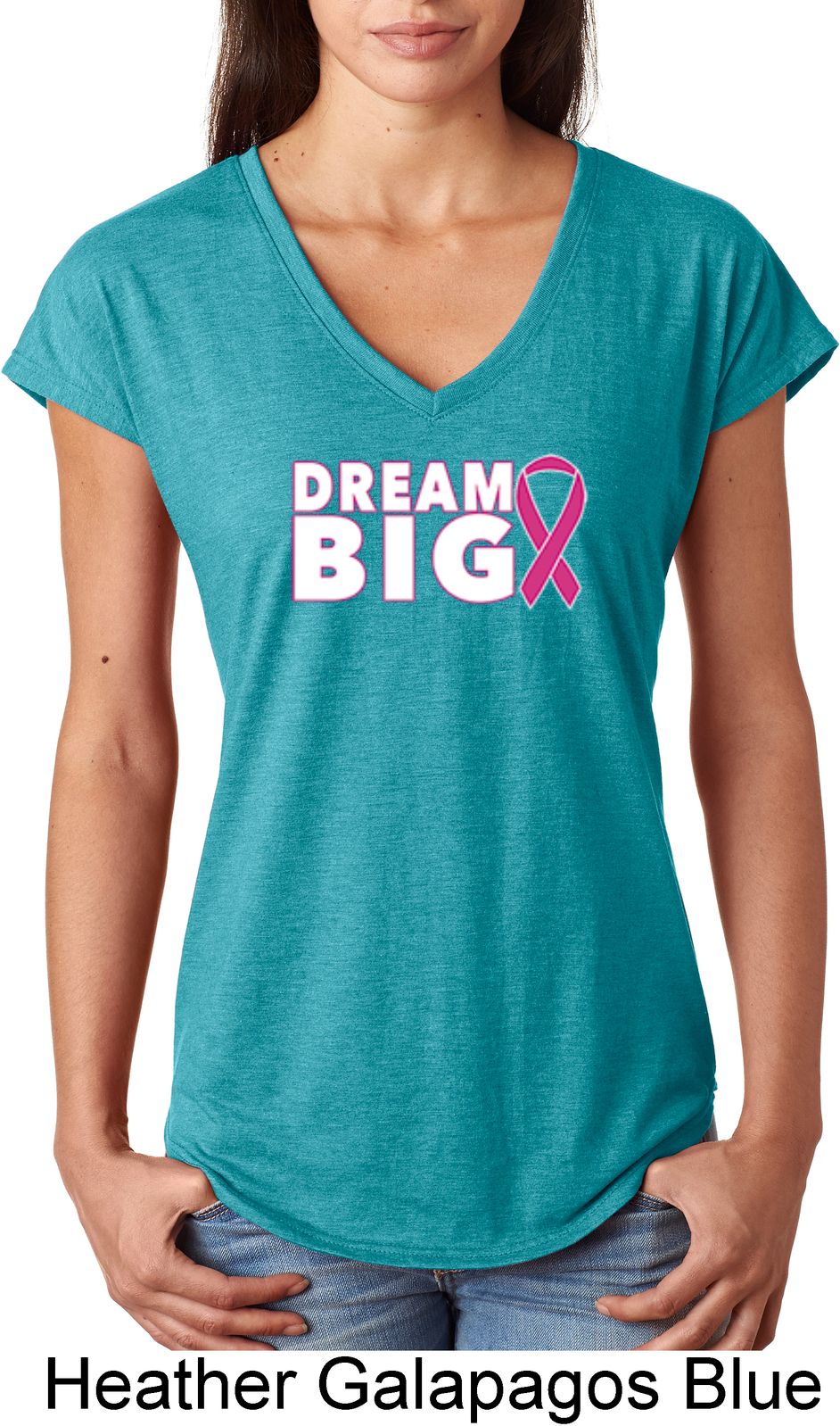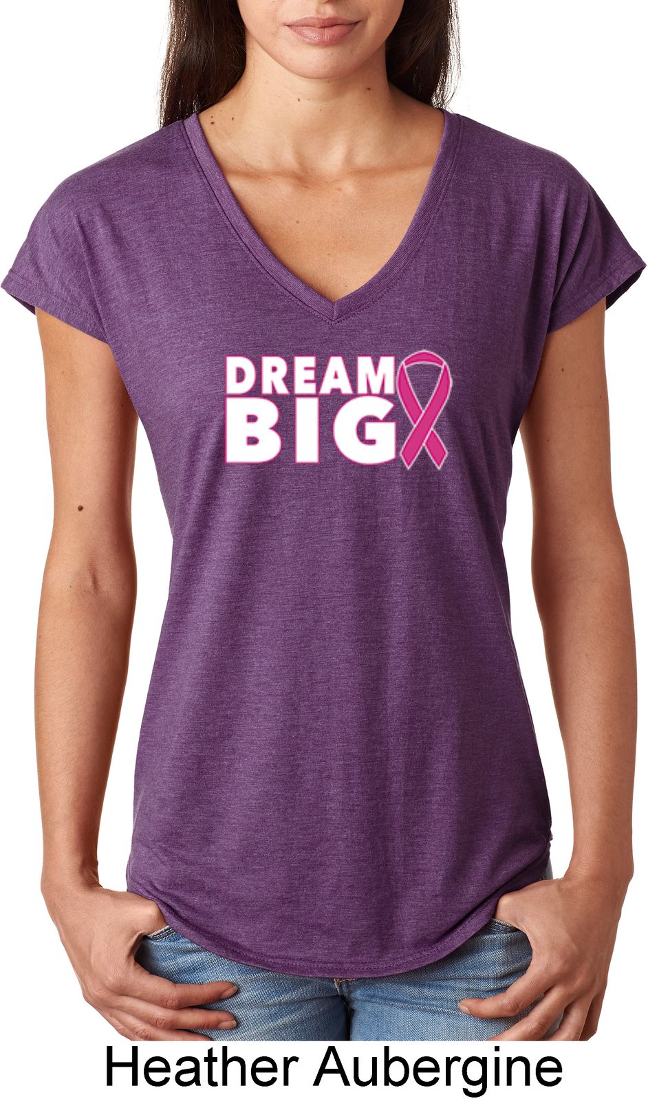 | | Breast Cancer Awareness Dream Big Ladies Tri Blend V-Neck ShirtBreast Cancer Awareness Dream Big Ladies Tri Blend V-Neck Shirt Live life to the fullest A poly/cotton/rayon blend Available in Ladies Small, Ladies Medium, Ladies Large, Ladies XL & Ladies 2XL Also available in colors Black, Heather Aubergine, Heather Caribbean, Heather Dark Green, Heather Dark Grey, Heather Galapagos, Heather Green, Heather Grey, Heather Orange, Heather Purple, Heather Red, Raspberry, and White |