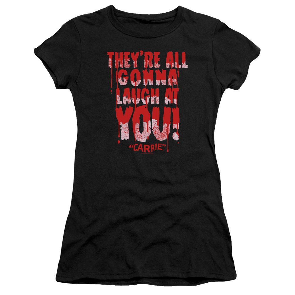 | | Carrie Juniors Shirt Laugh At You Black T-ShirtCarrie Juniors Shirt Laugh At You Black T-Shirt Give this awesome Carrie Laugh At You juniors t-shirt as a gift. Carrie White is shy and outcast 17-year old girl who is sheltered by her domineering, religious mother, and unleashes her telekinetic powers after being humiliated by her classmates for the last time at her senior prom. 100% Cotton, Pre-Shrunk And Machine Washable Officially Licensed Available in Small, Medium, Large, XL, 2XL ![]() |