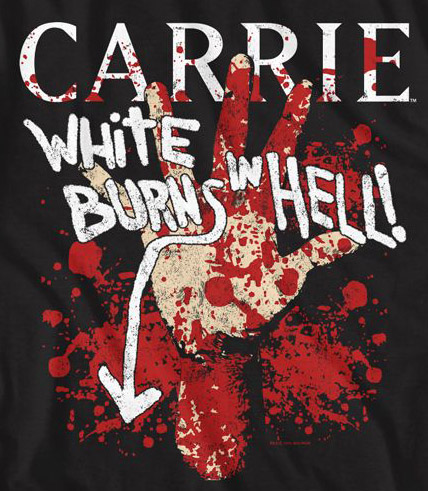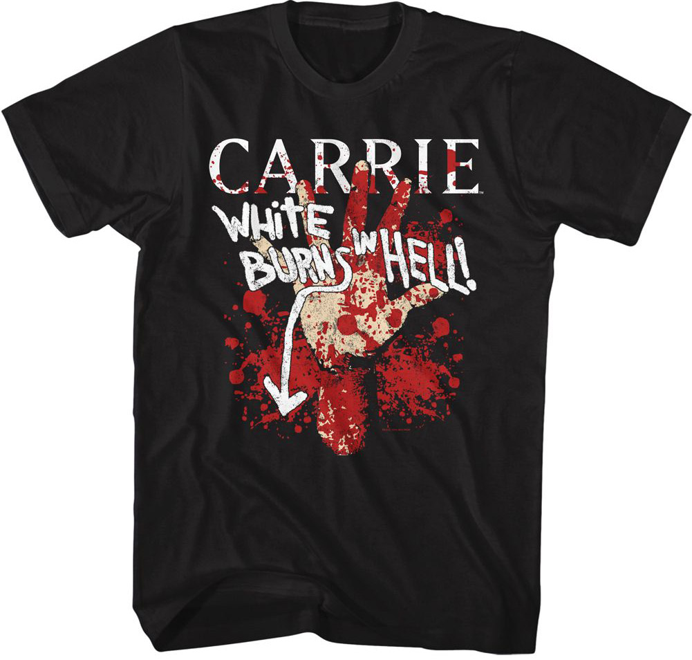 This classic horror movie tee shirt features "Carrie White Burns in Hell"