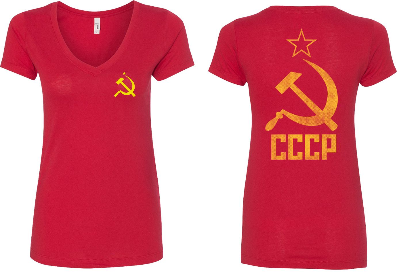 | | CCCP Hammer Sickle Soviet Union (Front & Back) Ladies V-neckA fitted ladies v-neck featuring a yellow hammer and sickle on the front and a distressed CCCP logo on the back. Our ladies shirt is made with a blend of cotton/poly. Available in sizes Small through 2XL. Machine wash cold with like colors; dry low heat. ![]() |