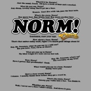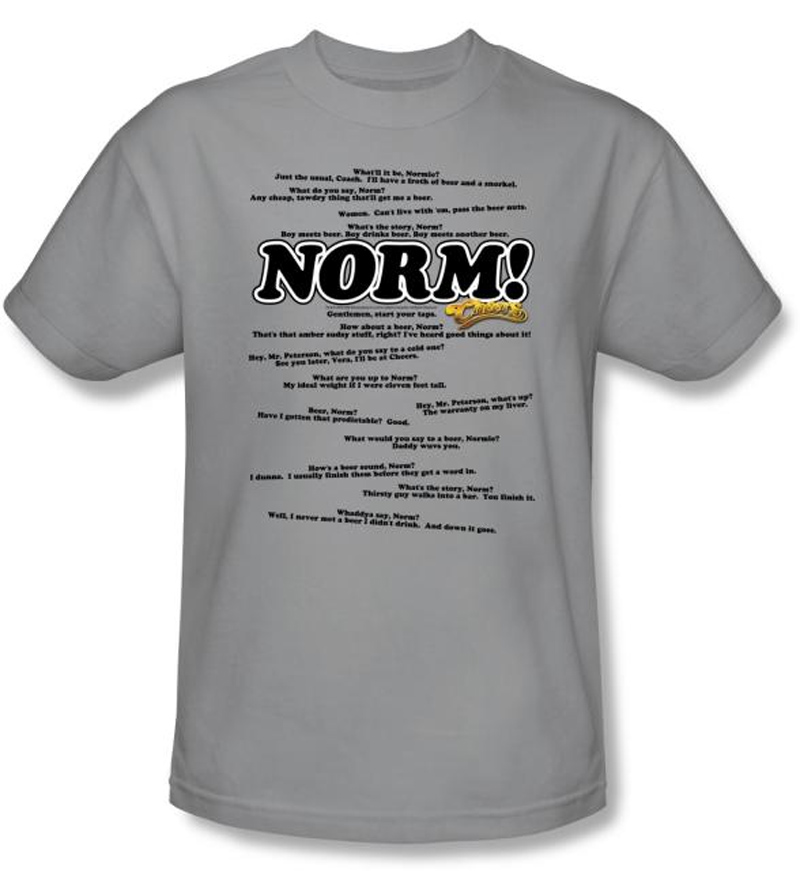 | | Cheers Norm T-shirt - Normisms Adult Silver Tee ShirtThis shirt is full of great Norm Peterson quotes! An awesome 100% preshrunk cotton T-shirt for any fan! Available in Small, Medium, Large, XL, 2XL & 3XL! Officially Licensed! Rating: 5 Comment: Hey Norm hows it going? Its a dog eat dog world and im wearin milk bone underwear Name: Rob Coswell Location: yeah right Date: 01/27/2013 |