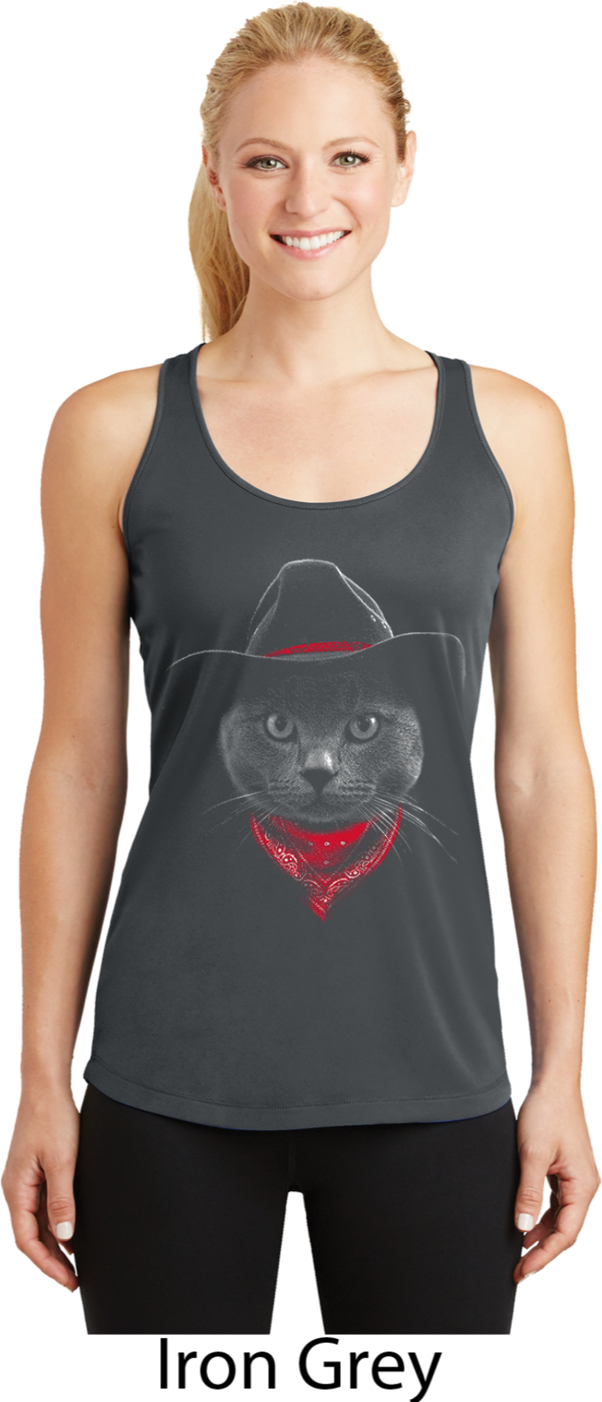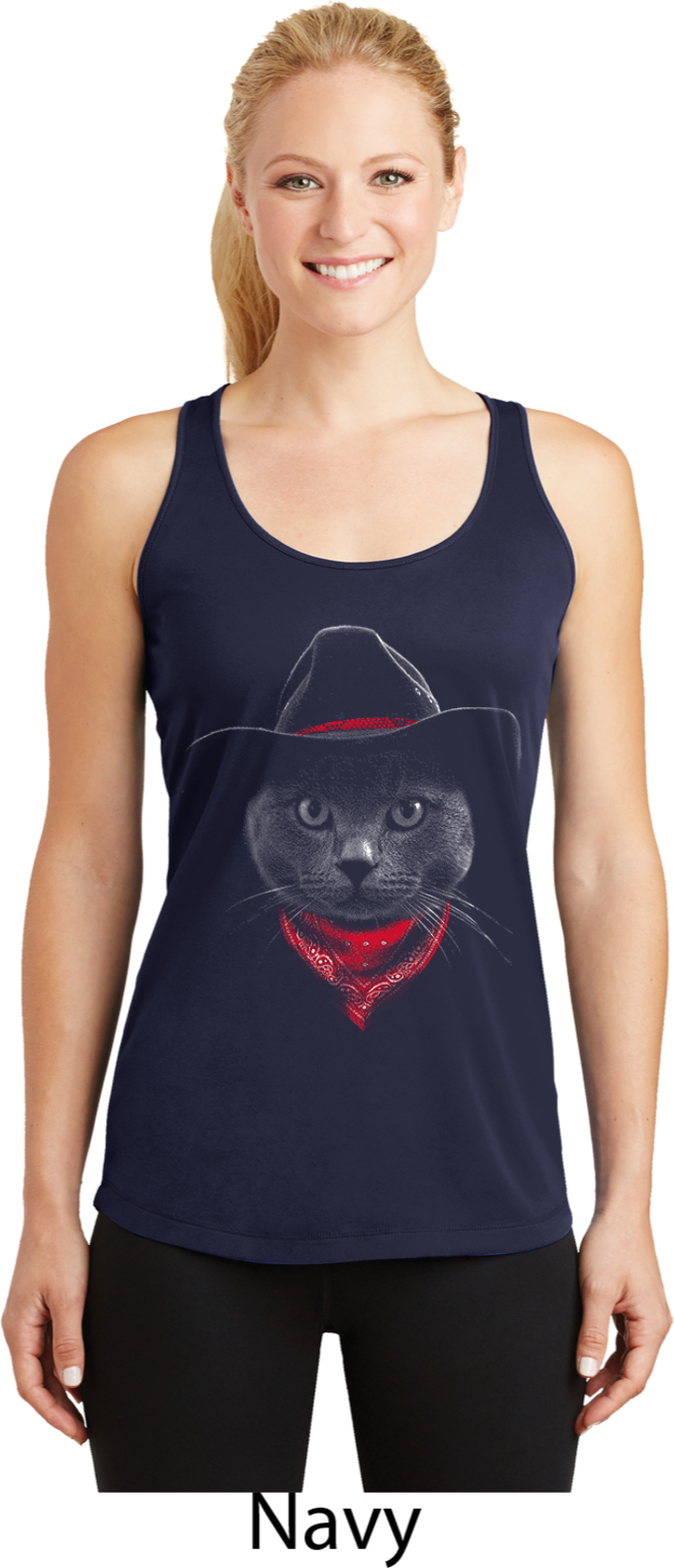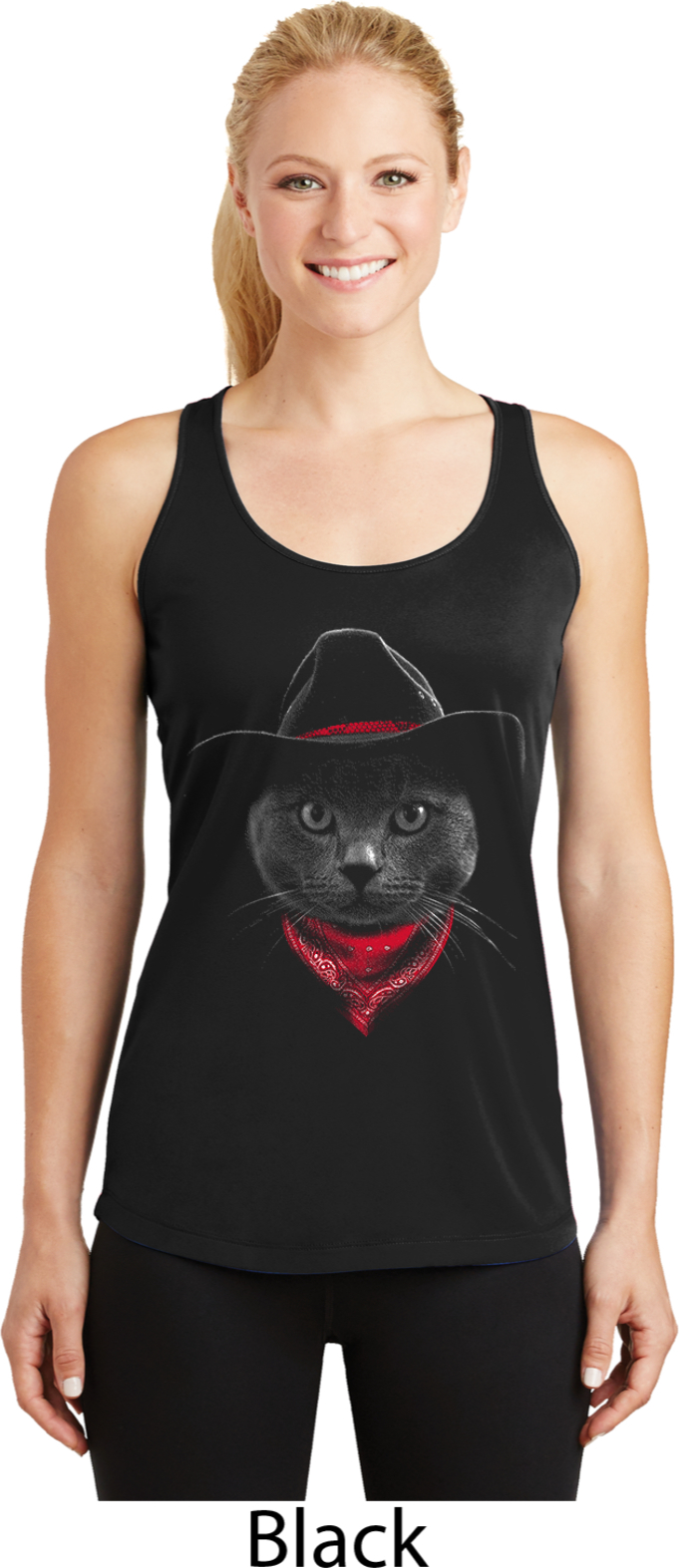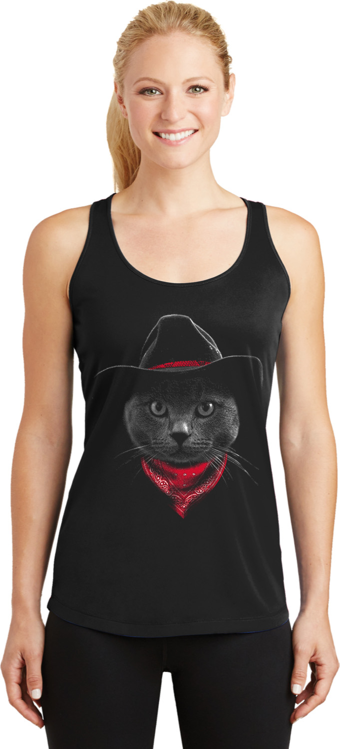 | | Cowboy Cat Ladies Dry Wicking RacerbackA ladies dry wicking racerback featuring a cute cat wearing a bandana and cowboy hat. A perfect gift for cat lovers everywhere. Our ladies tank top is made of 100% polyester. Available in sizes Small through 4XL. Machine wash cold with like colors; dry low heat. ![]() |