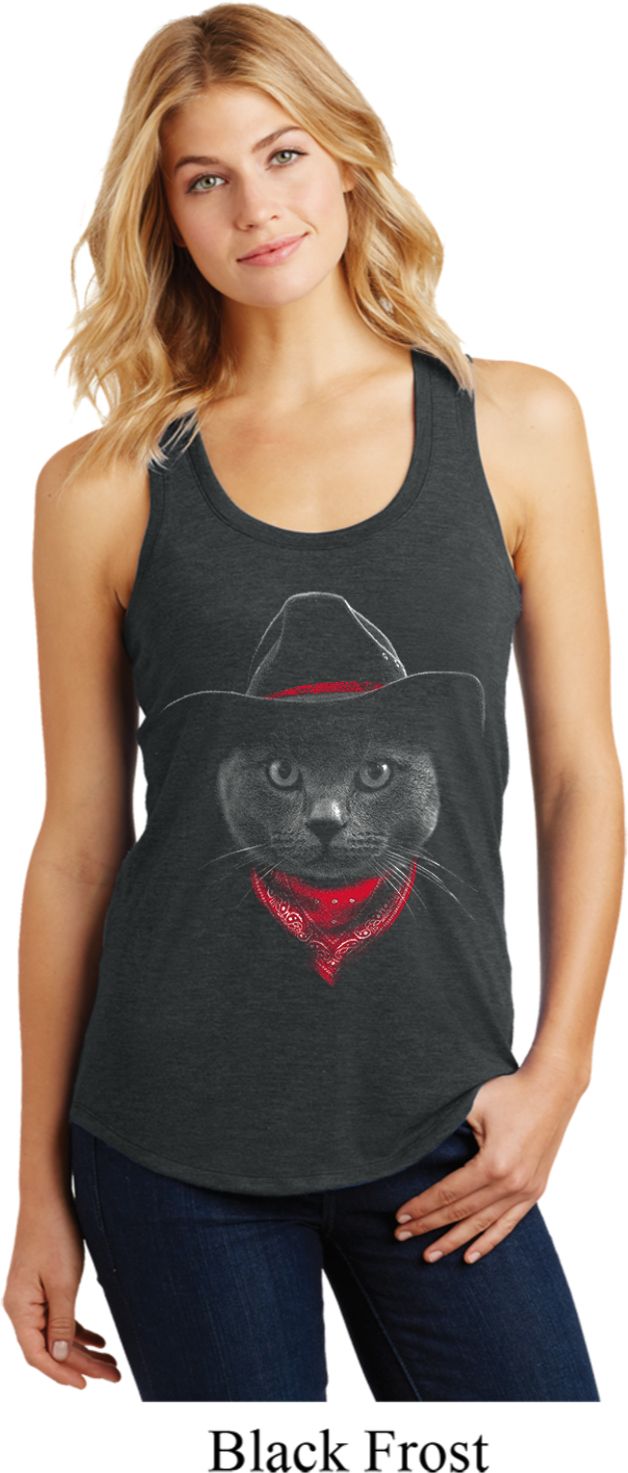 | | Cowboy Cat Ladies RacerbackA relaxed fit ladies racerback featuring a cute cat wearing a bandana and cowboy hat. A perfect gift for cat lovers everywhere. Our ladies tank top is made with a blend of cotton/poly/rayon. Available in sizes Small through 4XL. Machine wash cold with like colors; dry low heat. ![]() |