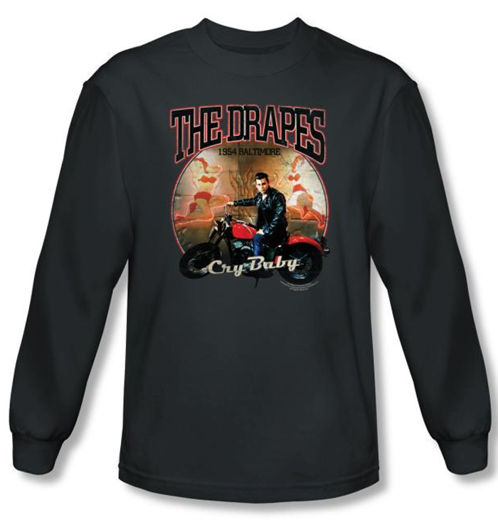 | | Cry Baby Long Sleeve T-shirt Movie The Drapes Charcoal Tee ShirtThis Cry Baby T-shirt Movie The Drapes Long Sleeve Charcoal Tee Shirt Shirt features a striking encircled image of Wade “Cry Baby” Walker on his motorcycle with words 1954 Baltimore and bookend pin-up models in backdrop topped boldly with title The Drapes in black and red. Our t shirts great fit makes the perfect gift for any fan of 1990 musical-teen film Cry Baby written and directed by John Waters starring Johnny Depp whose many future projects include documentary about Keith Richards, star and produce adaptation of comic book Rex Mundi, collaborate with director Rob Marshall on remake of The Thin Man, role as Tonto in Lone Ranger to be released on May 31, 2013, star as Carl Kolchak in project Night Stallker and bought rights to comic book The Vault. Available in Small, Medium, Large, XL, 2XL Officially Licensed View our complete line of Cry Baby Shirts Rating: 5 Comment: one of my fav movies ever! Name: Anonymous Location: Date: 07/02/2012 |