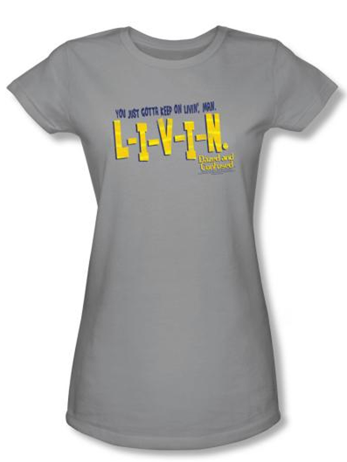 | | Dazed And Confused Juniors T-shirt Movie Livin Silver Tee ShirtThis Dazed And Confused T-shirt Movie Livin Silver Juniors Tee Shirt features slogan You Just Gotta Keep On Livin’, Man in deep blue velvet while words L-I-V-I-N and movie title shine on in yellow against silver. Our t shirt makes a slammin gift for any fan as it totally captures the time of Dazed and Confused a 1993 coming of age comedy film directed by Richard Linklater who born in Houston, TX. worked on an off shore oil rig in the Gulf of Mexico but on land he developed a love of film through repeated visits to a repertory theater in Houston where he realized he wanted to be a filmmaker. Available in Small, Medium, Large, XL Officially Licensed |