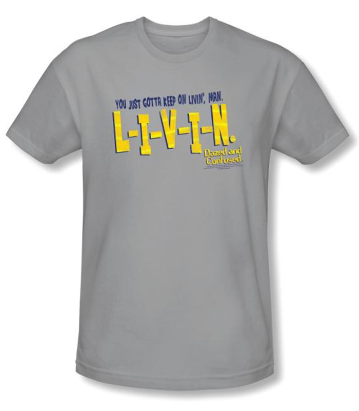 | | Dazed And Confused T-shirt Movie Livin Adult Silver Slim Fit ShirtThis Dazed And Confused T-shirt Movie Livin Adult Silver Slim Fit Shirt features slogan You Just Gotta Keep On Livin’, Man in blue velvet while words L-I-V-I-N and movie title shine on in yellow against silver. Our t shirts fantastic fit makes an incredible gift or keepsake for any fan celebrating Dazed and Confused a 1993 coming of age comedy film written and directed by Richard Linklater depicting teens last day of school in 1976 with title of film deriving from Jake Holmes song of the same name popularized by Led Zeppelin when Linklater approached surviving members of the band for permission to use their songs in the film Jimmy Page agreed while Robert Plant refused. Available in Small, Medium, Large, XL, 2XL Officially Licensed |