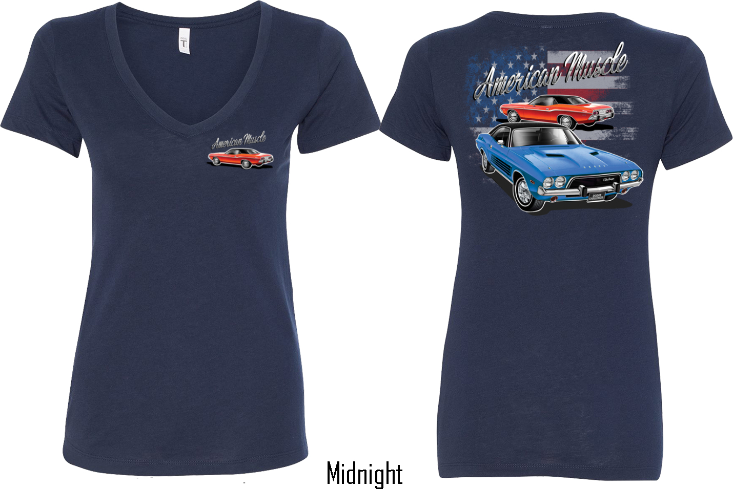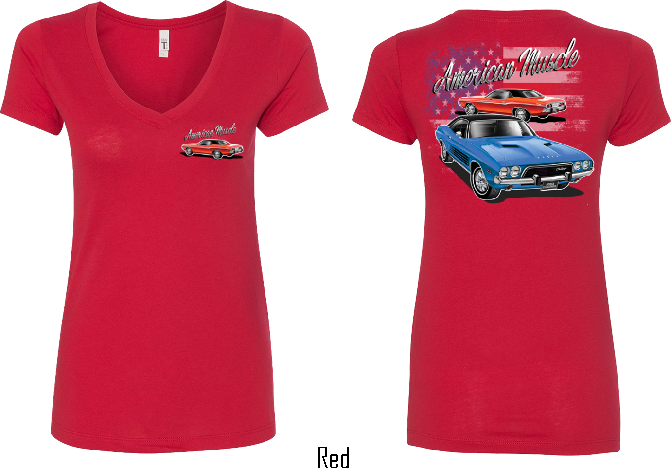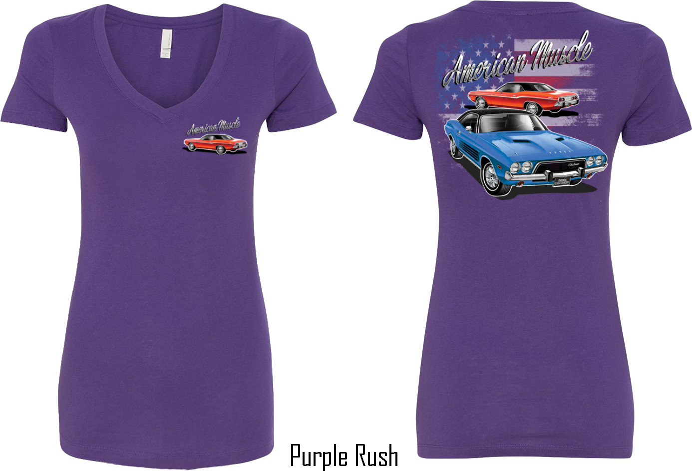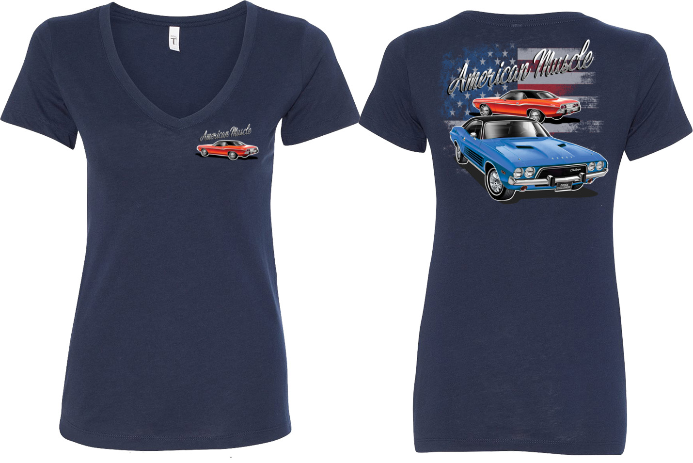 | | Dodge American Muscle Blue and Red (Front & Back) Ladies V-neckA fitted ladies v-neck featuring a red Dodge Challenger on the front and a blue and red American Muscle Dodge Challenger on the back. Our ladies shirt is made with a blend of cotton/poly. Available in sizes Small through 2XL. Machine wash cold with like colors; dry low heat. ![]() |