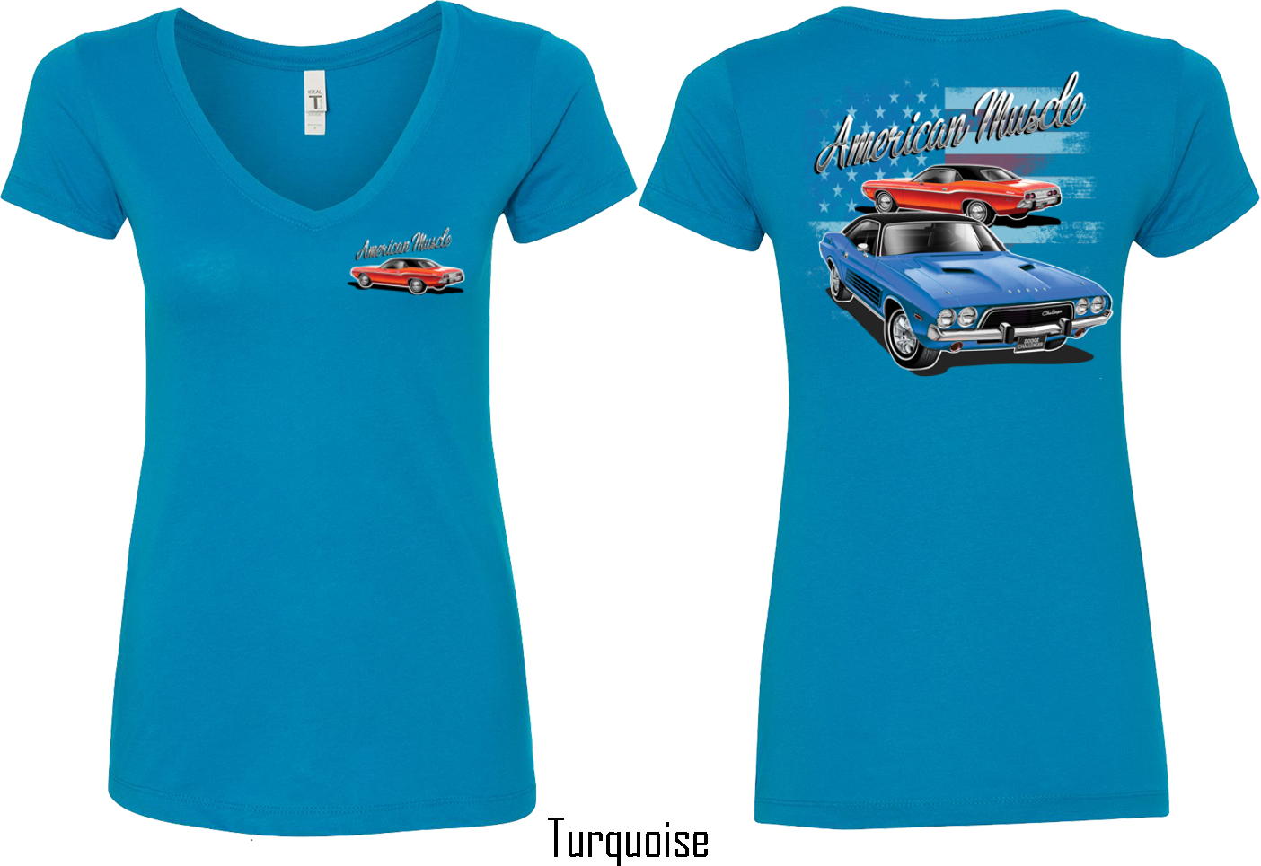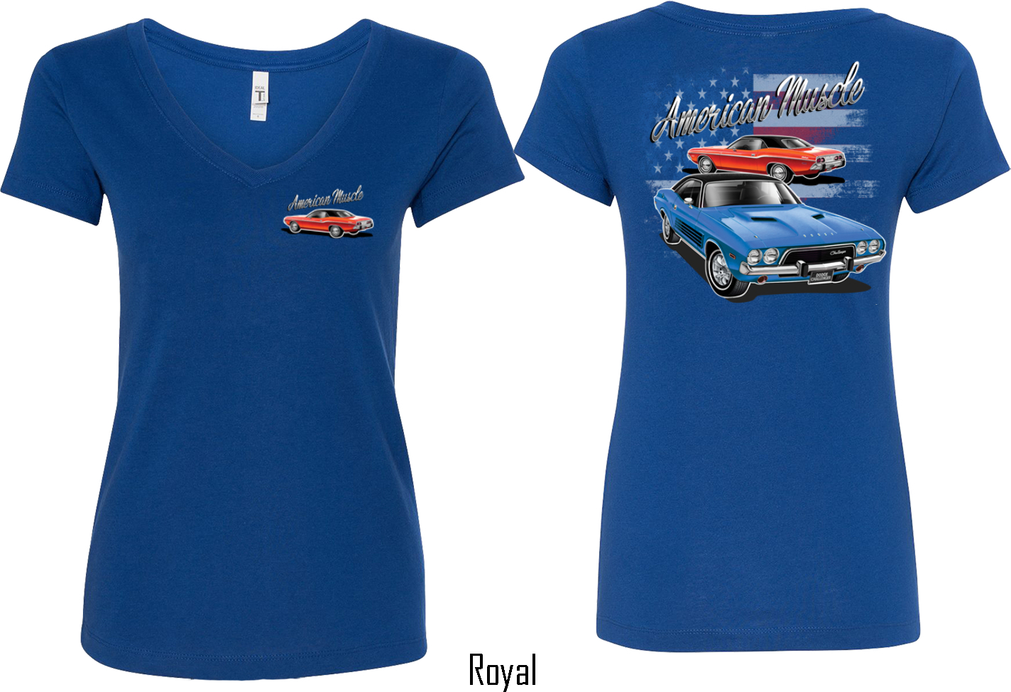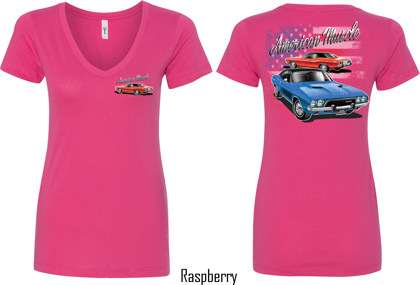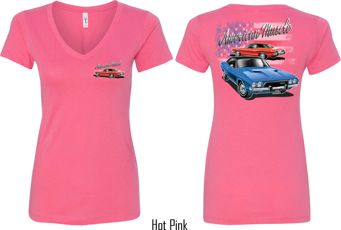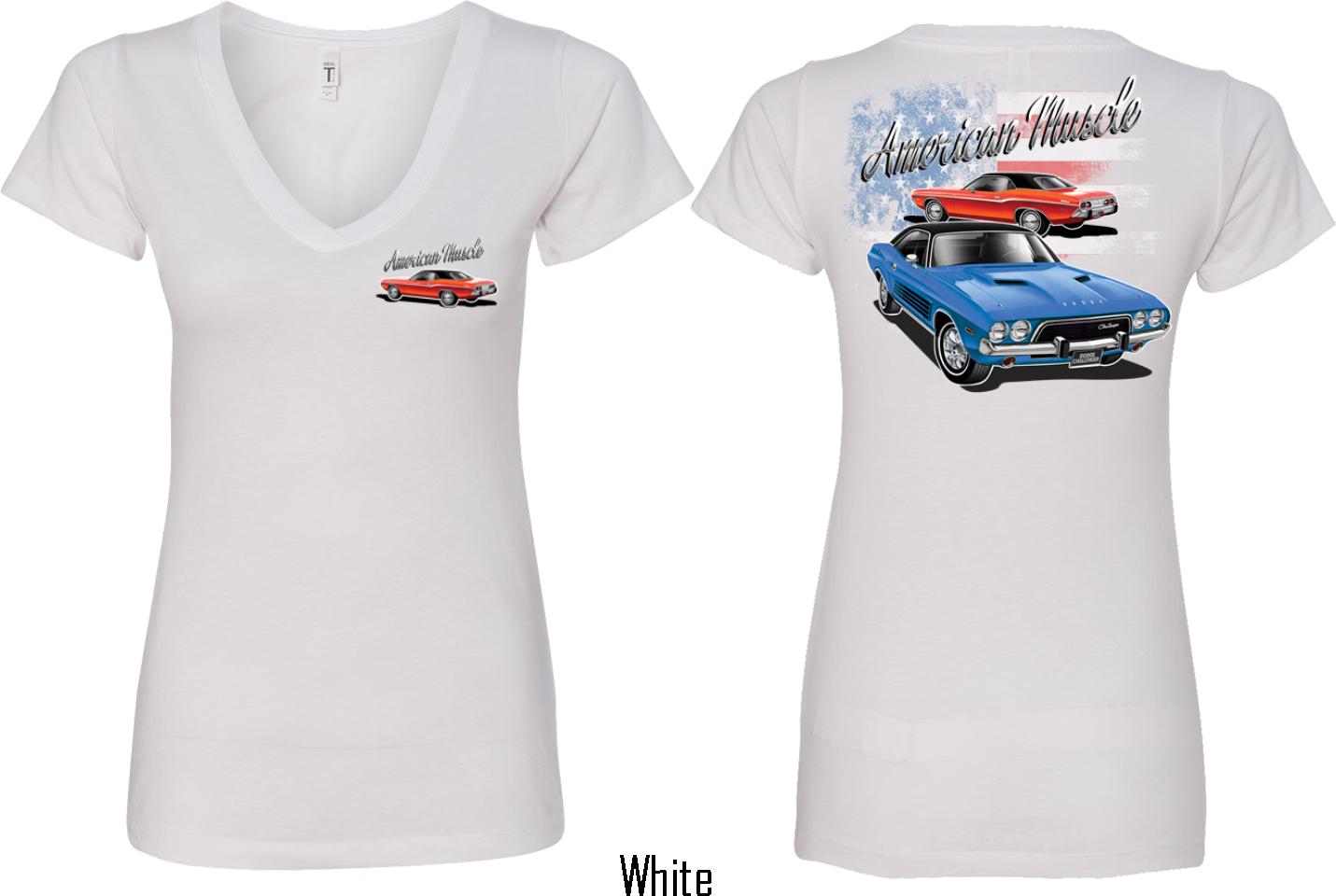 | | Dodge American Muscle Blue and Red (Front & Back) Ladies V-neckA fitted ladies v-neck featuring a red Dodge Challenger on the front and a blue and red American Muscle Dodge Challenger on the back. Our ladies shirt is made with a blend of cotton/poly. Available in sizes Small through 2XL. Machine wash cold with like colors; dry low heat. ![]() |