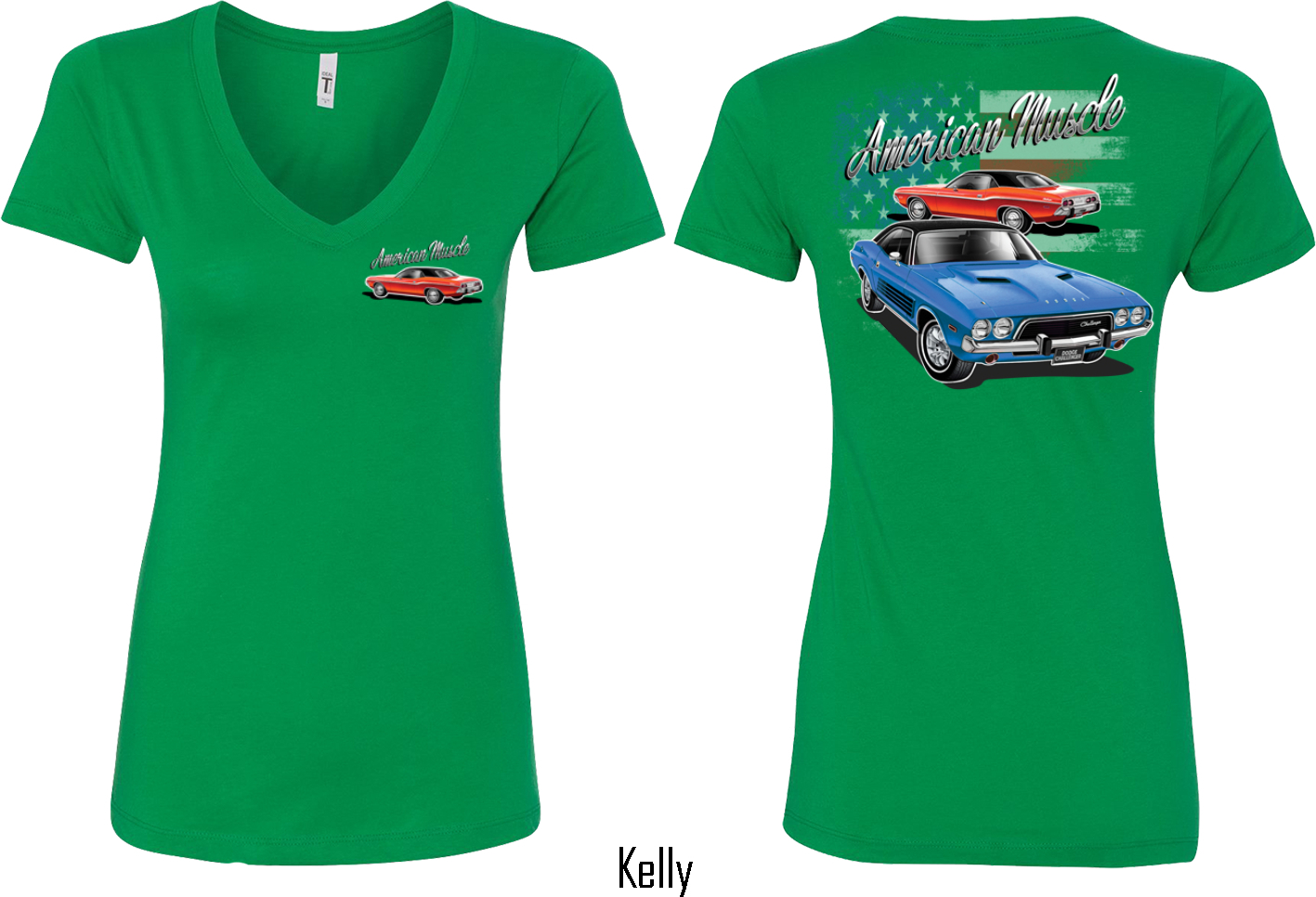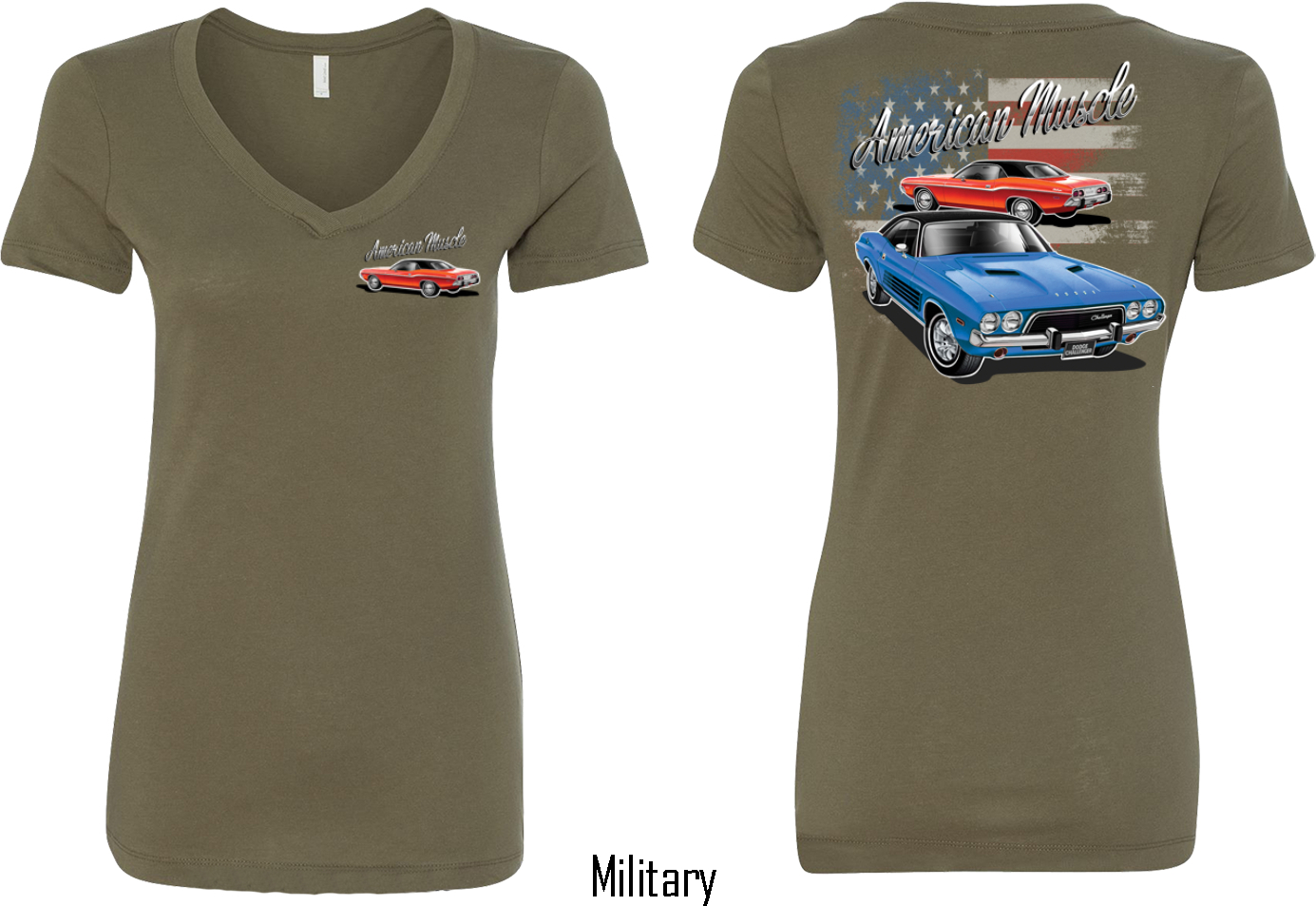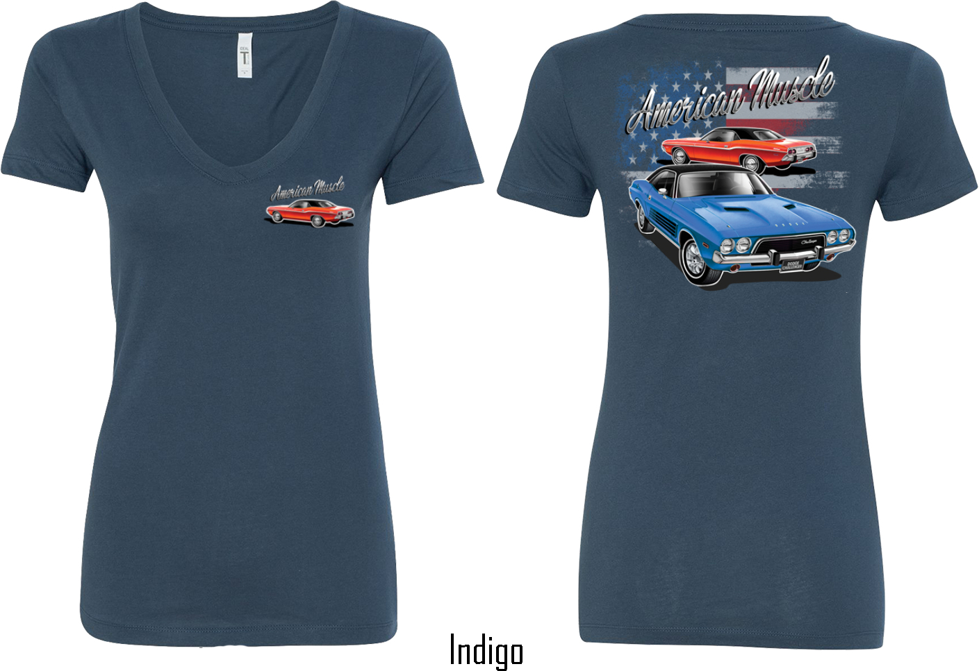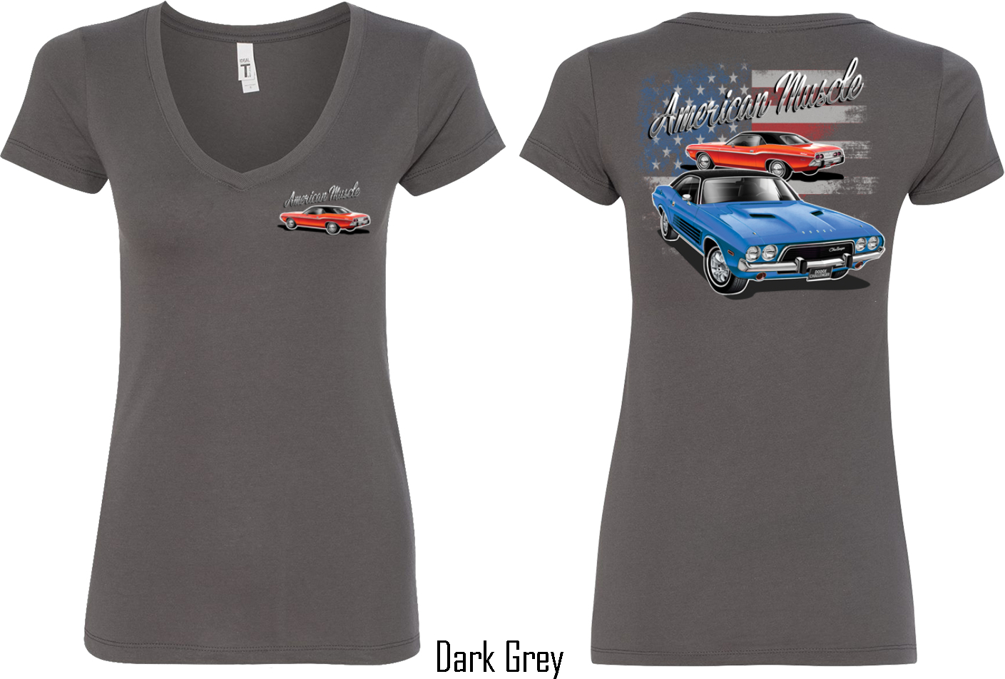 | | Dodge American Muscle Blue and Red (Front & Back) Ladies V-neckA fitted ladies v-neck featuring a red Dodge Challenger on the front and a blue and red American Muscle Dodge Challenger on the back. Our ladies shirt is made with a blend of cotton/poly. Available in sizes Small through 2XL. Machine wash cold with like colors; dry low heat. ![]() |