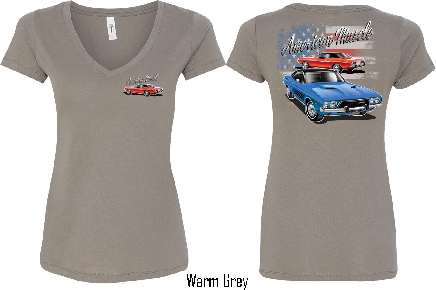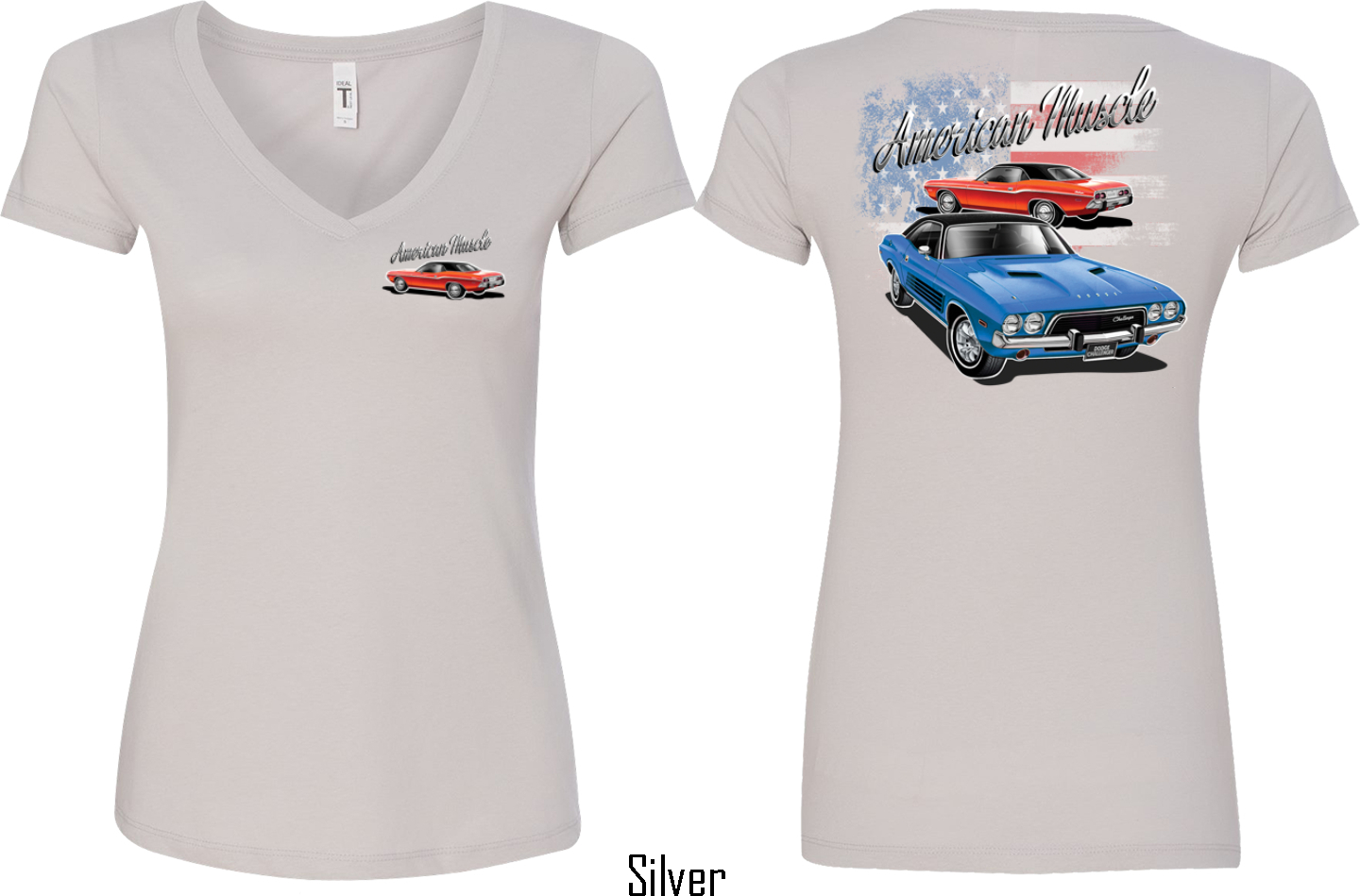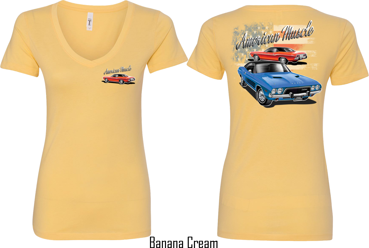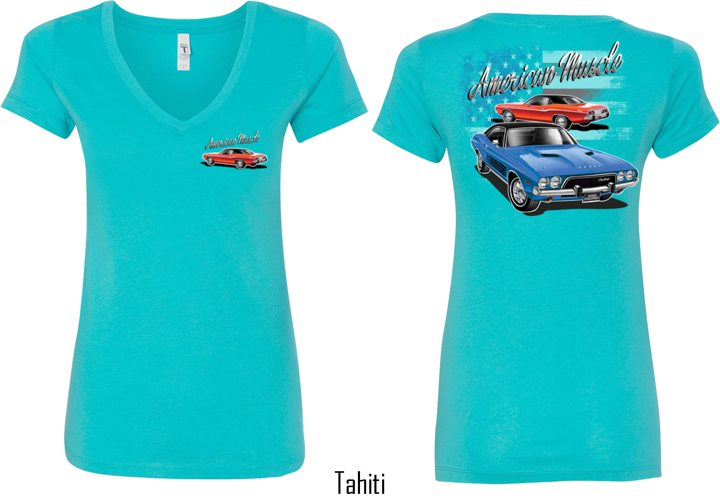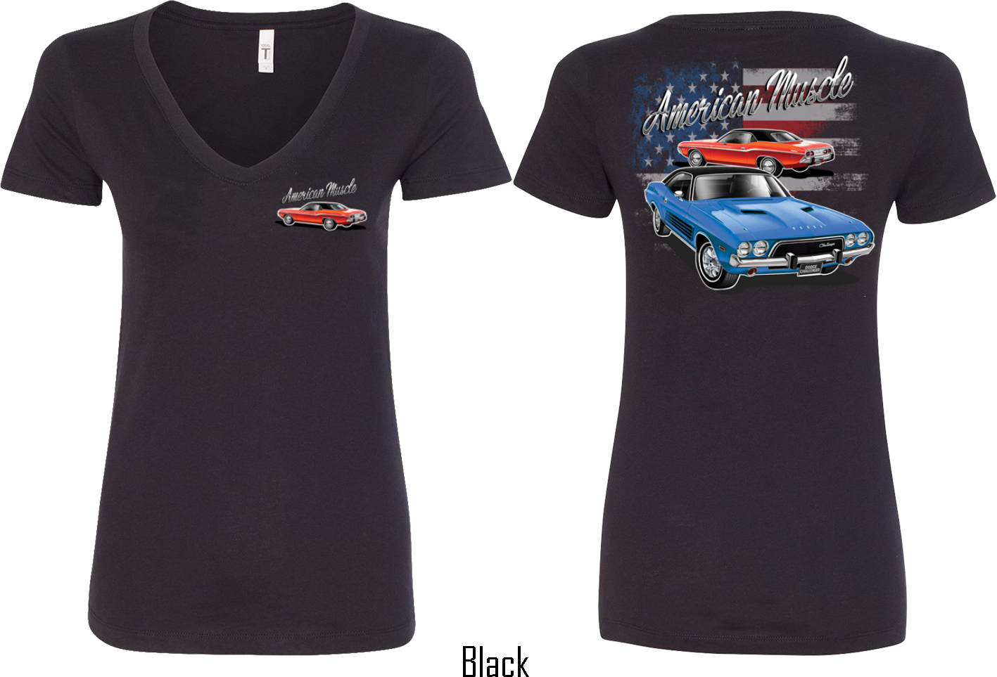 | | Dodge American Muscle Blue and Red (Front & Back) Ladies V-neckA fitted ladies v-neck featuring a red Dodge Challenger on the front and a blue and red American Muscle Dodge Challenger on the back. Our ladies shirt is made with a blend of cotton/poly. Available in sizes Small through 2XL. Machine wash cold with like colors; dry low heat. ![]() |