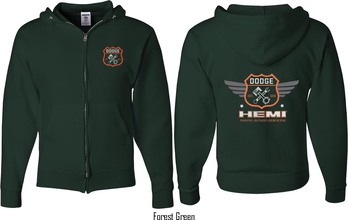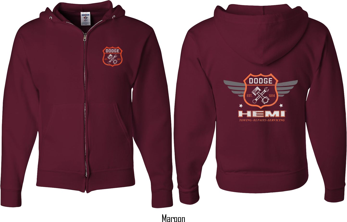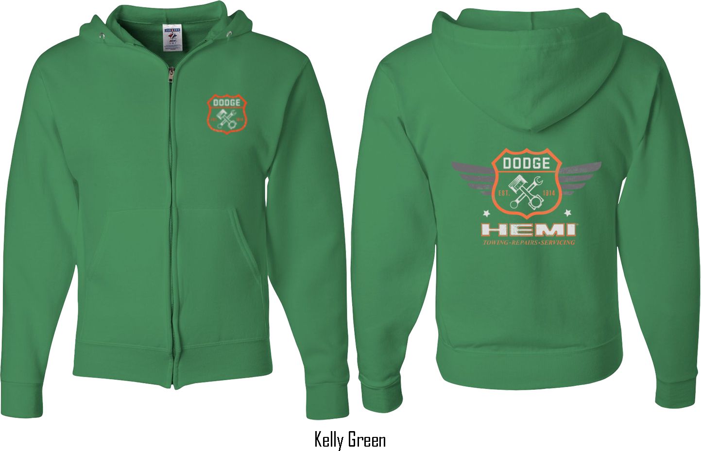 | | Dodge Garage Hemi (Front & Back) Full Zip HoodieA mens full zip hoodie featuring Dodge Garage Est. 1914 on the front and back Hemi: Towing, Repairs, Servicing. This mens full zip makes an awesome gift for all Dodge car enthusiasts! Our mens full zip hoodie is made with a blend of cotton/poly. Available in sizes Small through 3XL. Machine wash cold with like colors; dry low heat. ![]() |