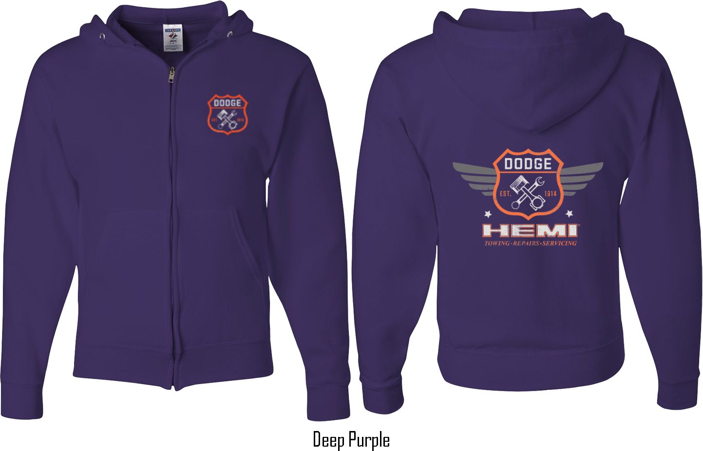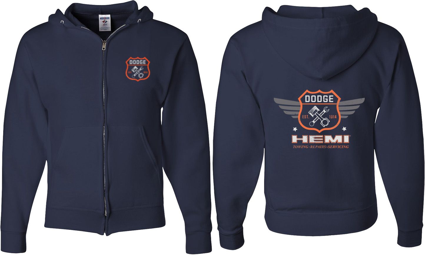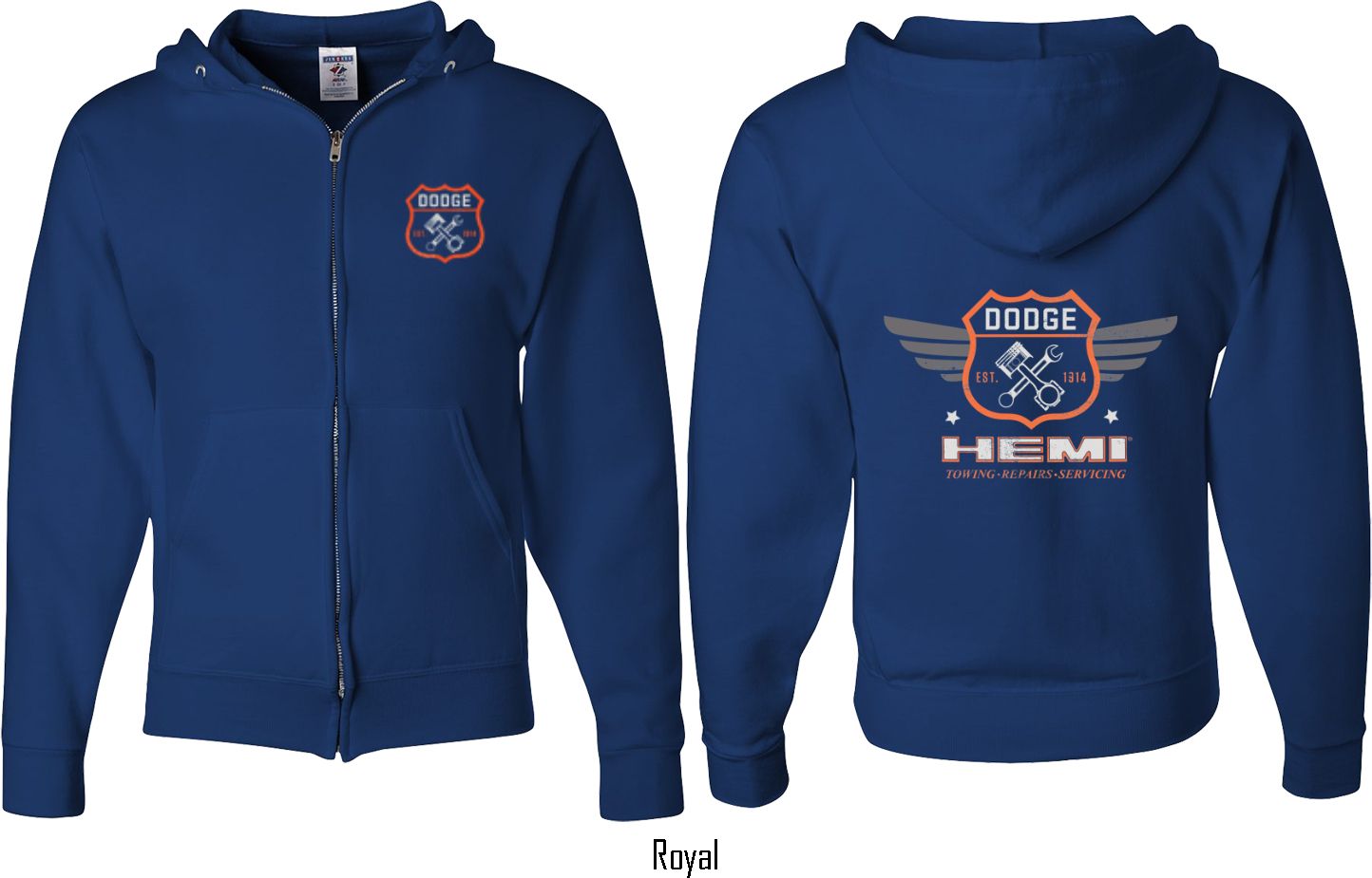 | | Dodge Garage Hemi (Front & Back) Full Zip HoodieA mens full zip hoodie featuring Dodge Garage Est. 1914 on the front and back Hemi: Towing, Repairs, Servicing. This mens full zip makes an awesome gift for all Dodge car enthusiasts! Our mens full zip hoodie is made with a blend of cotton/poly. Available in sizes Small through 3XL. Machine wash cold with like colors; dry low heat. ![]() |