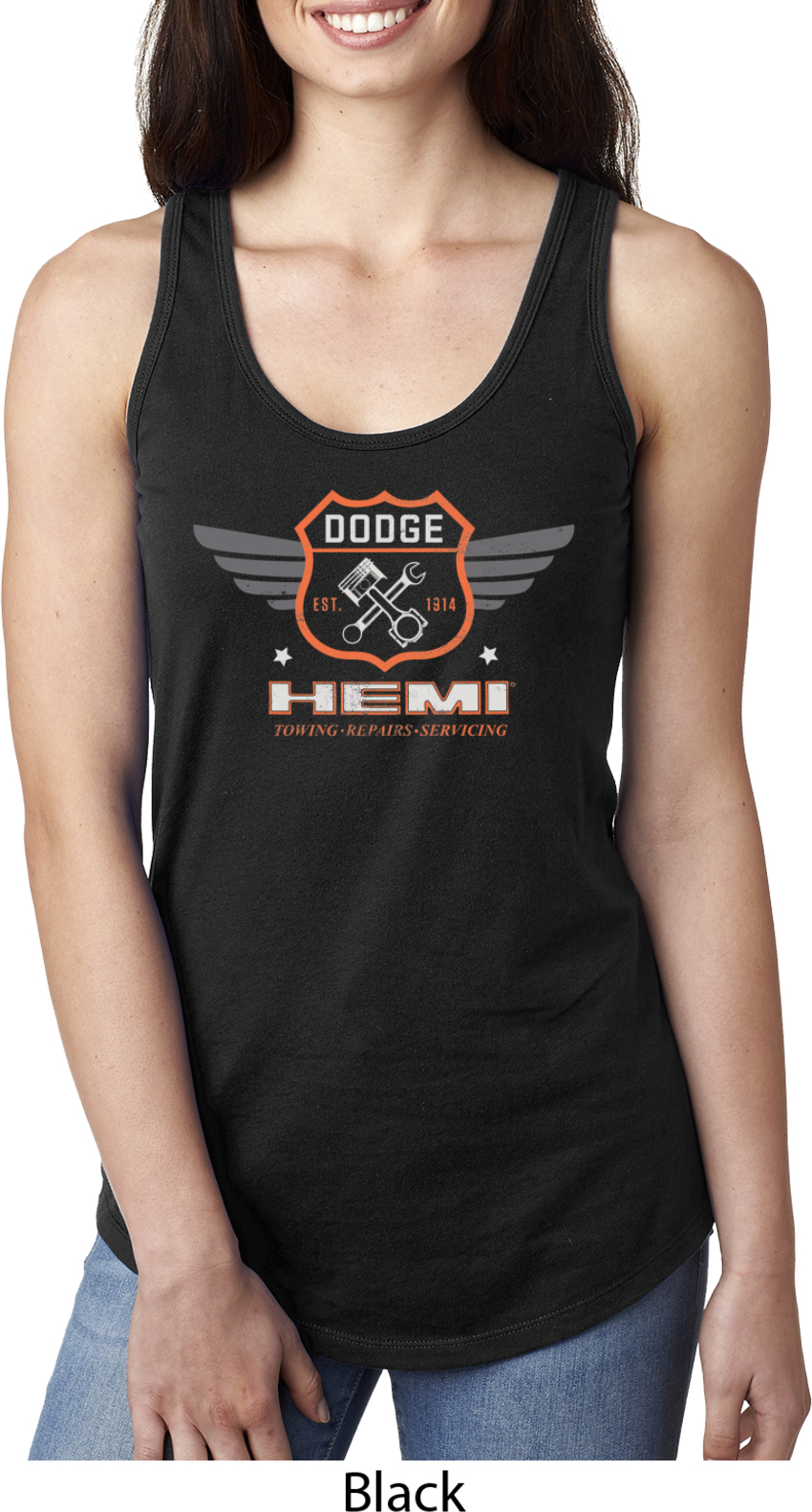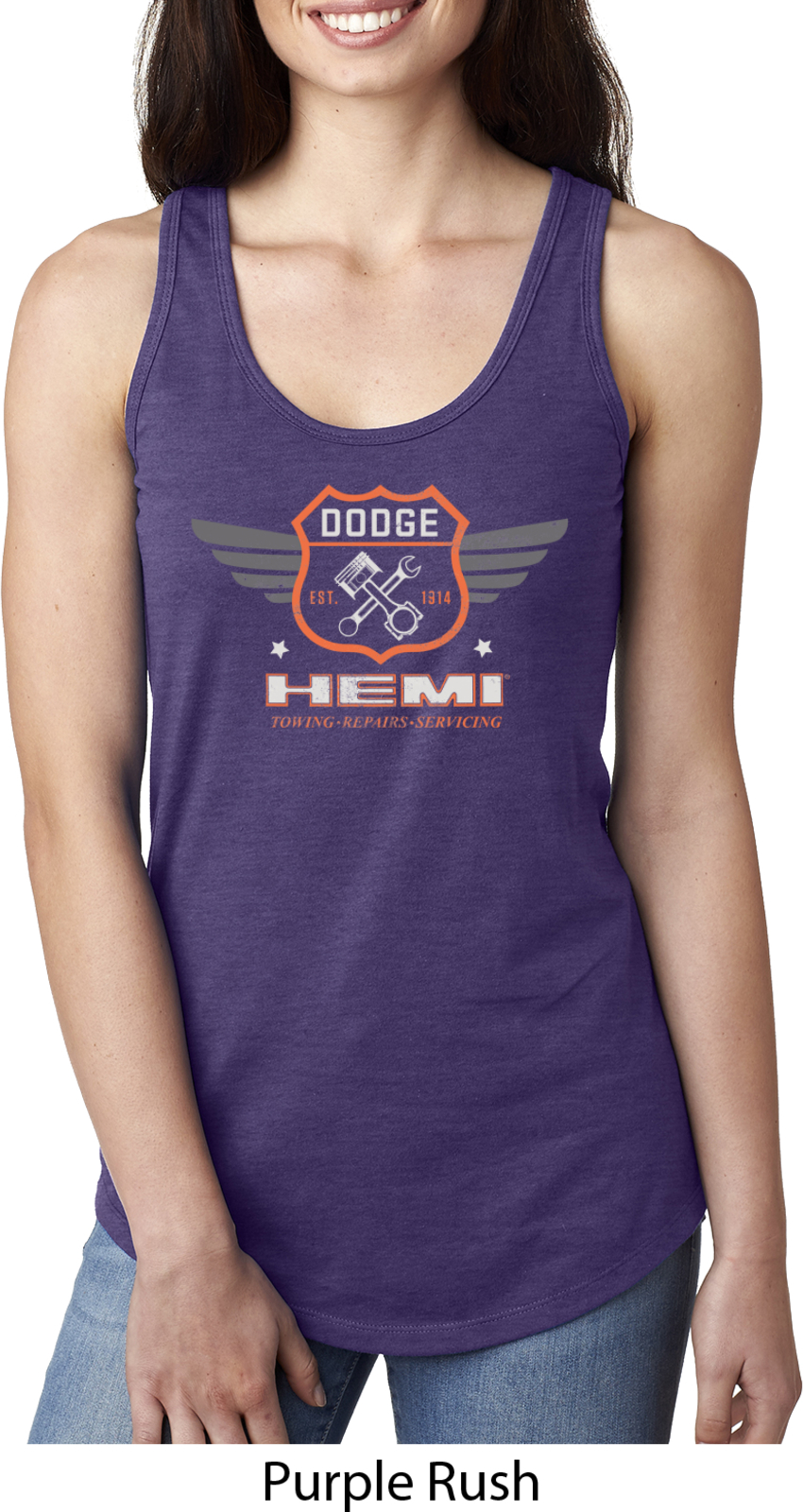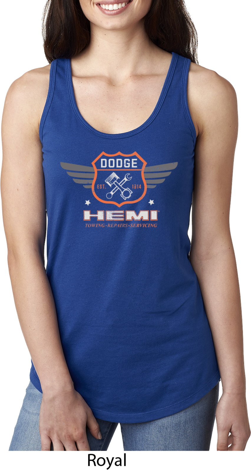 | | Dodge Garage Hemi Ladies Ideal Tank TopDodge Garage Hemi Ladies Ideal Tank Top A great shirt for someone who loves Dodge A cotton/poly blend Available in Ladies Small, Ladies Medium, Ladies Large, Ladies XL & Ladies 2XL Also available in colors Black, Dark Grey, Indigo, Kelly, Midnight, Military, Purple Rush, and Royal |
