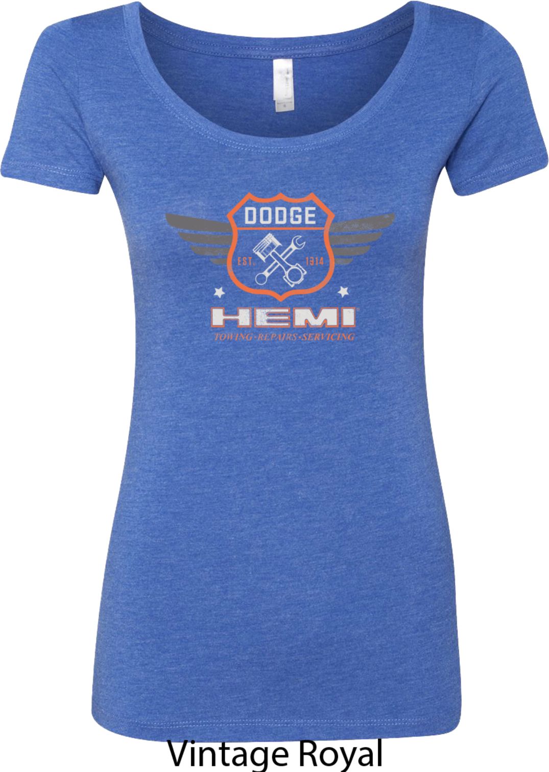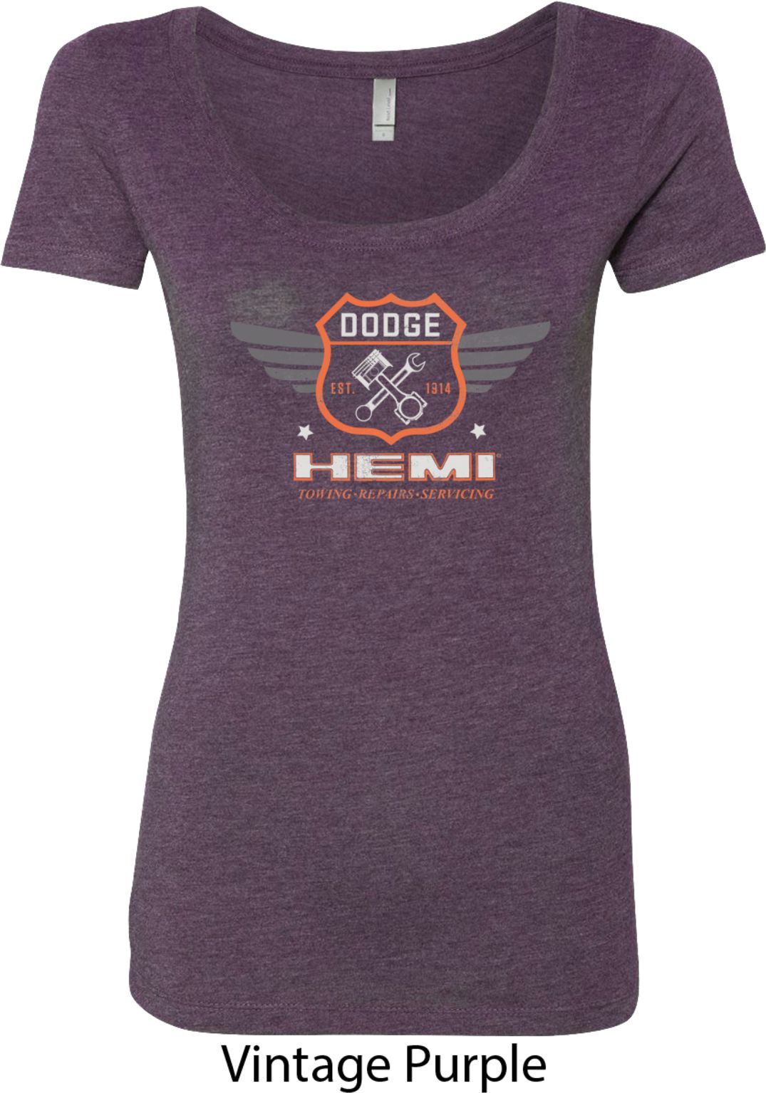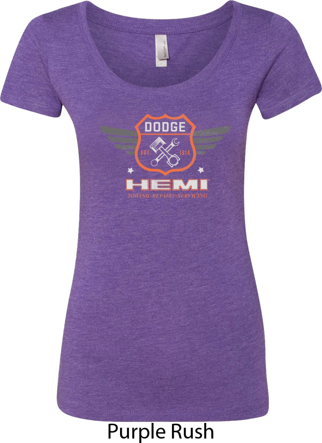 | | Dodge Garage Hemi Ladies Scoop Neck ShirtDodge Garage Hemi Ladies Scoop Neck Shirt A great shirt for someone who loves Dodge A poly/cotton/rayon blend Available in Ladies Small, Ladies Medium, Ladies Large, Ladies XL & Ladies 2XL Also available in colors Purple Rush, Vintage Black, Vintage Navy, Vintage Purple, and Vintage Royal |