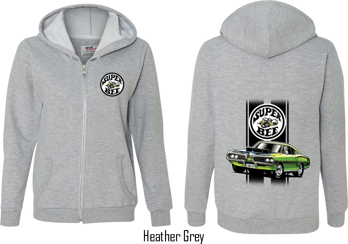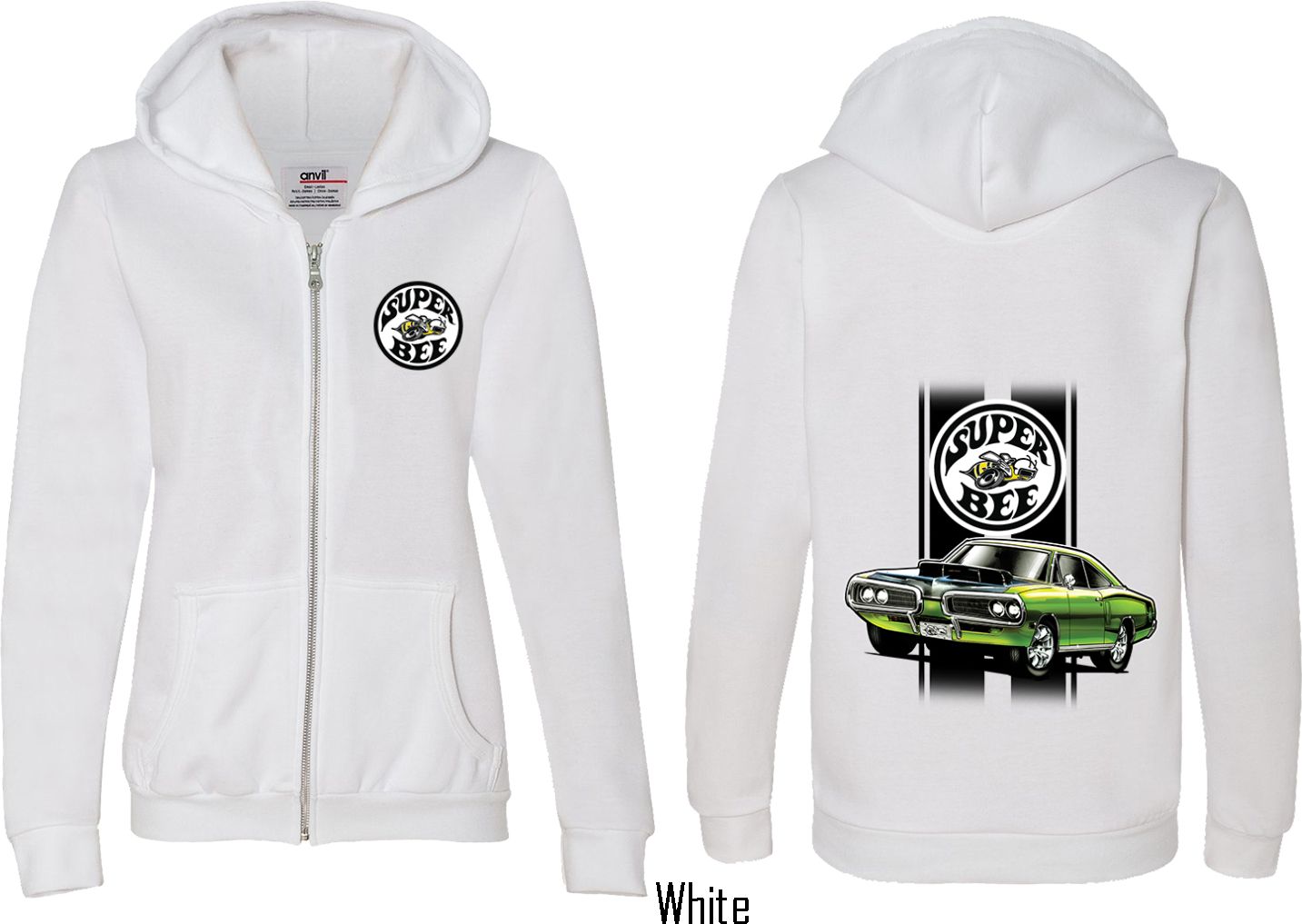 | | Dodge Green Super Bee (Front & Back) Ladies Full Zip HoodieA ladies full zip hoodie featuring a Super Bee logo on the front and a green Dodge Super Bee on the back. Our ladies full zip is made with a blend of cotton/poly. Available in sizes Small through 2XL. Machine wash cold with like colors; dry low heat. ![]() |