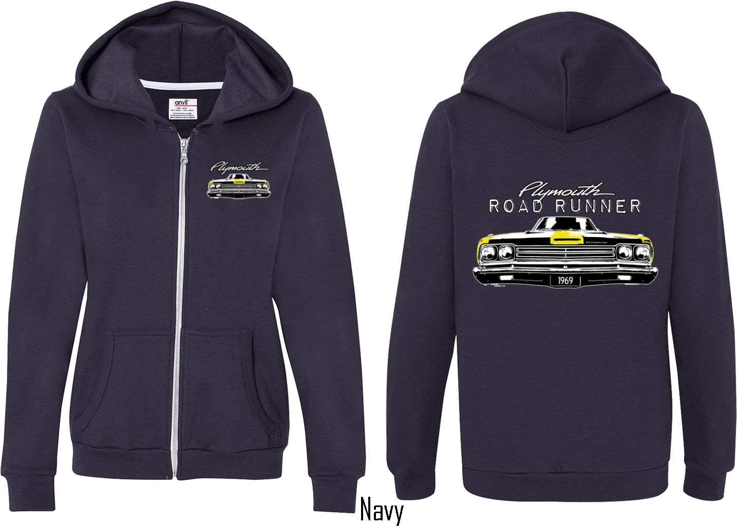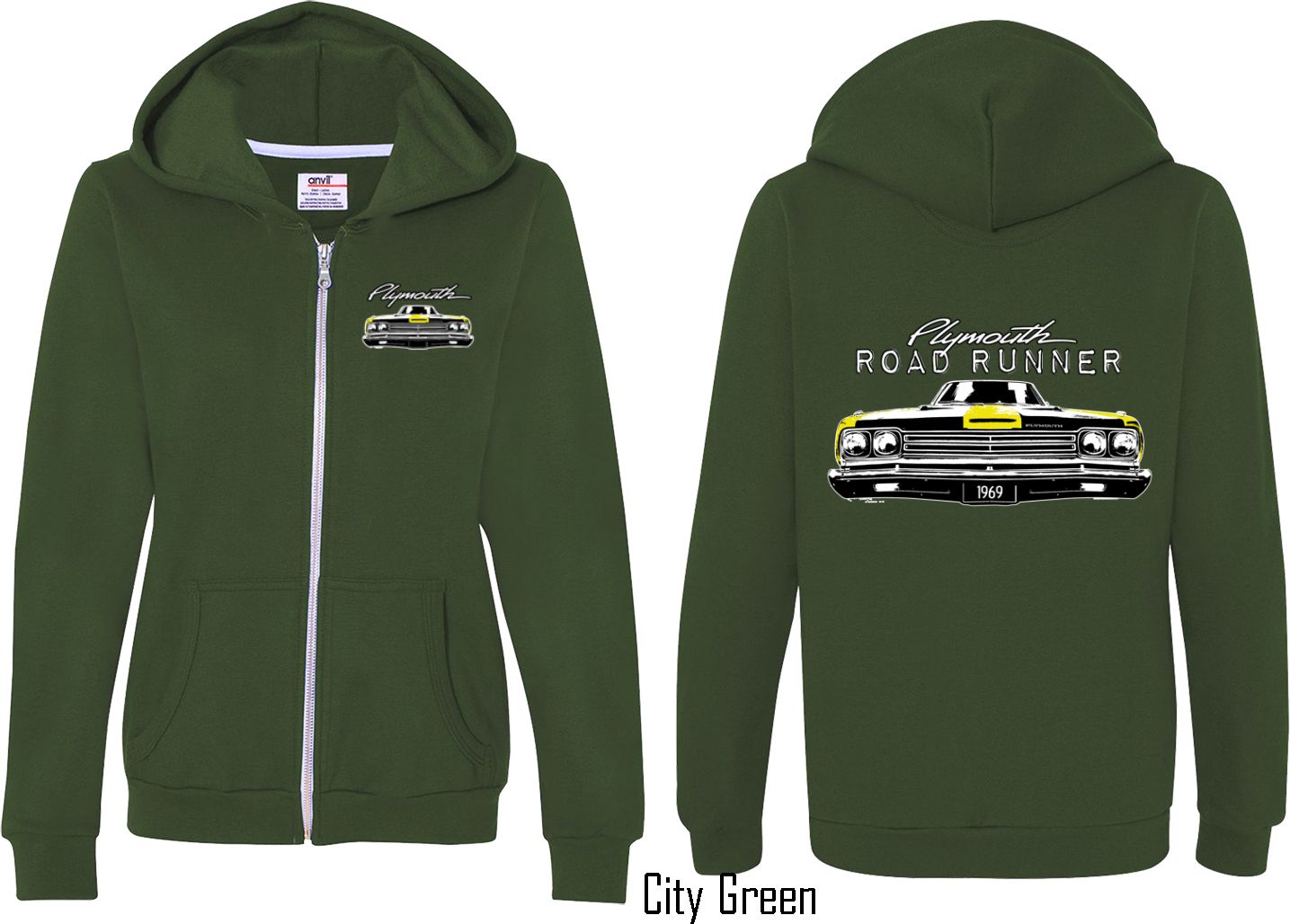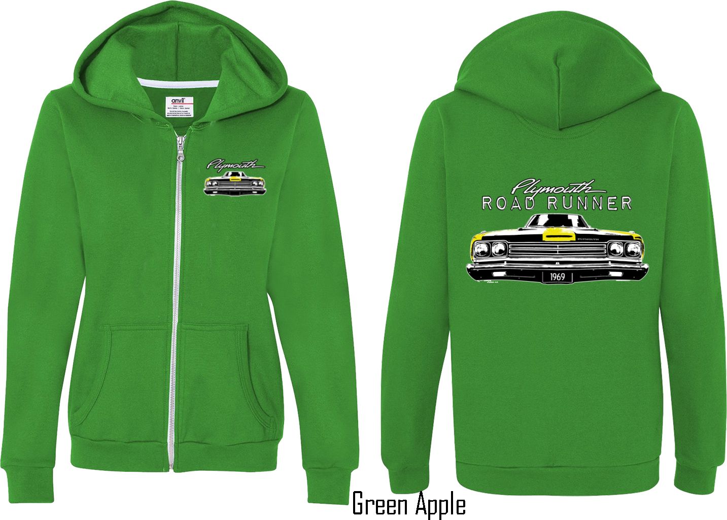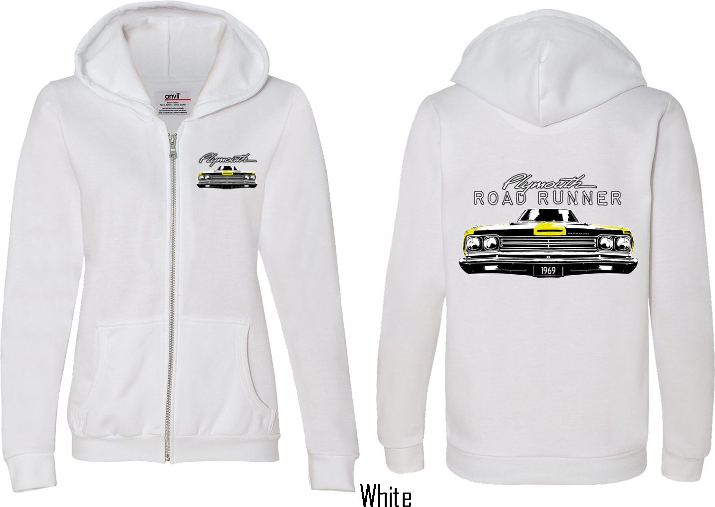 | | Dodge Yellow Plymouth Roadrunner (Front & Back) Ladies Full ZipA ladies full zip hoodie featuring the front end of a yellow 1969 Plymouth Roadrunner on the front and back. Our ladies full zip is made with a blend of cotton/poly. Available in sizes Small through 2XL. Machine wash cold with like colors; dry low heat. ![]() |