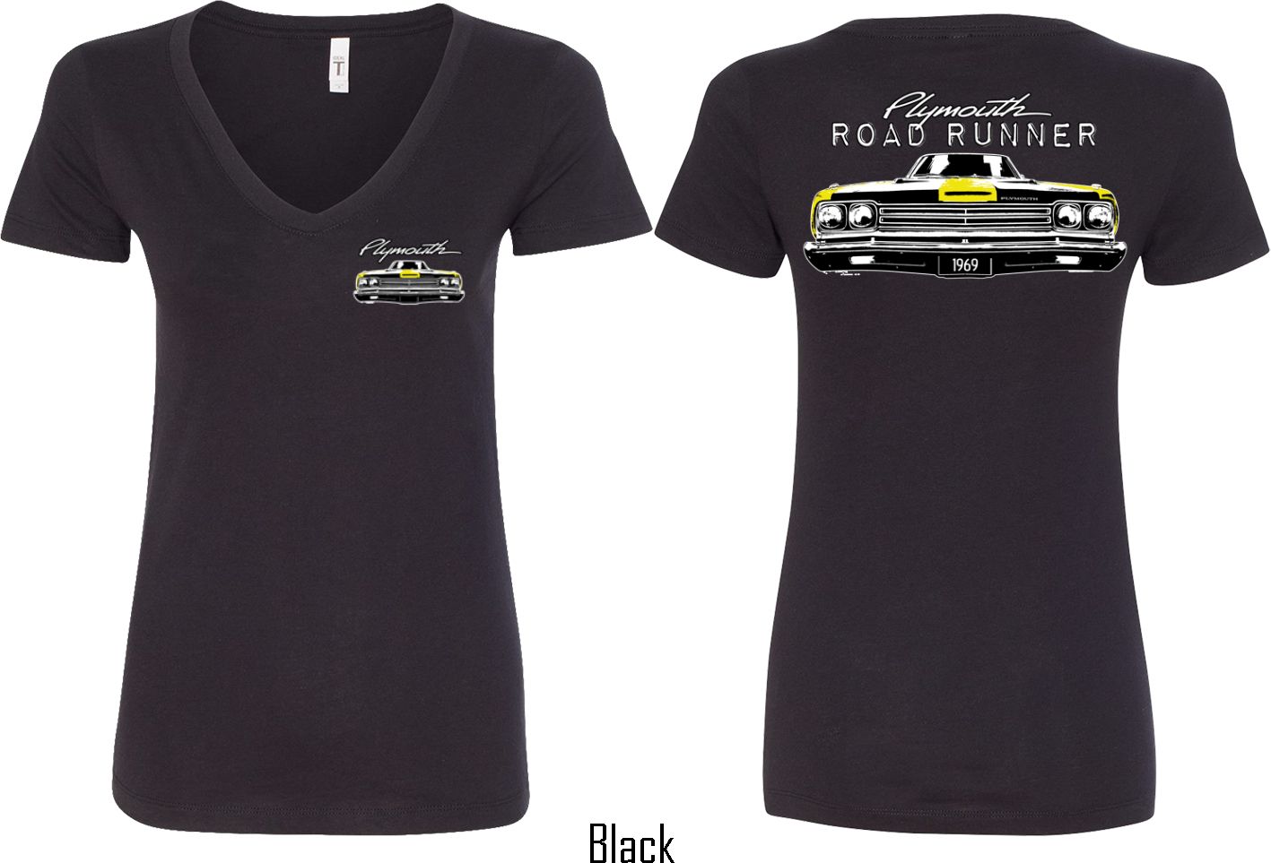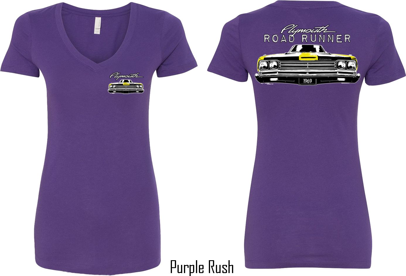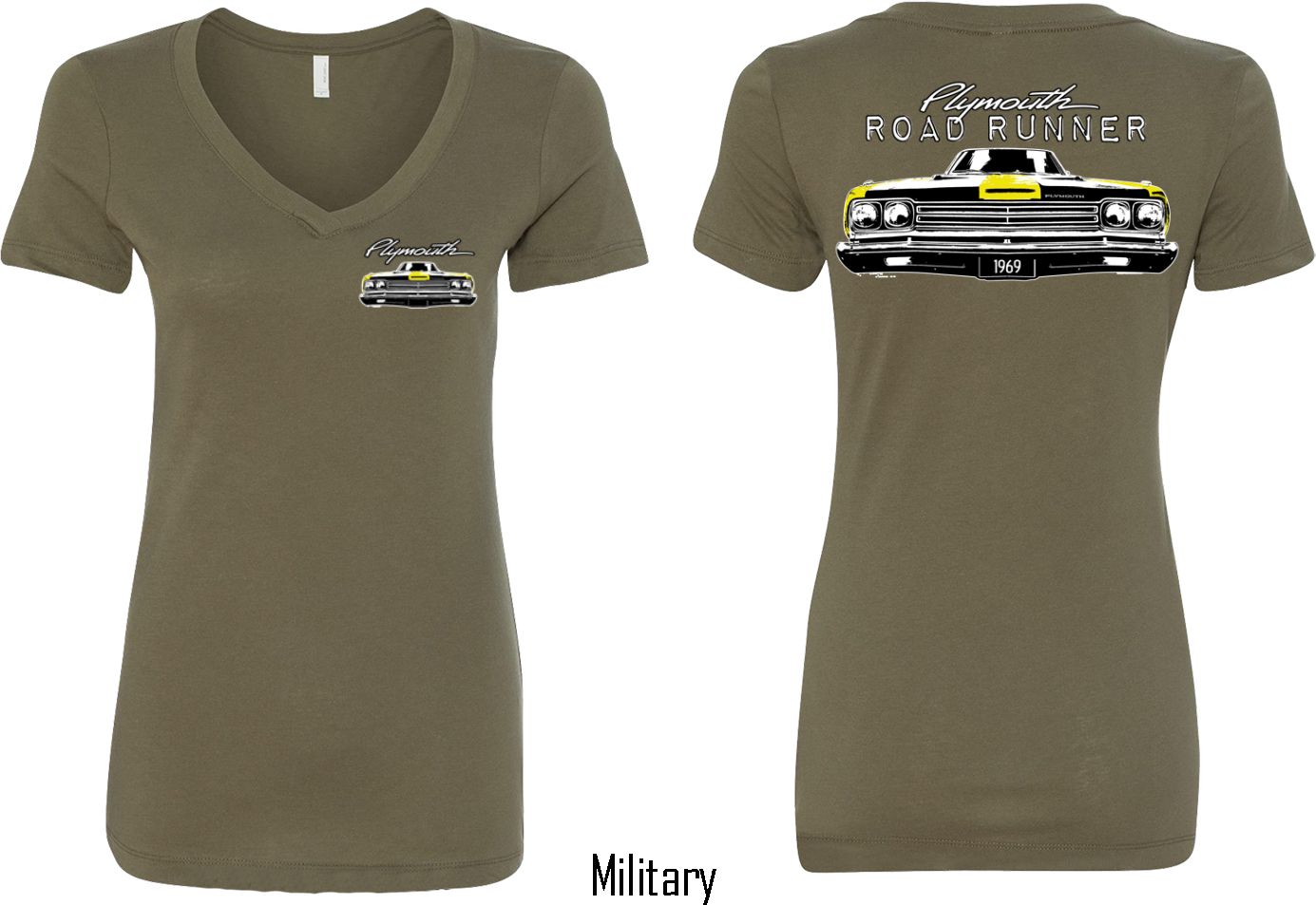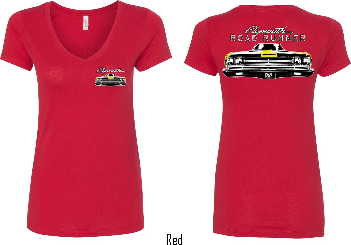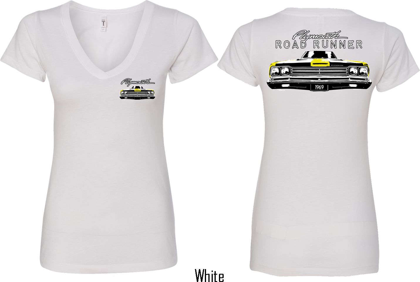 | | Dodge Yellow Plymouth Roadrunner (Front & Back) Ladies V-neckA fitted ladies v-neck featuring the front end of a yellow 1969 Plymouth Roadrunner on the front and back. Our ladies shirt is made with a blend of cotton/poly. Available in sizes Small through 2XL. Machine wash cold with like colors; dry low heat. ![]() |