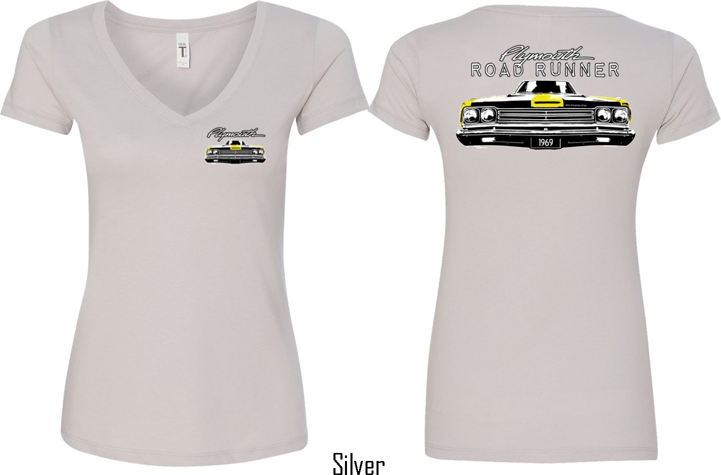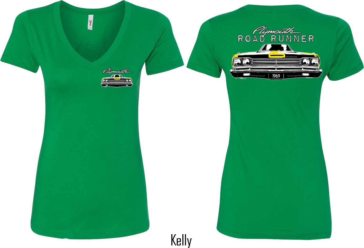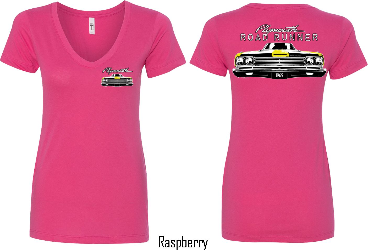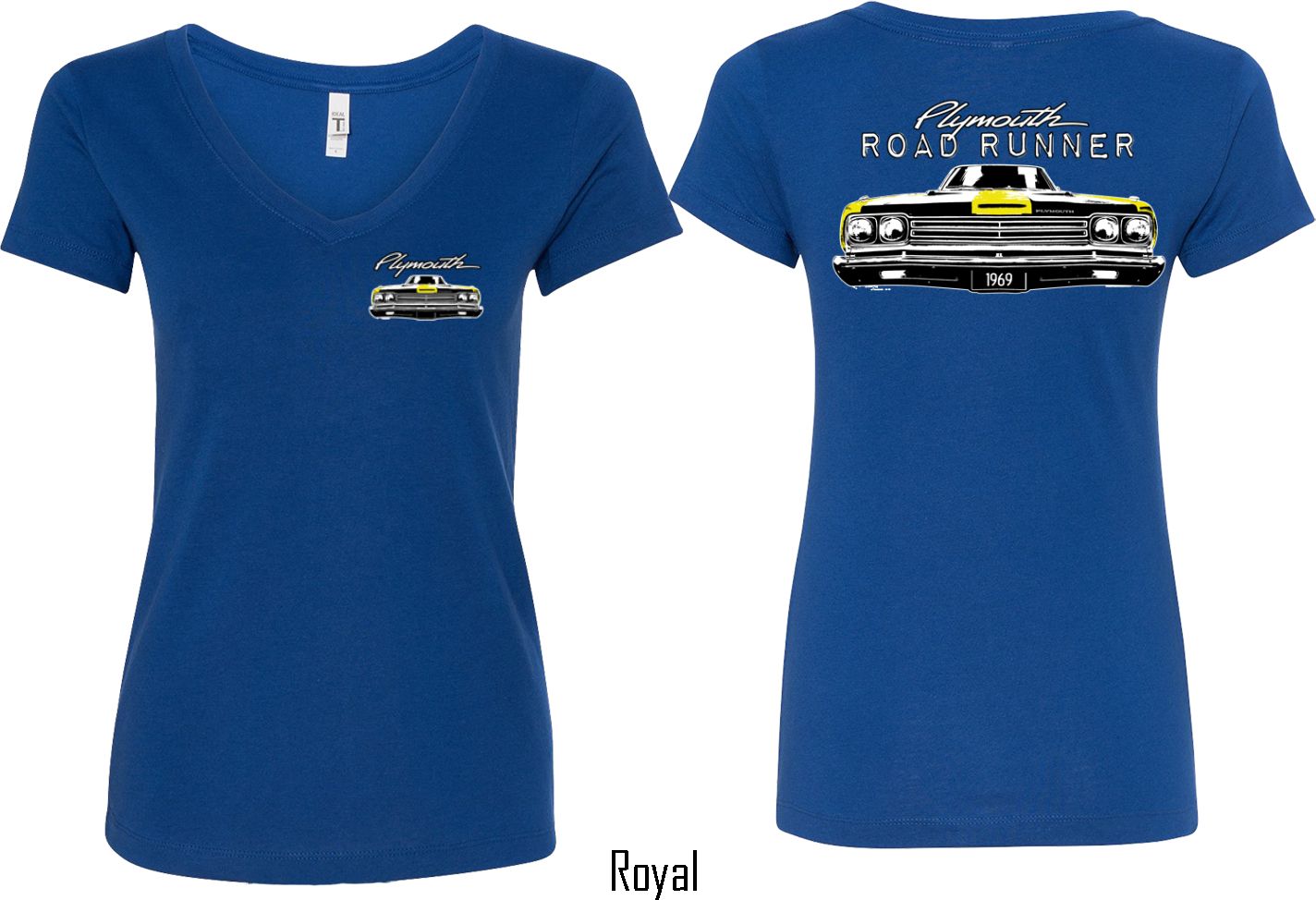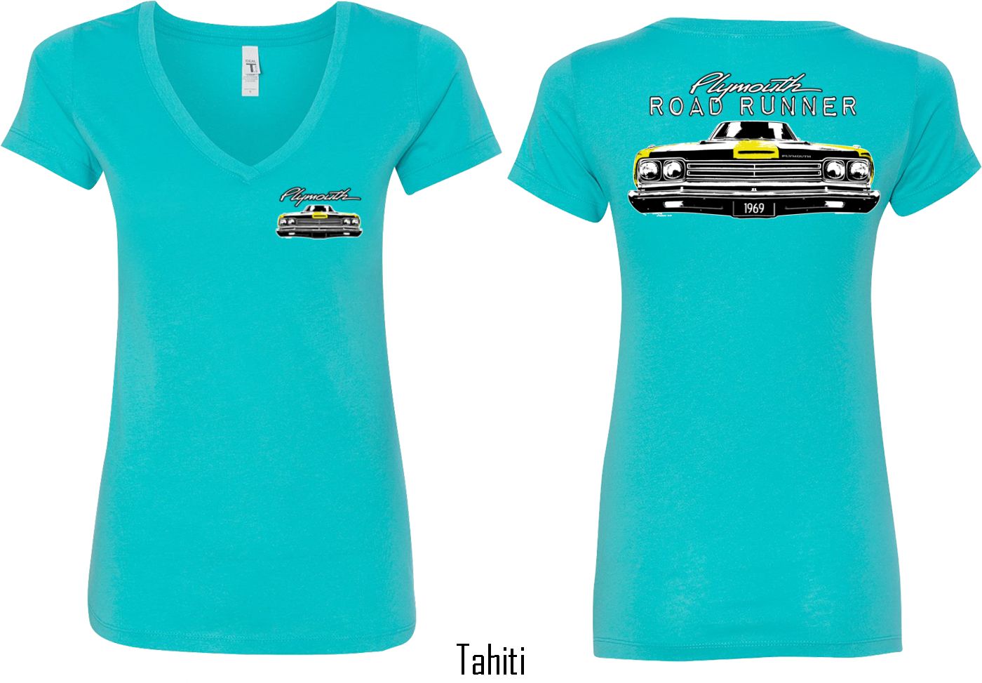 | | Dodge Yellow Plymouth Roadrunner (Front & Back) Ladies V-neckA fitted ladies v-neck featuring the front end of a yellow 1969 Plymouth Roadrunner on the front and back. Our ladies shirt is made with a blend of cotton/poly. Available in sizes Small through 2XL. Machine wash cold with like colors; dry low heat. ![]() |