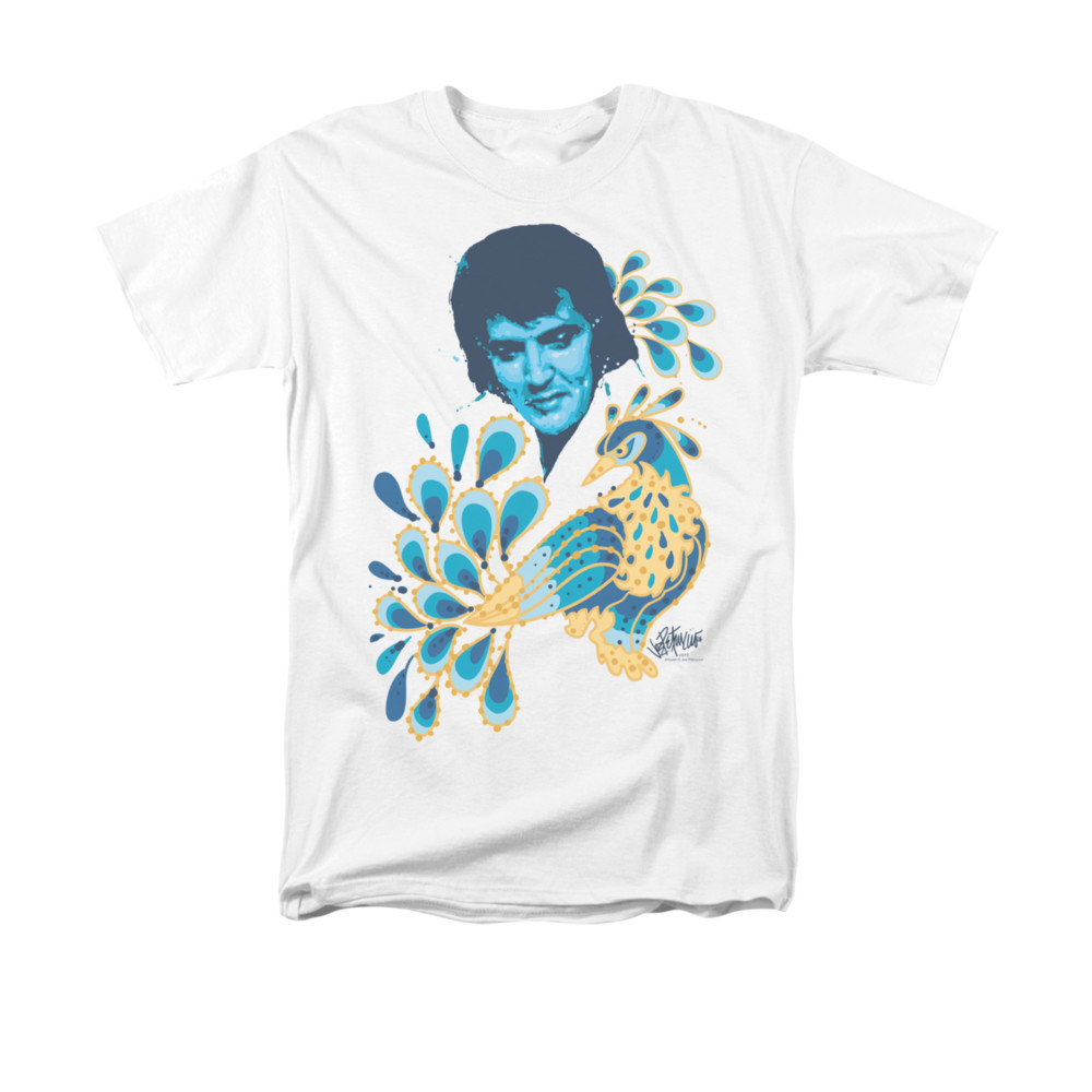 | | Elvis T-shirt - Peacock Classic Unique - WhiteThis Peacock Classic Unique adult white Elvis’ t-shirt exquisitely features a blue facial image of Elvis smiling jet black hair with colorful peacock in graduating shades of blue and golden yellow surrounding him. This tee shirt captures Elvis Presley's most favorite performance costume the peacock jumpsuit his good luck symbol selling at auction for $300,000 the most expensive piece of Elvis memorabilia ever sold at auction. Of course this t shirt would make an impressive gift and or memorabilia celebrating one of Elvis’ most exquisite stage costumes created by designer Bill Belew. Available in Small, Medium, Large, XL and 2XL |