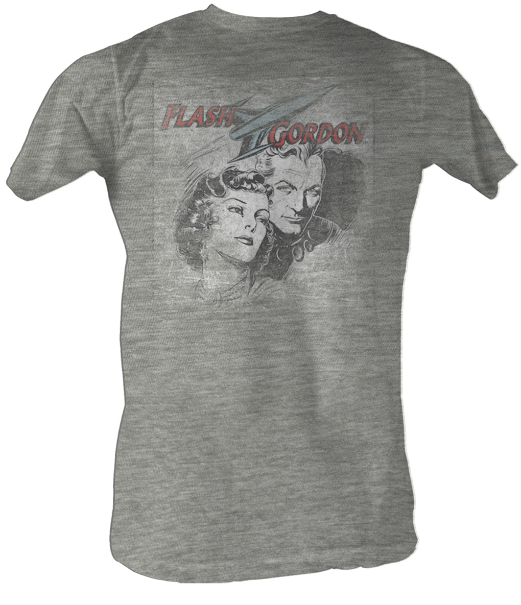 | | Flash Gordon T-Shirt - Flash Head Adult Gray Heather Tee ShirtThis 100% cotton Gray Heather t-shirt has a distressed style image of the iconic comic book hero Flash Gordon with his constant companion and true love Dale Arden. The early comic strips of Flash had him fighting to save Dale from the love interests of the evil Ming the Merciless. This is an officially licensed Flash Gordon t shirt. Available in Small, Medium, Large, XL, 2XL! Officially Licensed! |