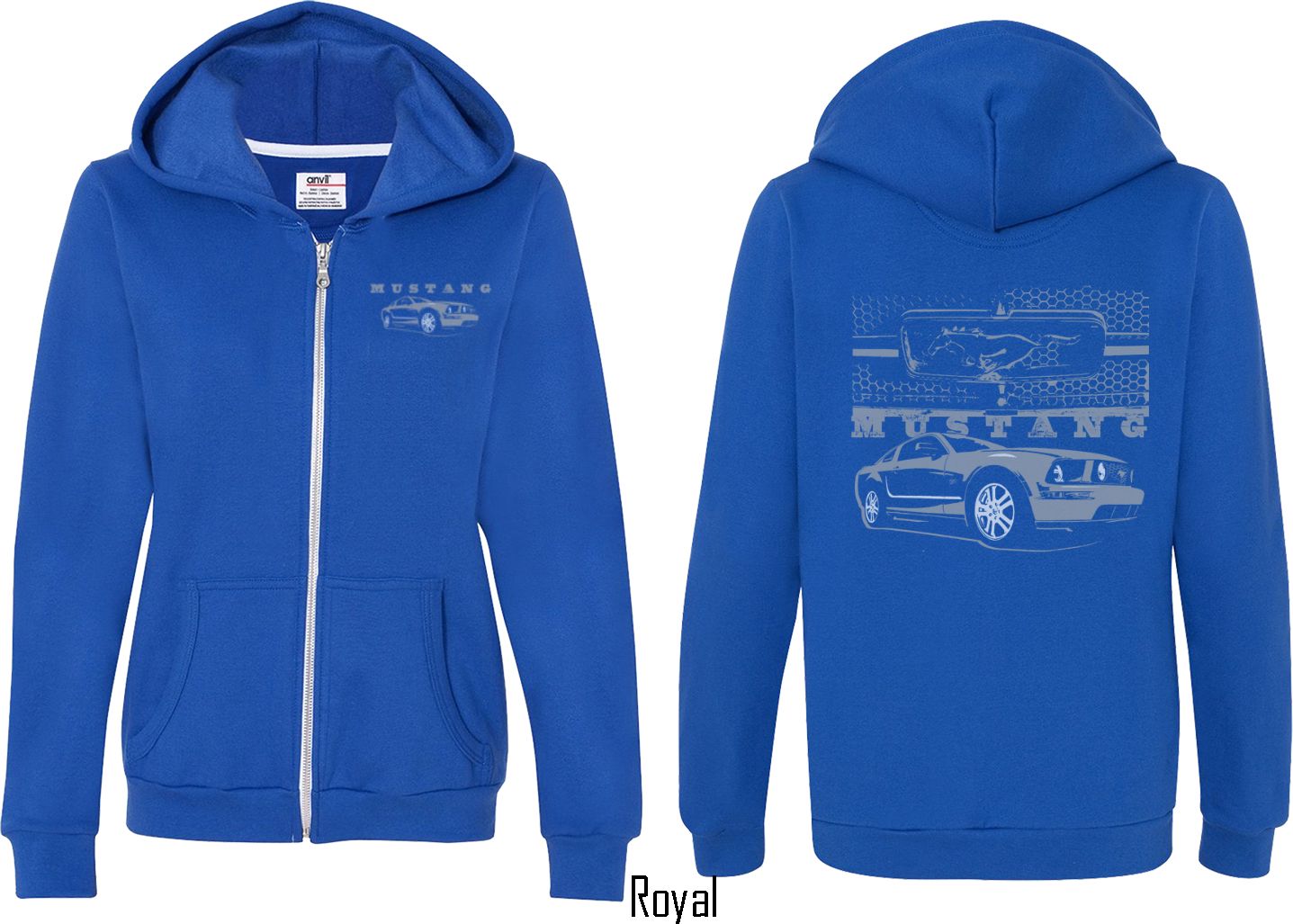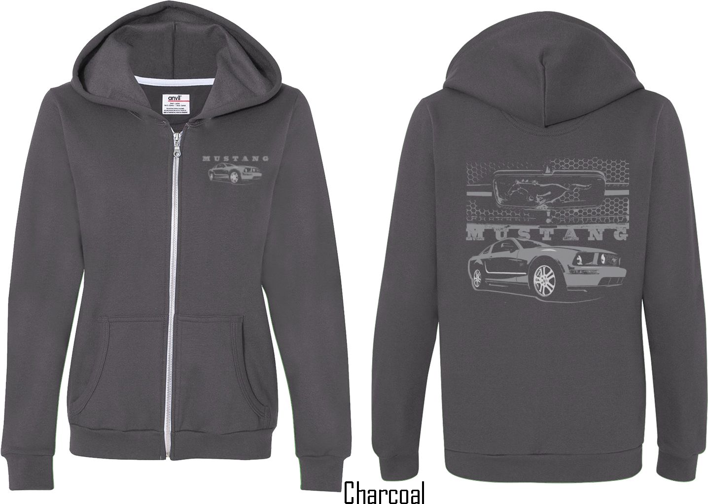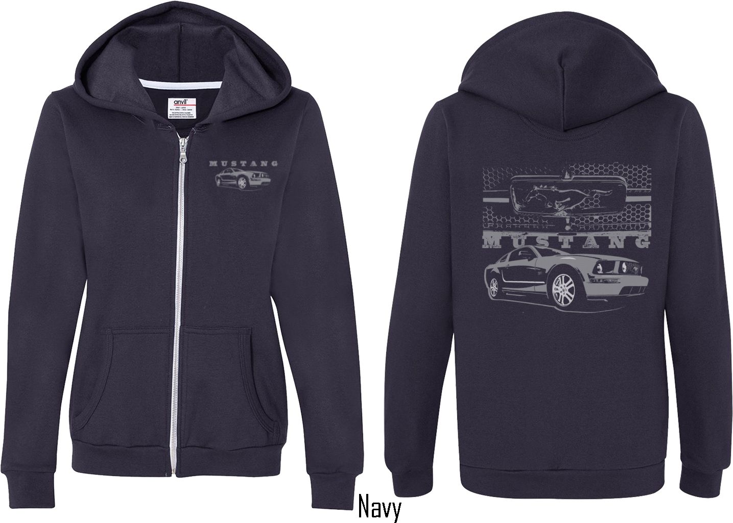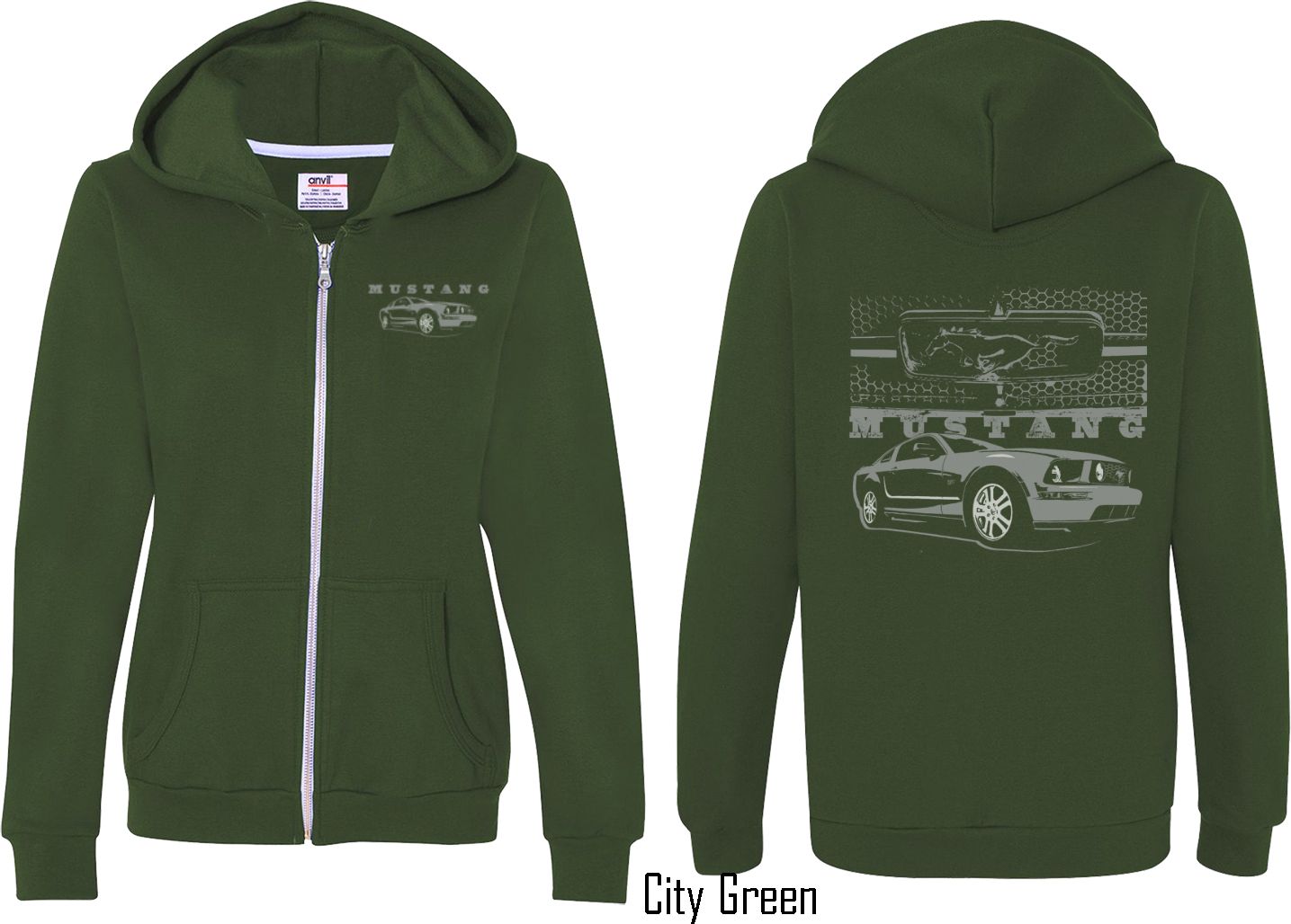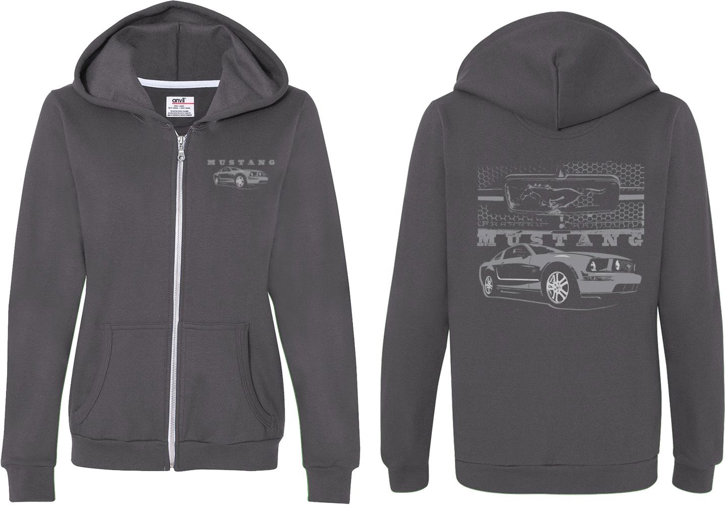 | | Ford Mustang with Grill (Front & Back) Ladies Full Zip HoodieA ladies full zip hoodie featuring a Ford Mustang on the front and a Mustang with the infamous Honeycomb Grill on the back. This ladies full zip makes an awesome gift for all Ford car enthusiasts! Our ladies full zip hoodie is made with a blend of cotton/poly. Available in sizes Small through 2XL. Machine wash cold with like colors; dry low heat. ![]() |