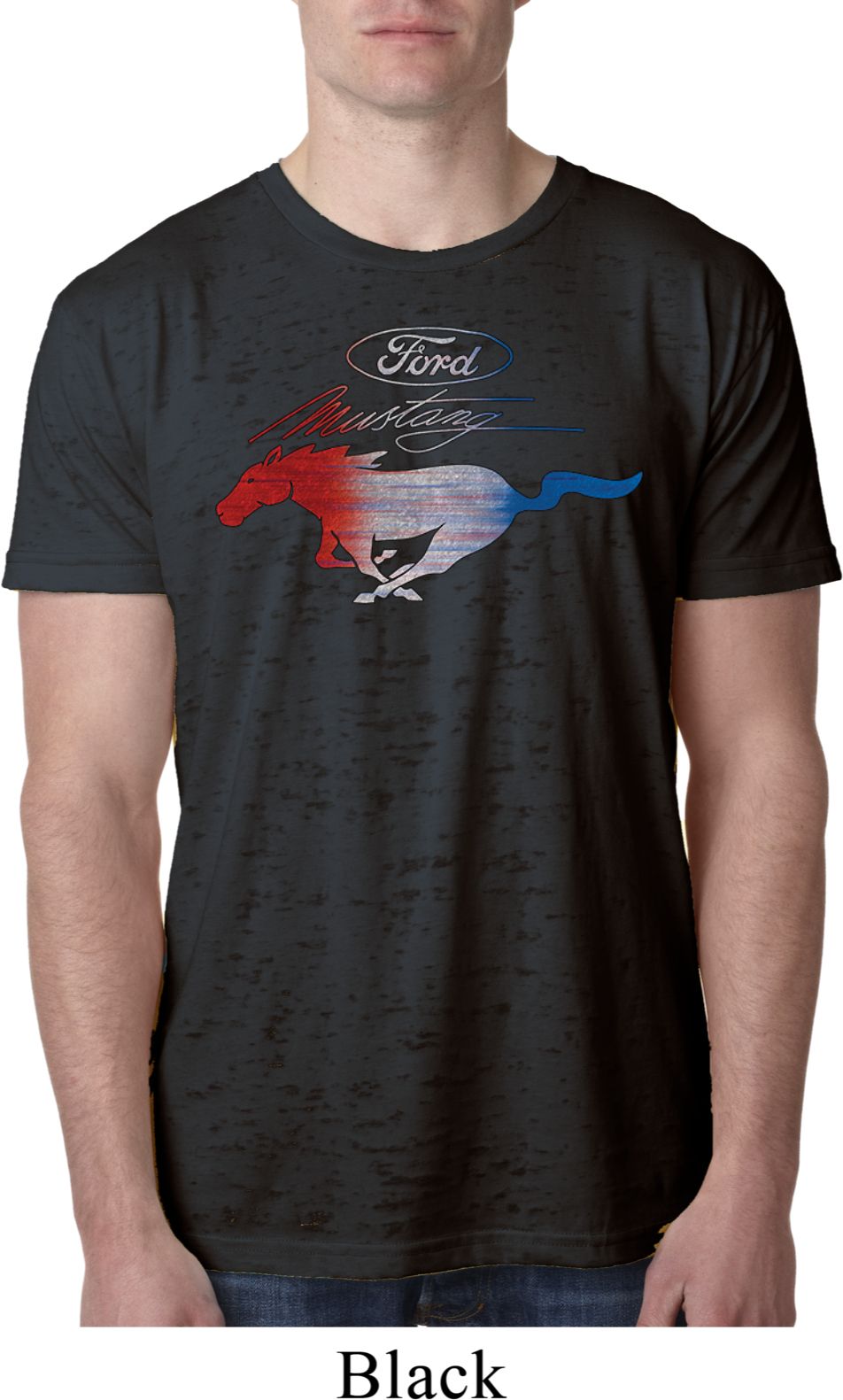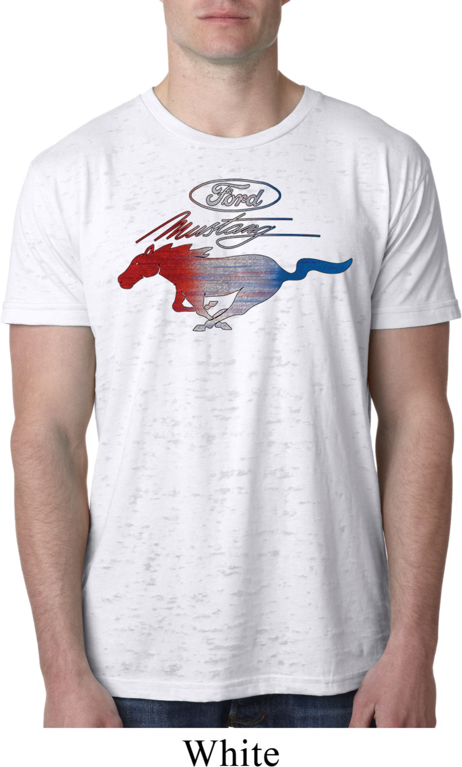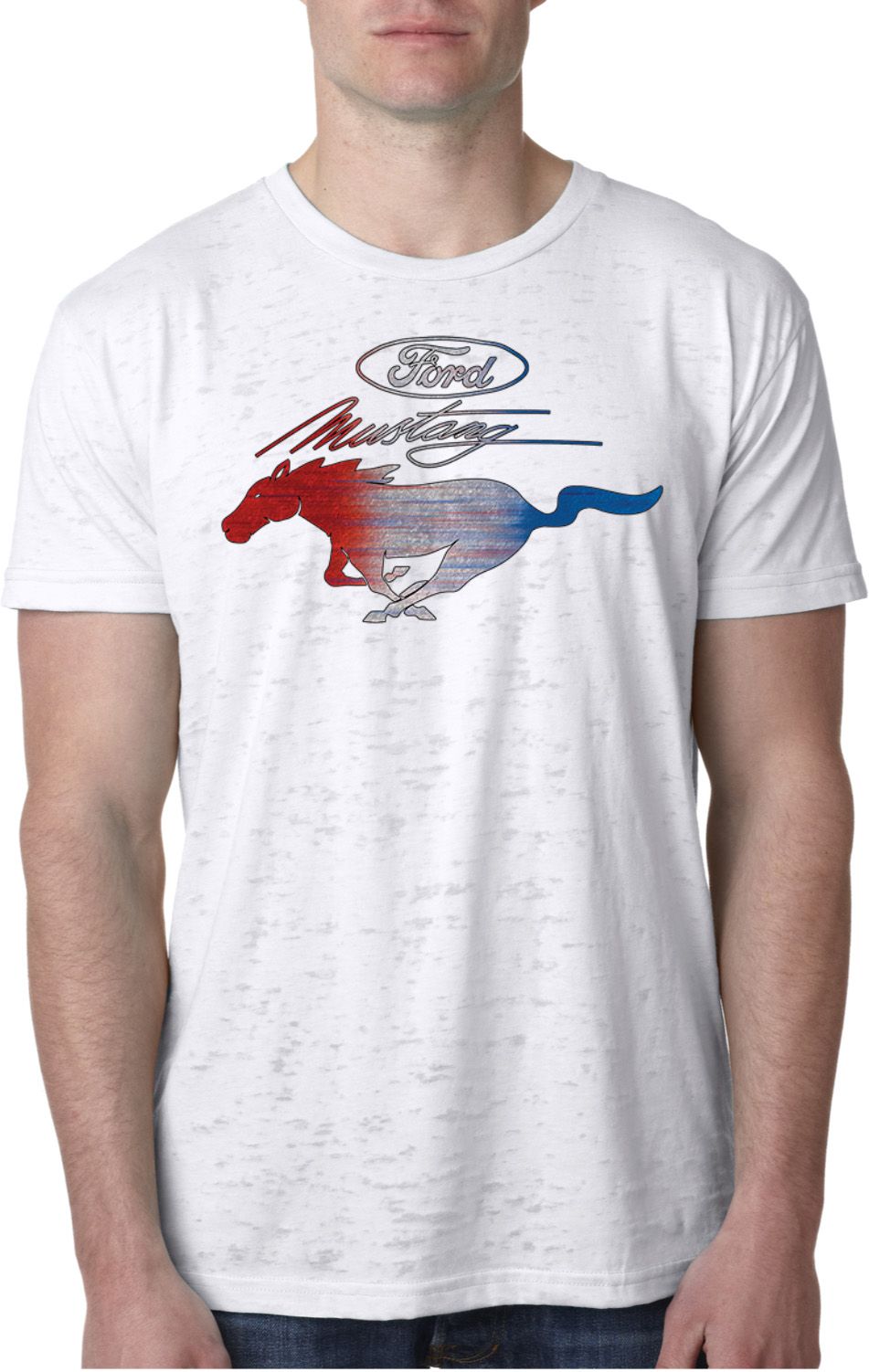 | | Ford Tee Mustang Red White and Blue Burnout ShirtA mens burnout tee featuring a distressed Ford Mustang Logo in red, white, and blue. Our mens tee is made with a blend of cotton/poly. A perfect gift for all Ford Car Enthusiasts! Available in sizes Small through 2XL. Machine wash cold with like colors; dry low heat. ![]() |
