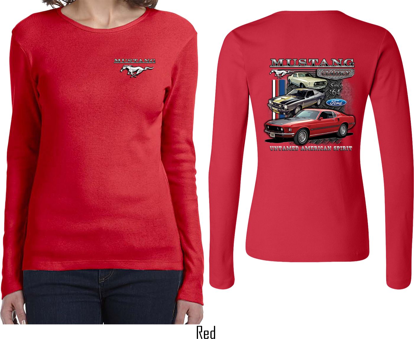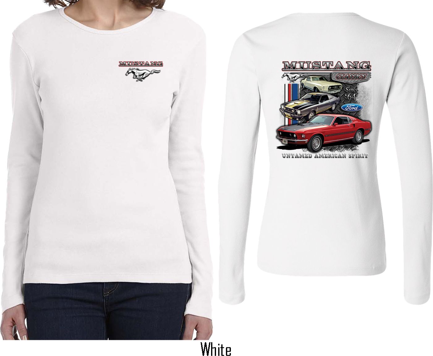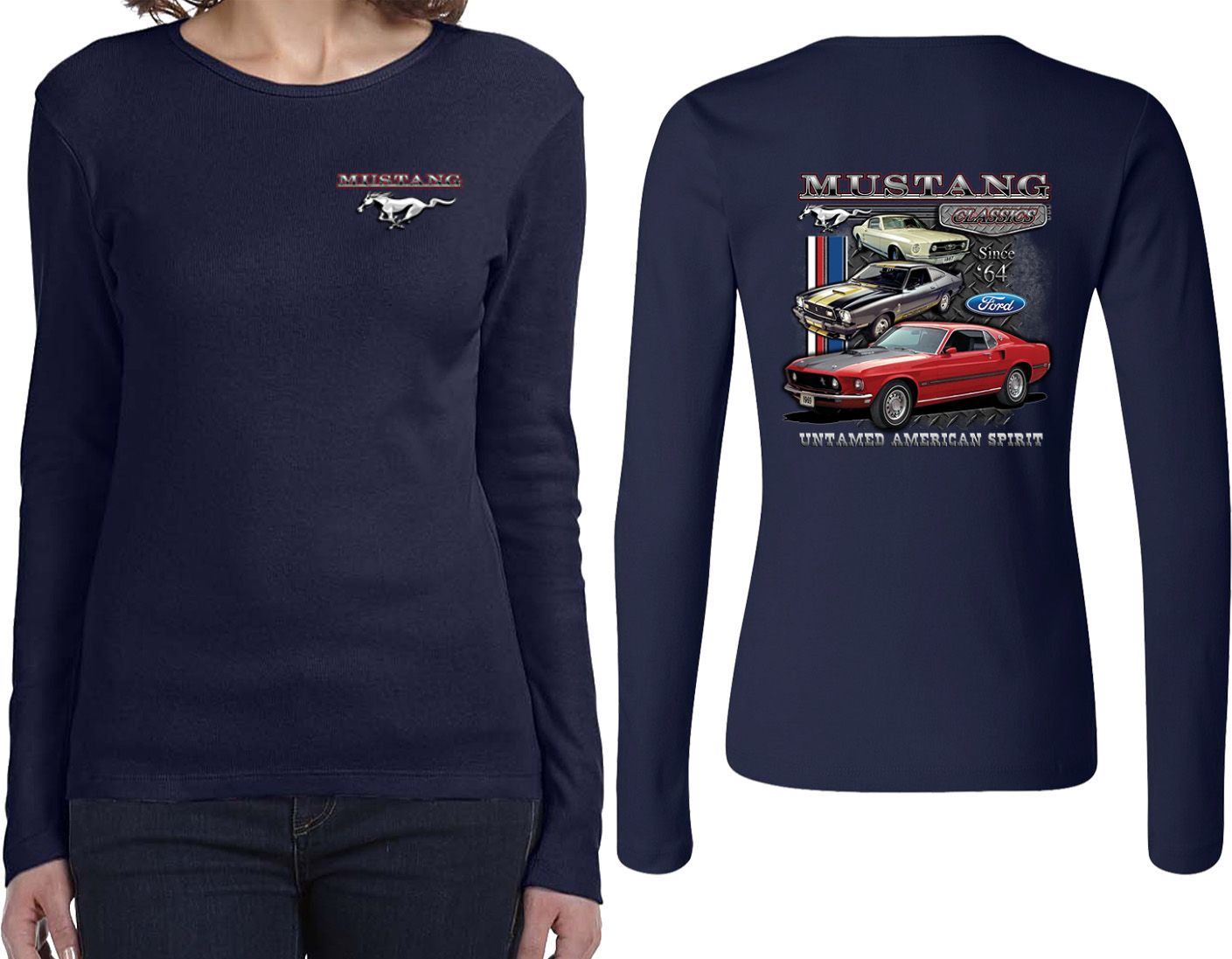 | | Ford Tee Mustangs Untamed (Front & Back) Ladies Long SleeveA ladies long sleeve featuring Mustang on the front and Ford Mustang Classics since 1964, Untamed American Spirit on the back. This cool tee makes an awesome gift for all Ford car enthusiasts! Our ladies shirt is made of 100% cotton. (Deep Heather is made with a blend of cotton/poly) Available in sizes Small through 2XL. Machine wash cold with like colors; dry low heat. ![]() |