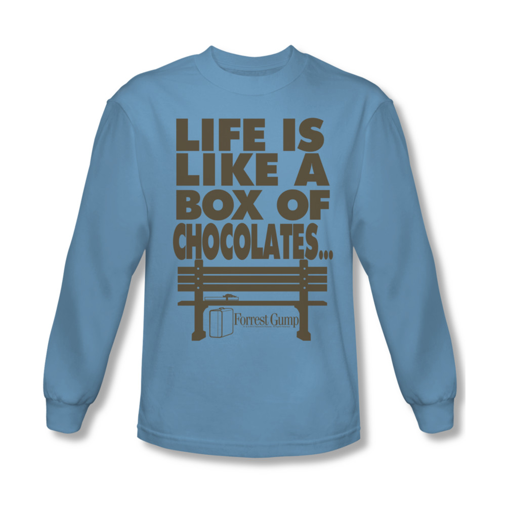 | | Forrest Gump Shirt Life Long Sleeve Carolina Blue Tee T-ShirtForrest Gump Shirt Life Long Sleeve Carolina Blue Tee T-Shirt Officially Licensed Available in Small, Medium, Large, XL, 2XL Our Forrest Gump shirts is a classic movie film perfect for any fans of this movie. ![]() |
