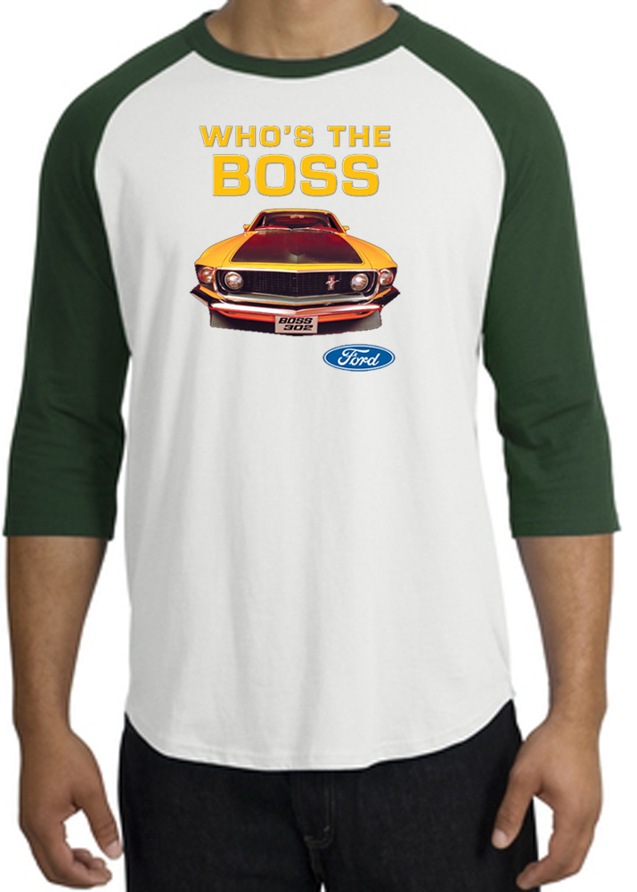 Ford Mustang Boss Raglan Shirt - Who's The Boss 302 White/ForestFord Mustang Boss Raglan Shirt - Who's The Boss 302 White/Forest