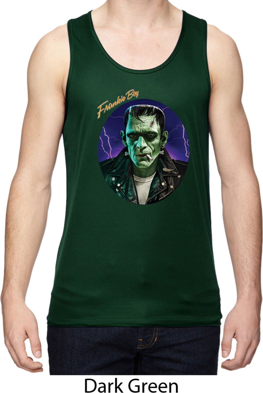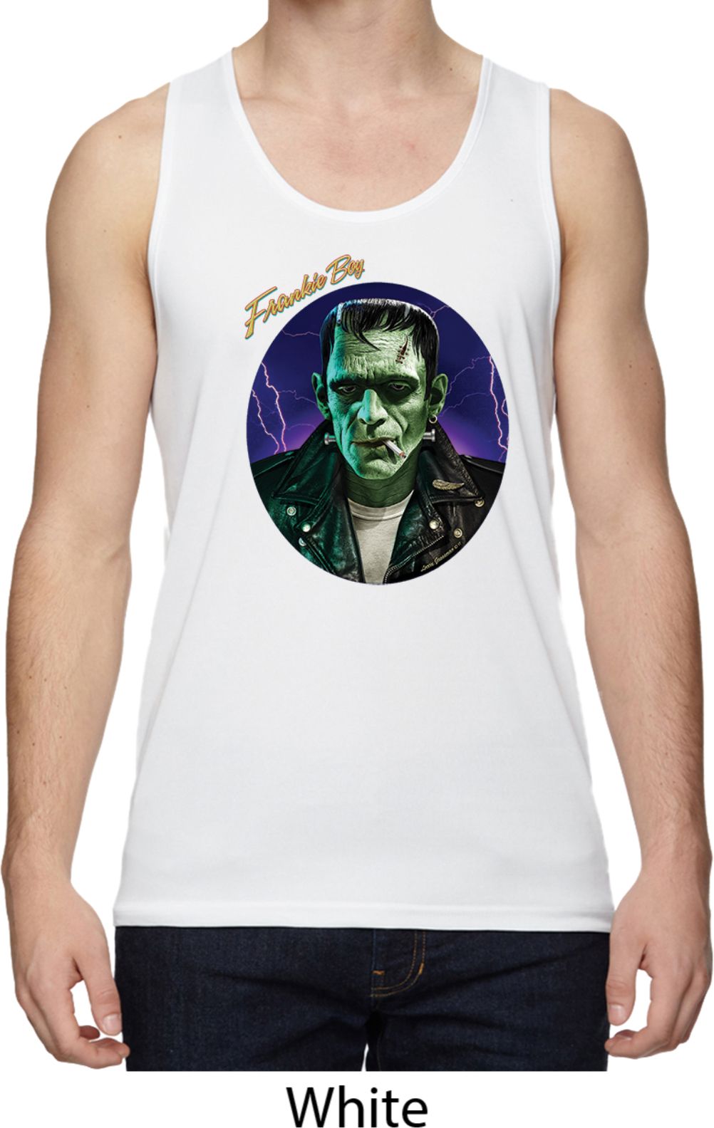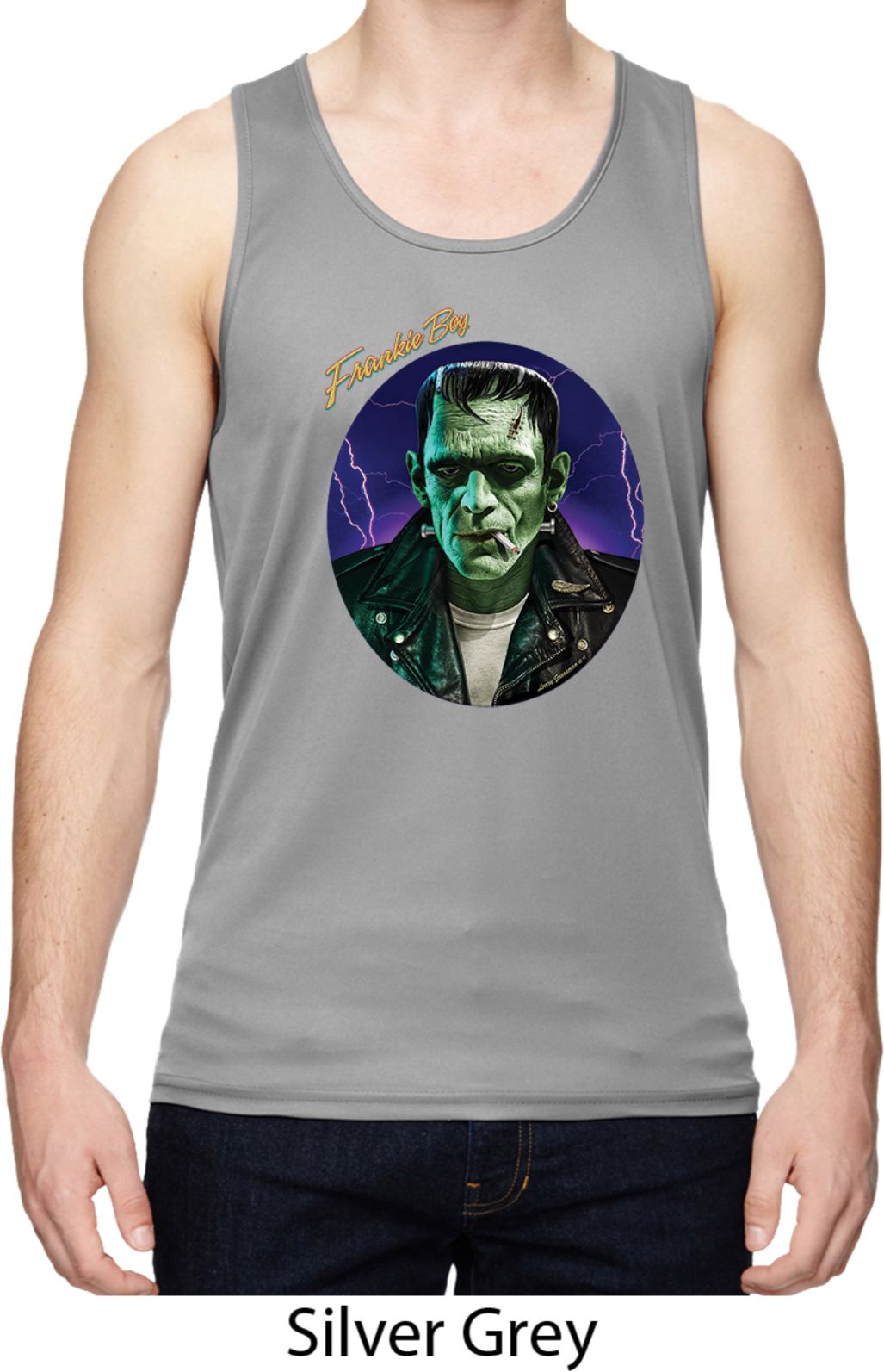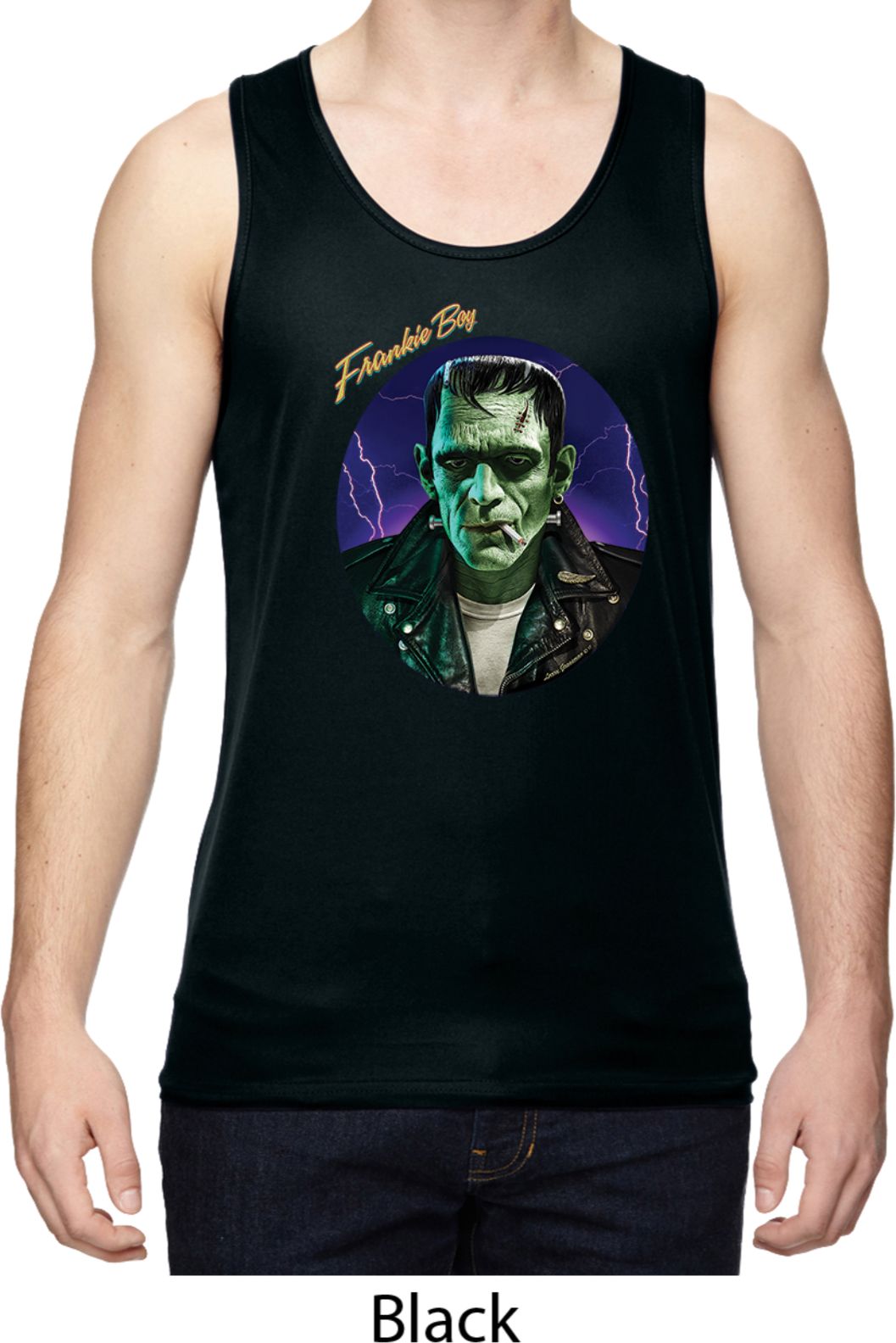 | | Frankenstein Tank Top Frankie Boy Dry Wicking TanktopA mens moisture wicking tanktop featuring a cool portrait of Frankie Boy smoking his cigarette and lightning in the distance. Our mens tank top is made of 100% polyester. A perfect gift for all Frankenstein fans! Available in sizes Small through 3XL. Machine wash cold with like colors; dry low heat. |