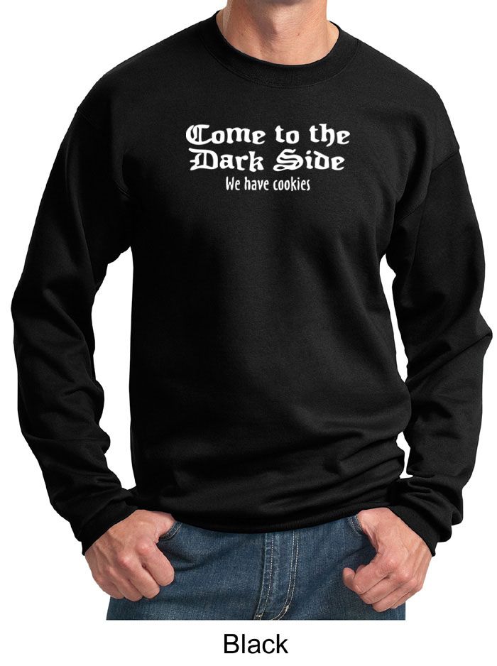 | | Funny Sweatshirt Come To The Dark Side We Have Cookies SweatshirtAn awesome adult sweatshirt. Available in sizes Small, Medium, Large, XL, 2XL, 3XL, & 4XL Also available in colors Dark Chocolate Brown, Black, Cardinal, Dark Green, Kelly Green, Maroon, Navy, Orange, Purple, Red, & Royal |