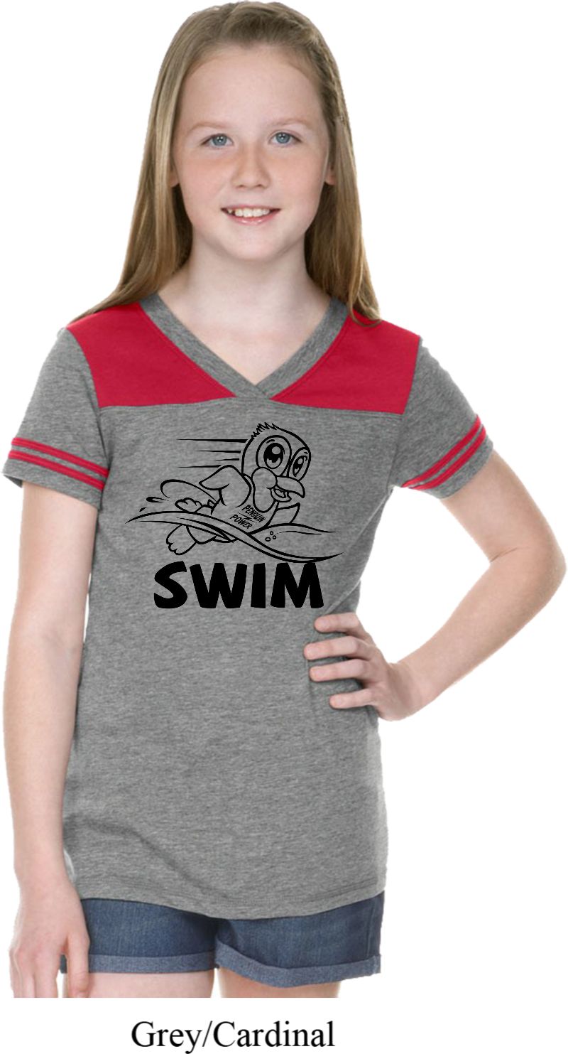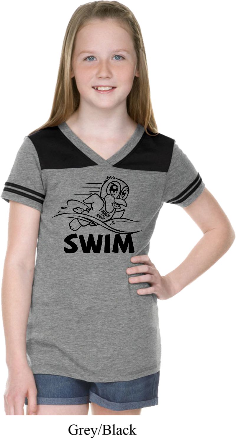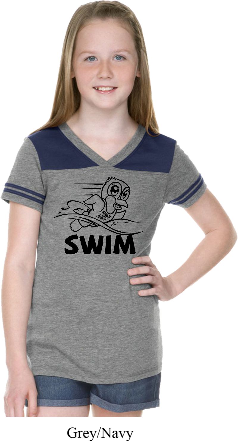 | | Girls Black Penguin Power Swim Football TeeA girls contrast v-neck shirt featuring a penguin power swim design. Our girls tee makes a perfect gift for swimmers who love penguins. Made with a blend of cotton/poly. Available in sizes Small through XL. Machine wash cold with like colors; dry low heat. ![]() |