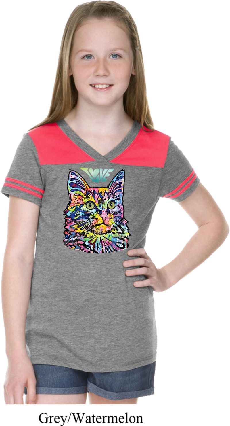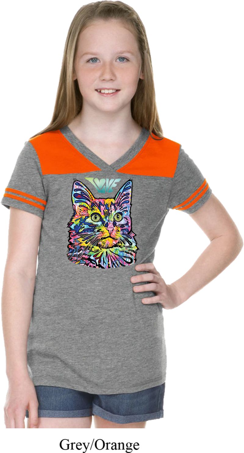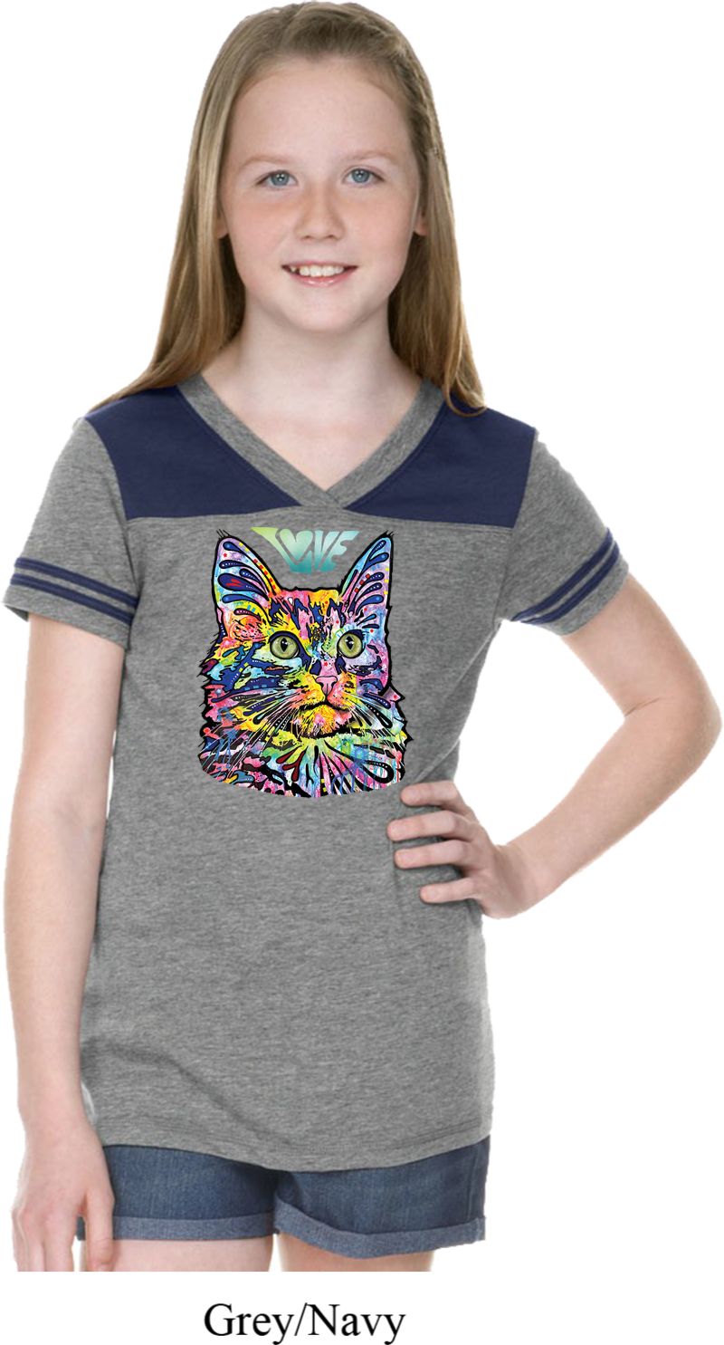 | | Girls Cat Tee Love Cat Football ShirtA cute girls v-neck featuring a colorful cat portrait with Love written above. Our girls shirt makes a perfect gift for cat lovers! Made with a blend of cotton/poly. Available in sizes Small through XL. Machine wash cold with like colors; dry low heat. ![]() |