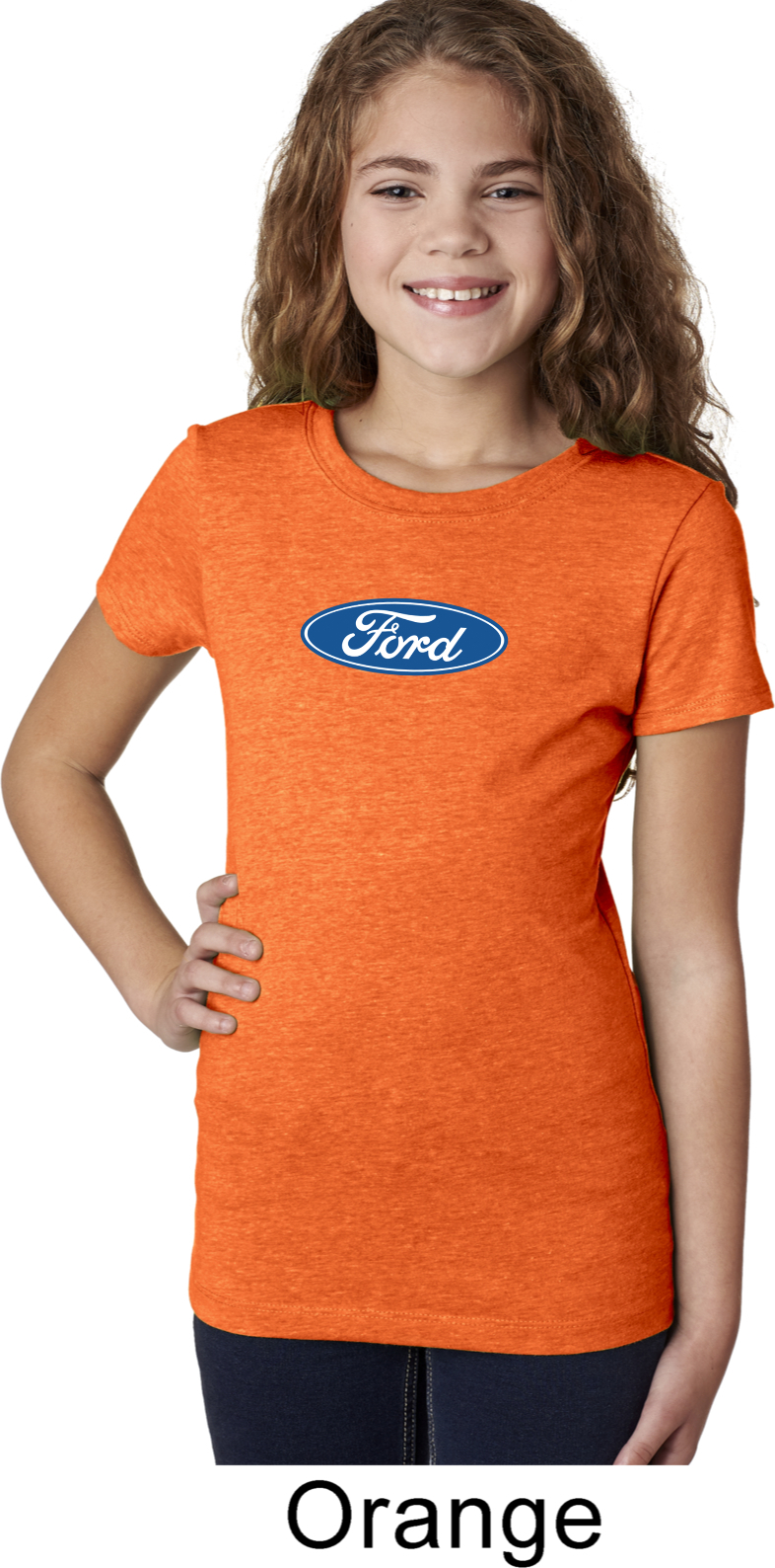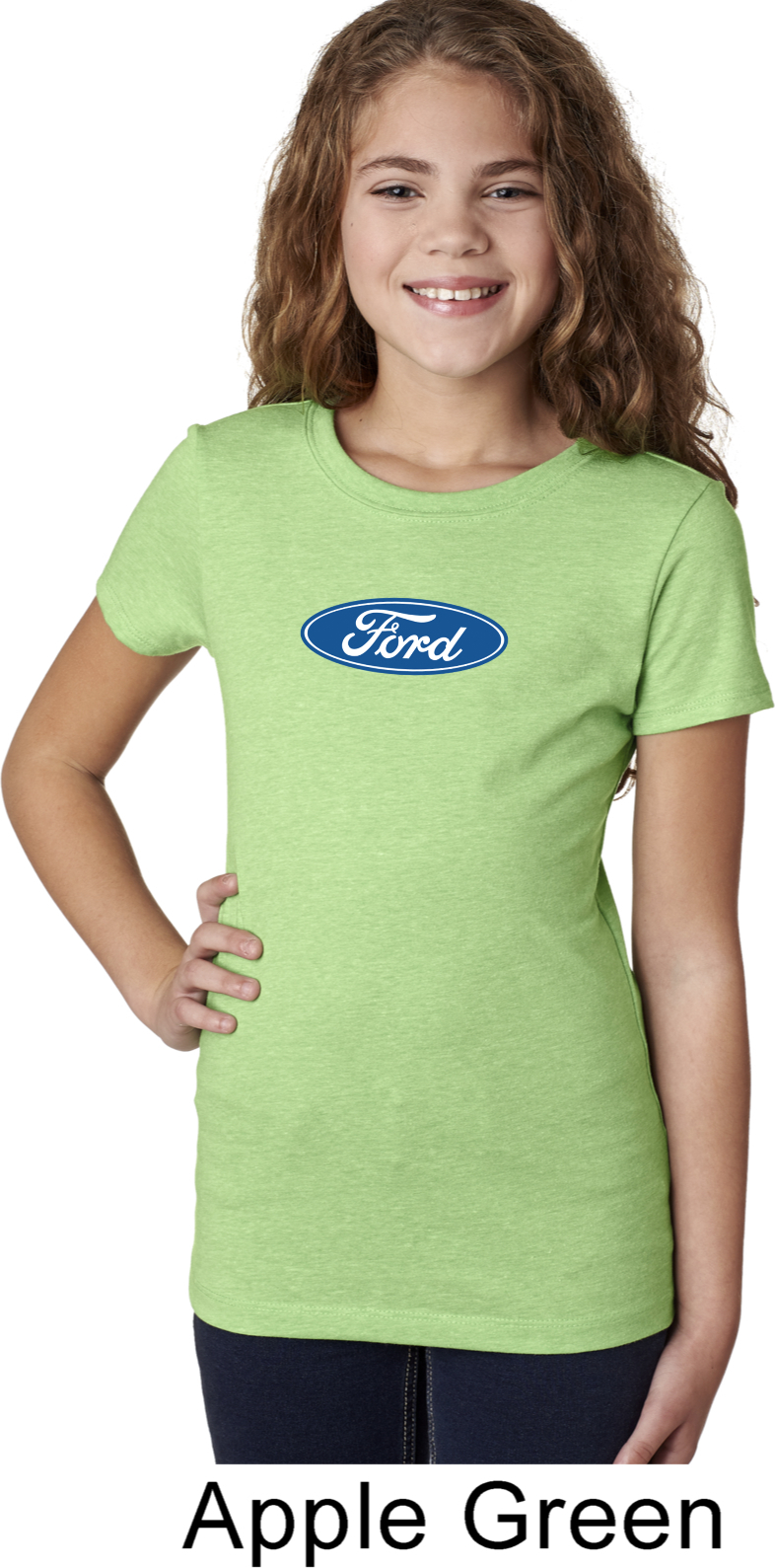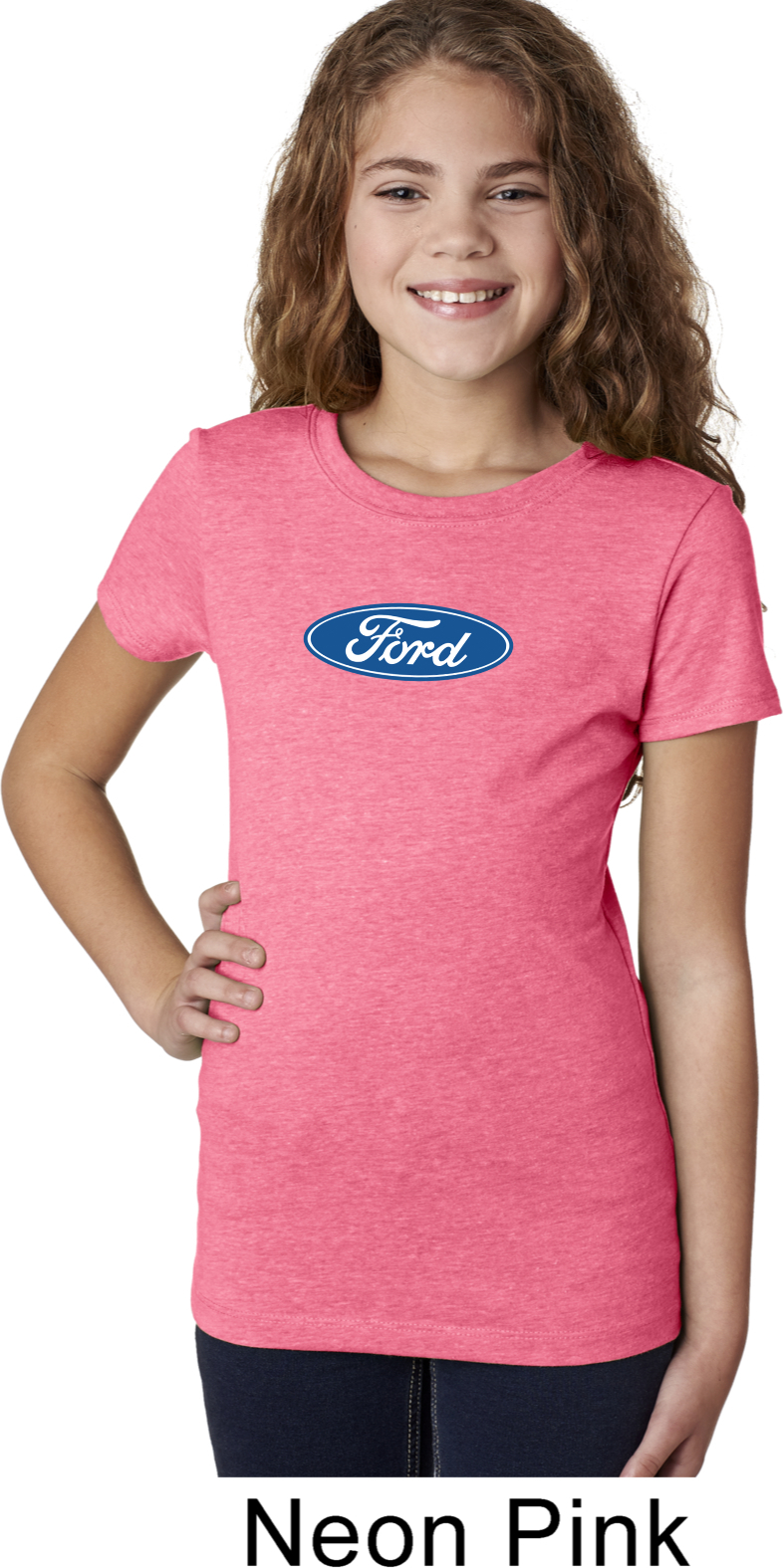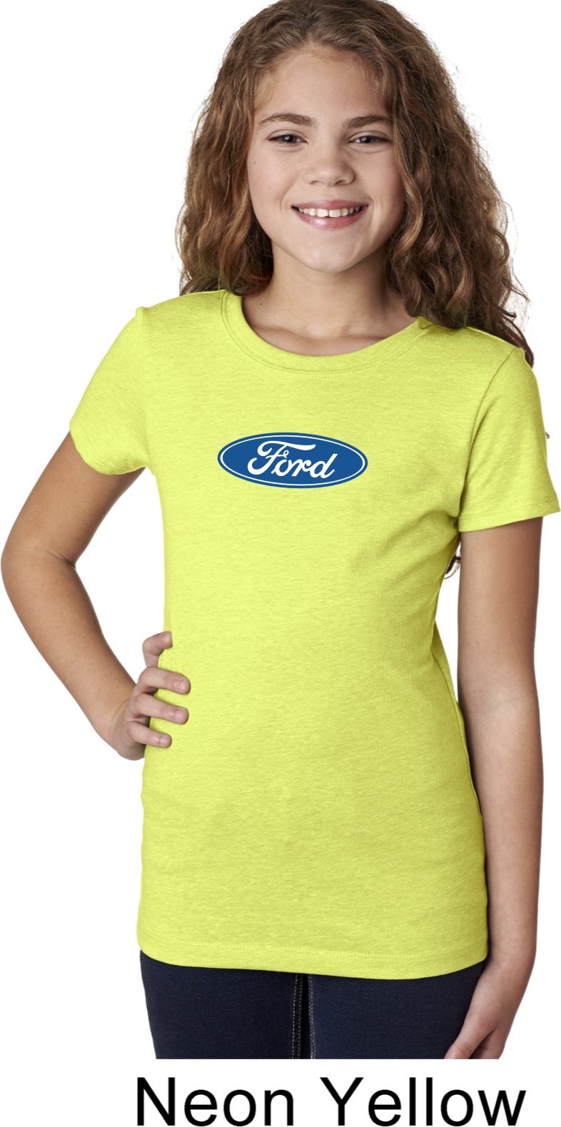 | | Girls Ford Shirt Ford Oval Middle Print Tee T-ShirtGirls Ford Shirt Ford Oval Middle Print Tee T-Shirt A cotton/poly blend Available in Youth XS, Youth Small, Youth Medium, Youth Large & Youth XL Also available in colors Apple Green, Banana Cream, Bondi Blue, Ice Blue, Lilac, Mint, Neon Green, Neon Orange, Neon Pink, Neon Yellow, Orange, Purple, Raspberry, and Silk |