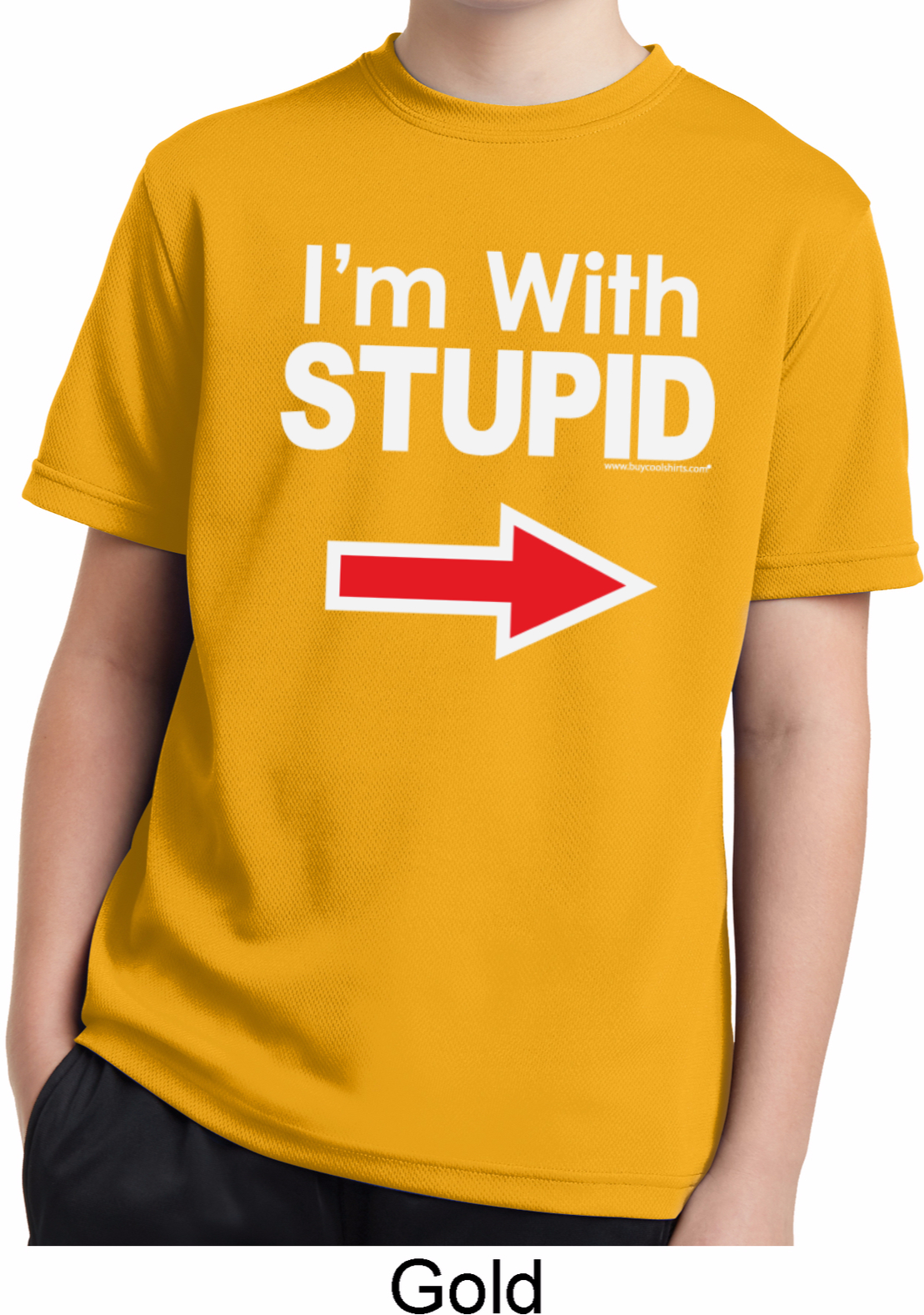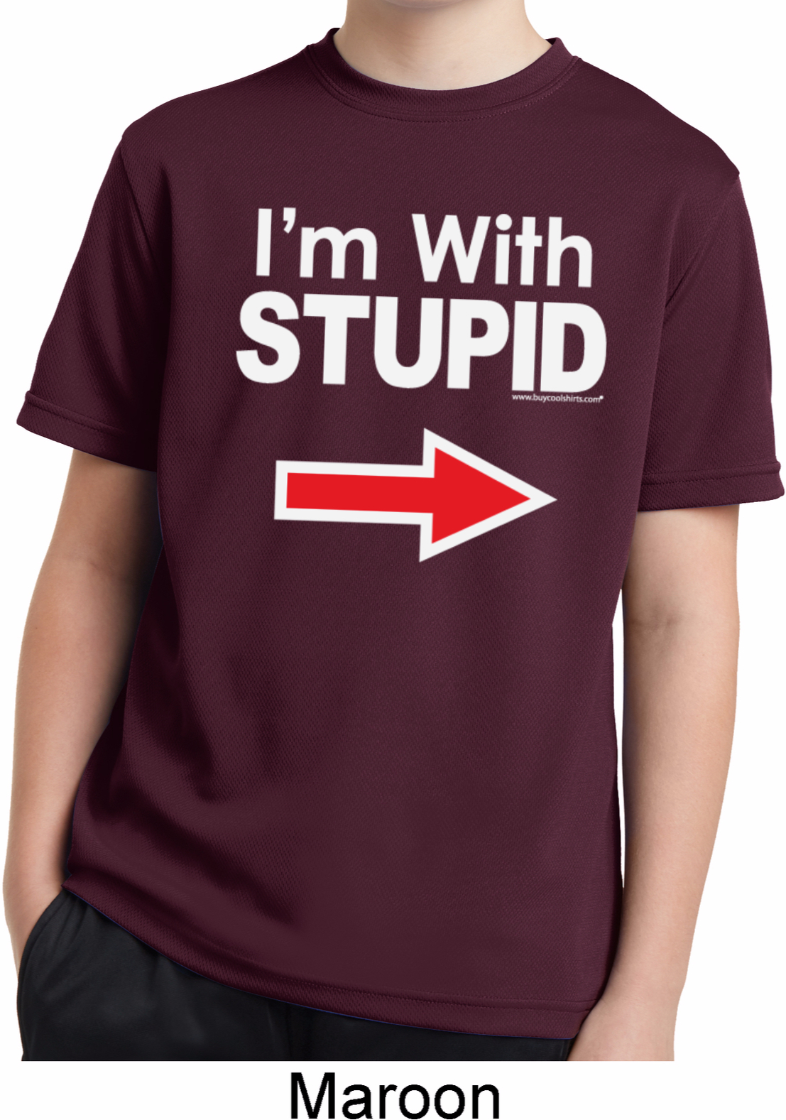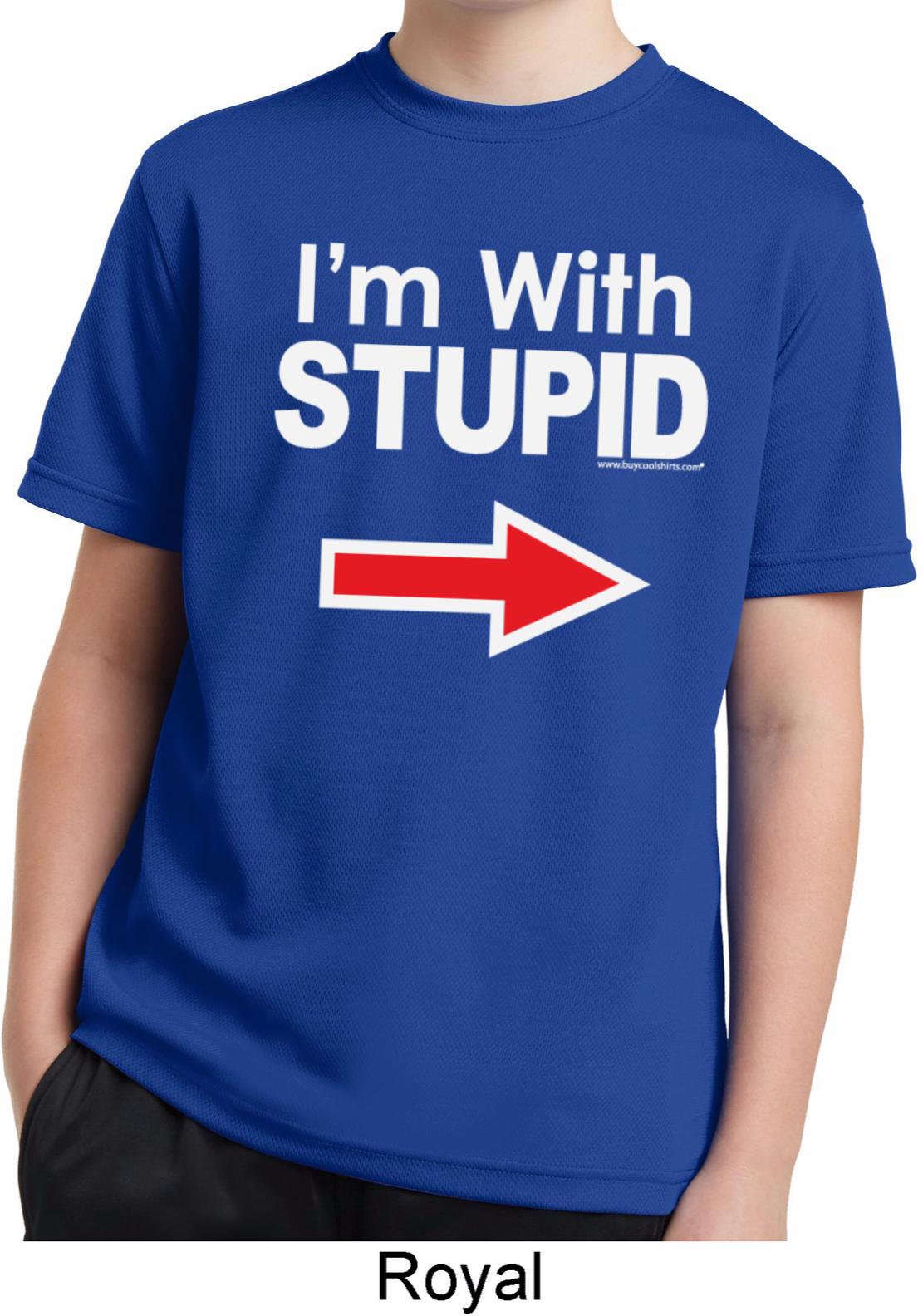 | | I'm With Stupid White Print Kids Moisture Wicking ShirtI'm With Stupid White Print Kids Moisture Wicking Shirt A funny shirt to wear with friends and family 100% Polyester Available in Youth Small, Youth Medium, Youth Large & Youth XL Also available in colors Bright Pink, Forest, Gold, Graphite, Maroon, Navy, Neon Green, Purple, Red, and Royal |