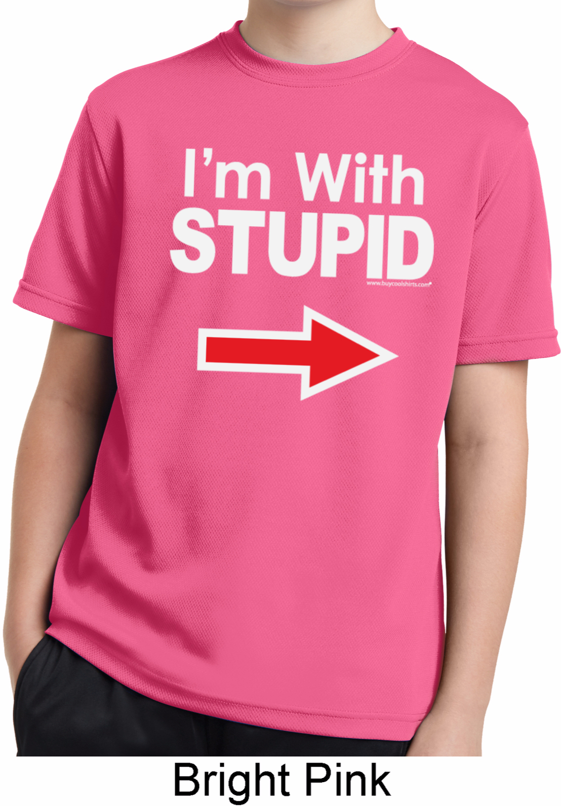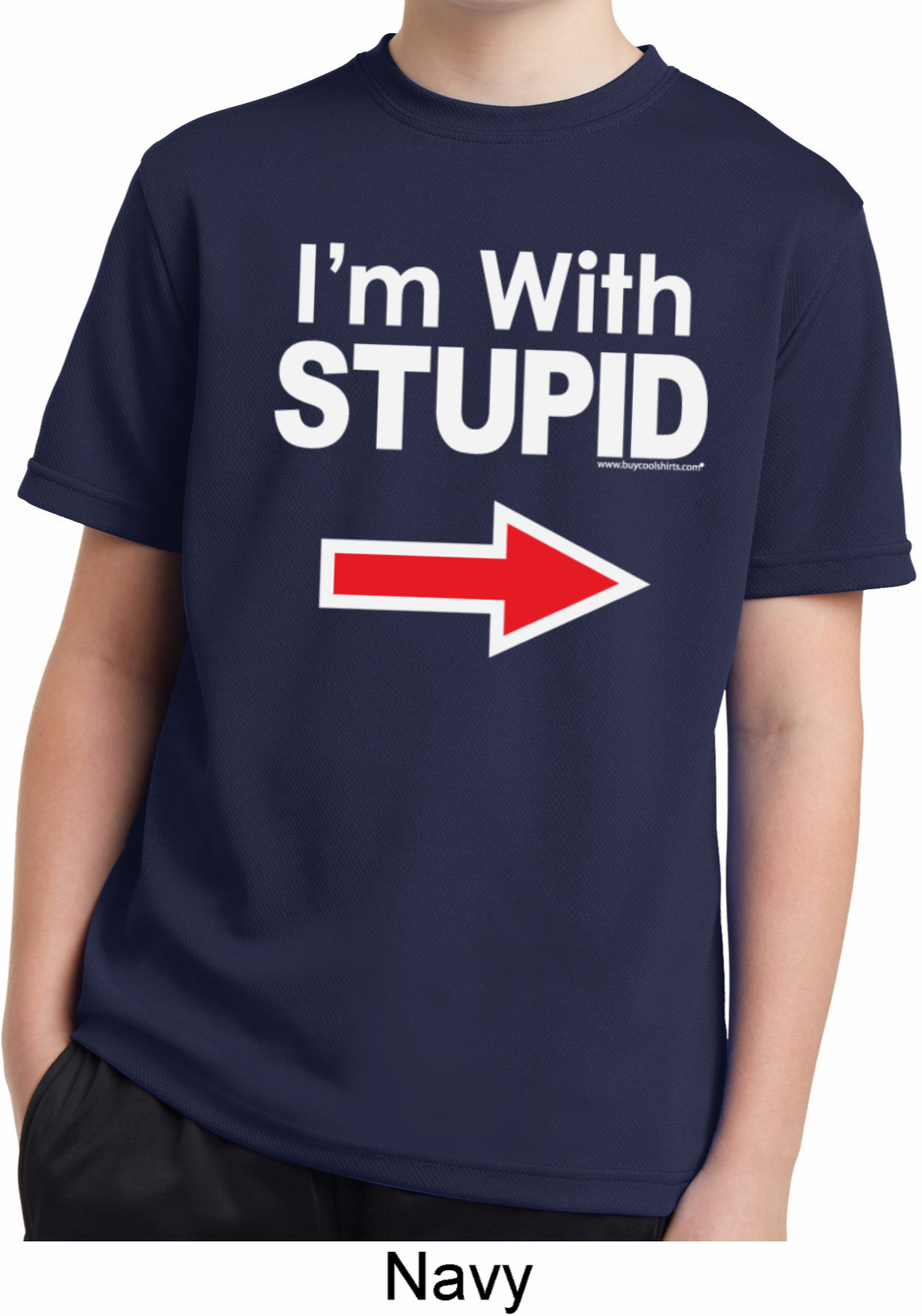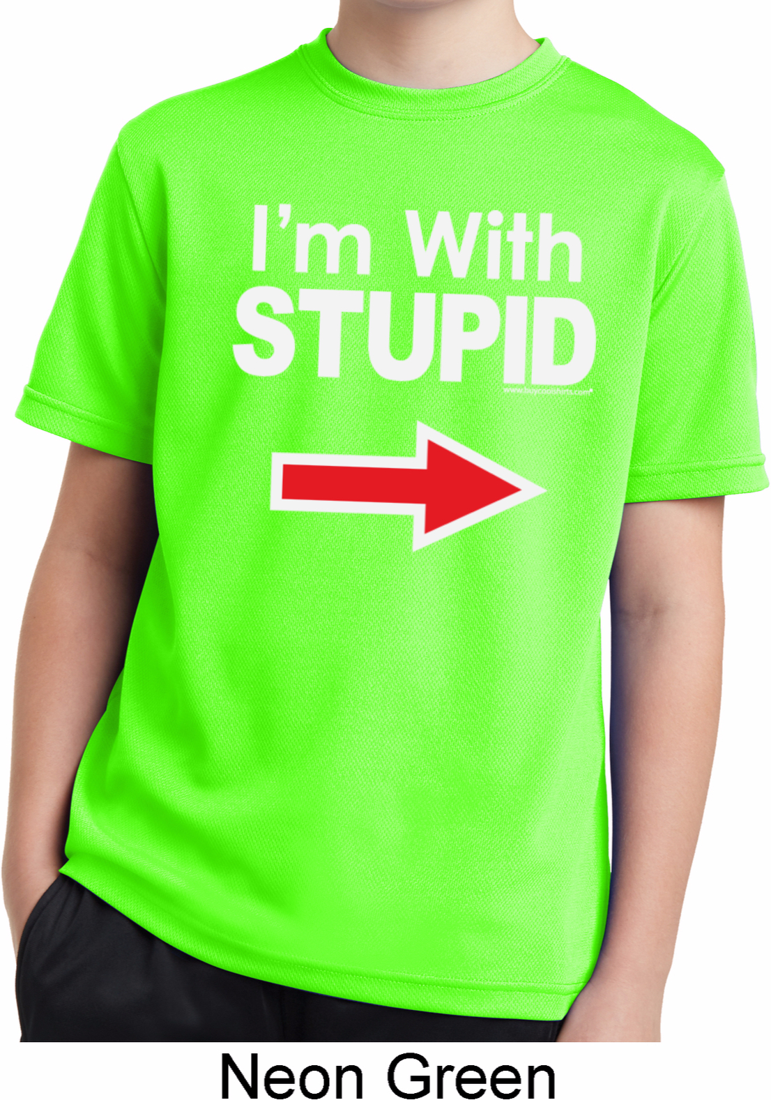 | | I'm With Stupid White Print Kids Moisture Wicking ShirtI'm With Stupid White Print Kids Moisture Wicking Shirt A funny shirt to wear with friends and family 100% Polyester Available in Youth Small, Youth Medium, Youth Large & Youth XL Also available in colors Bright Pink, Forest, Gold, Graphite, Maroon, Navy, Neon Green, Purple, Red, and Royal |