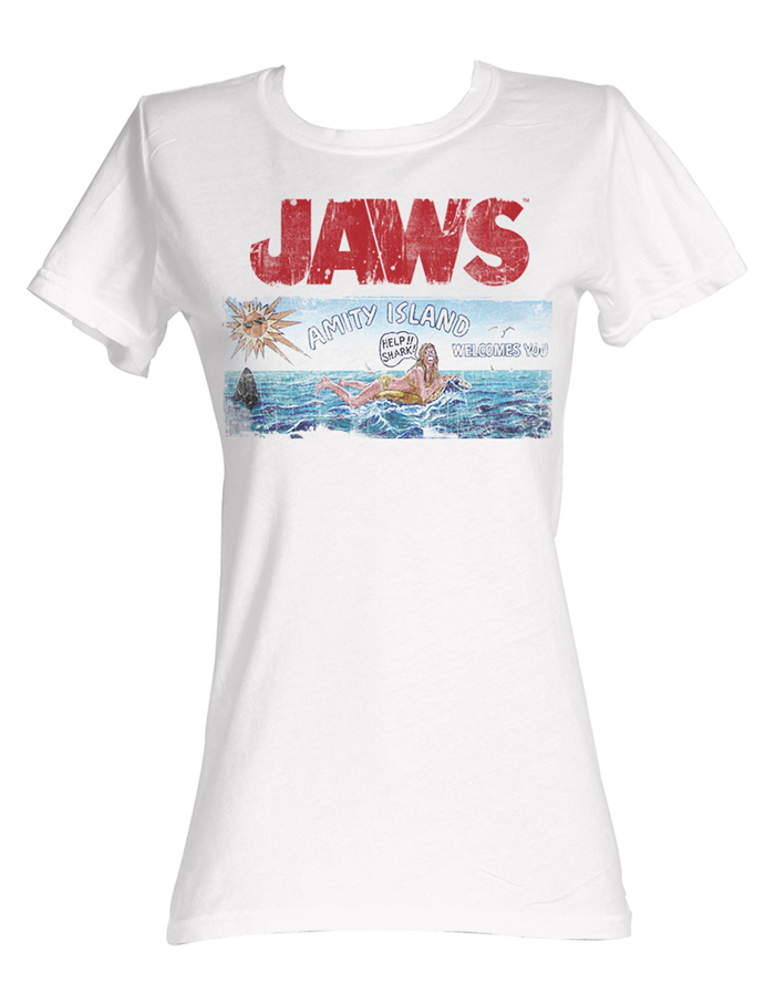 | | Jaws Juniors T-shirt Jaws Island Classic White Tee ShirtThis Jaws Juniors t-shirt features a distressed Jaws logo with Amity Island underneath. Our Jaws T-shirt is a great 100% preshrunk cotton baby doll t-shirt for any Jaws fan. Jaws is an awesome 1975 American Horror Thriller movie that is based on catching the famous great white shark. Available in Small, Medium, Large, XL! Officially Licensed! |