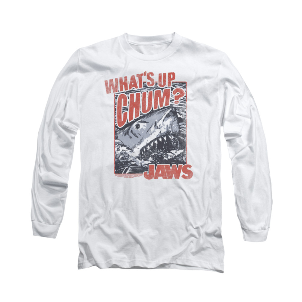 | | Jaws Shirt Block Chum Long Sleeve White Tee T-ShirtJaws Shirt Block Chum Long Sleeve White Tee T-Shirt The classic suspense filled thriller that terrified beach goers and made people wonder, what is below the surface. Officially Licensed Available in Small, Medium, Large, XL, 2XL ![]() |
