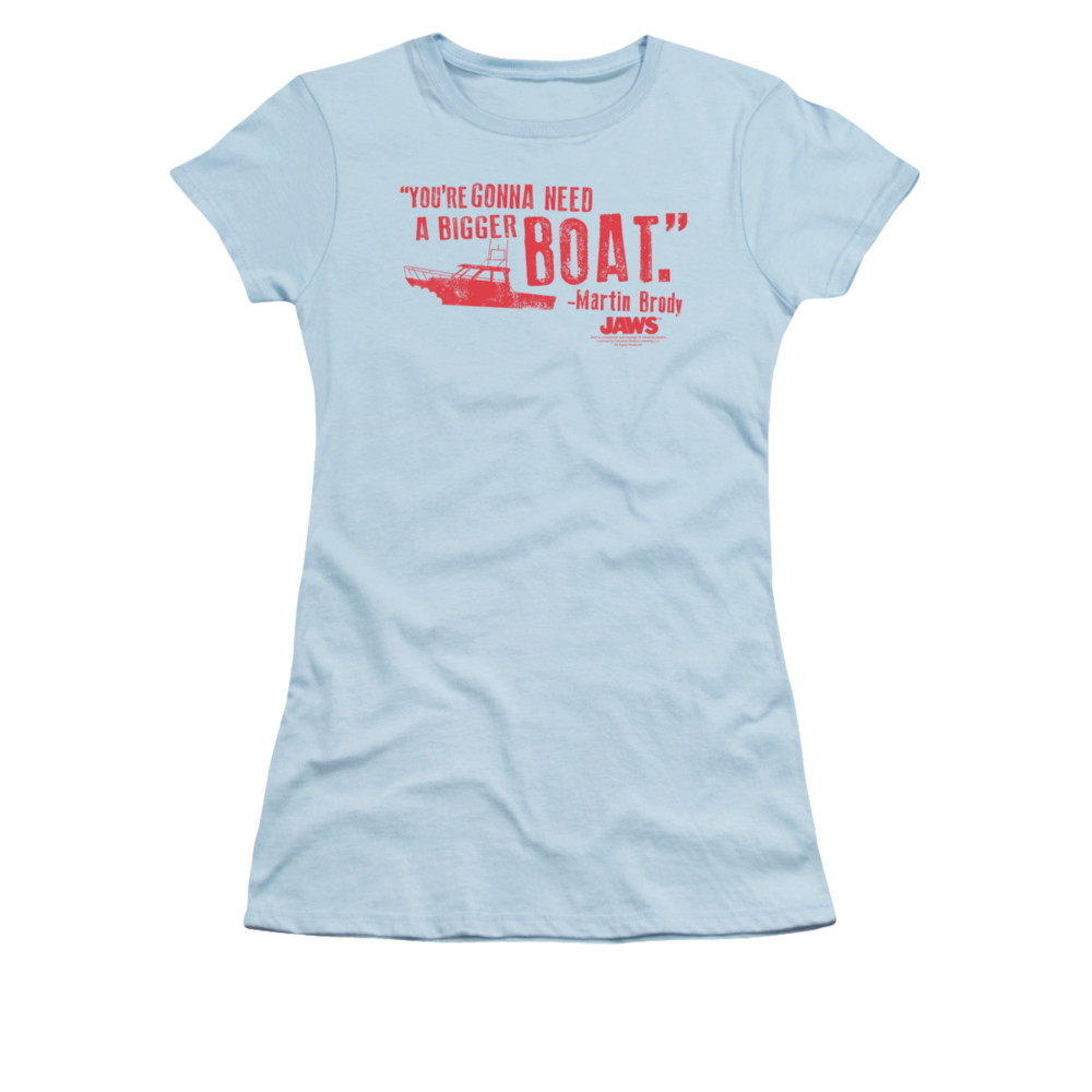 | | Jaws Shirt Juniors Bigger Boat Light Blue T-ShirtJaws Shirt Juniors Bigger Boat Light Blue T-Shirt The classic suspense filled thriller that terrified beach goers and made people wonder, what is below the surface. Officially Licensed Available in Small, Medium, Large, XL, 2XL ![]() |
