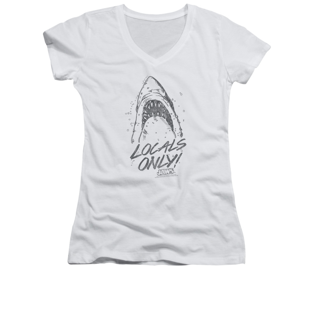 | | Jaws Shirt Juniors V Neck Locals Only White T-ShirtJaws Shirt Juniors V Neck Locals Only White T-Shirt The classic suspense filled thriller that terrified beach goers and made people wonder, what is below the surface. Officially Licensed Available in Small, Medium, Large, XL & 2XL ![]() |