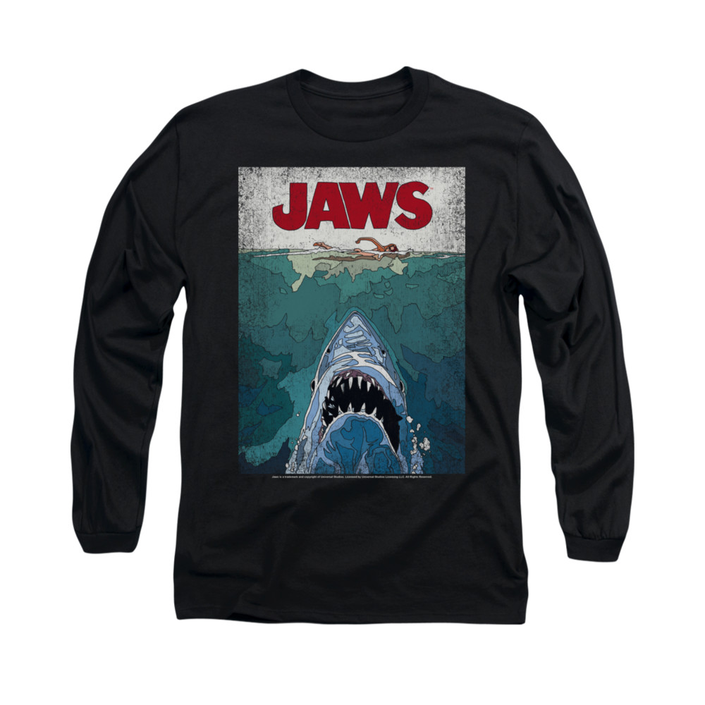| | Jaws Shirt Lined Poster Long Sleeve Black Tee T-ShirtJaws Shirt Lined Poster Long Sleeve Black Tee T-Shirt The classic suspense filled thriller that terrified beach goers and made people wonder, what is below the surface. Officially Licensed Available in Small, Medium, Large, XL, 2XL ![]() |