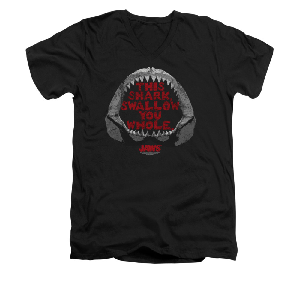 | | Jaws Shirt Slim Fit V-Neck This Shark Black T-ShirtJaws Shirt Slim Fit V-Neck This Shark Black T-Shirt The classic suspense filled thriller that terrified beach goers and made people wonder, what is below the surface. Officially Licensed Available in Small, Medium, Large, XL, 2XL ![]() |