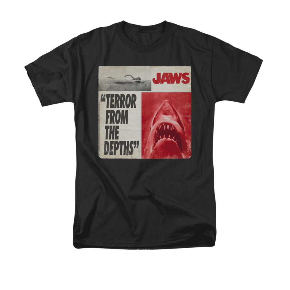 | | Jaws Shirt Terror Black T-ShirtJaws Shirt Terror Black T-Shirt The classic suspense filled thriller that terrified beach goers and made people wonder, what is below the surface. Officially Licensed Available in Small, Medium, Large, XL, 2XL, 3XL, 4XL, & 5XL ![]() |